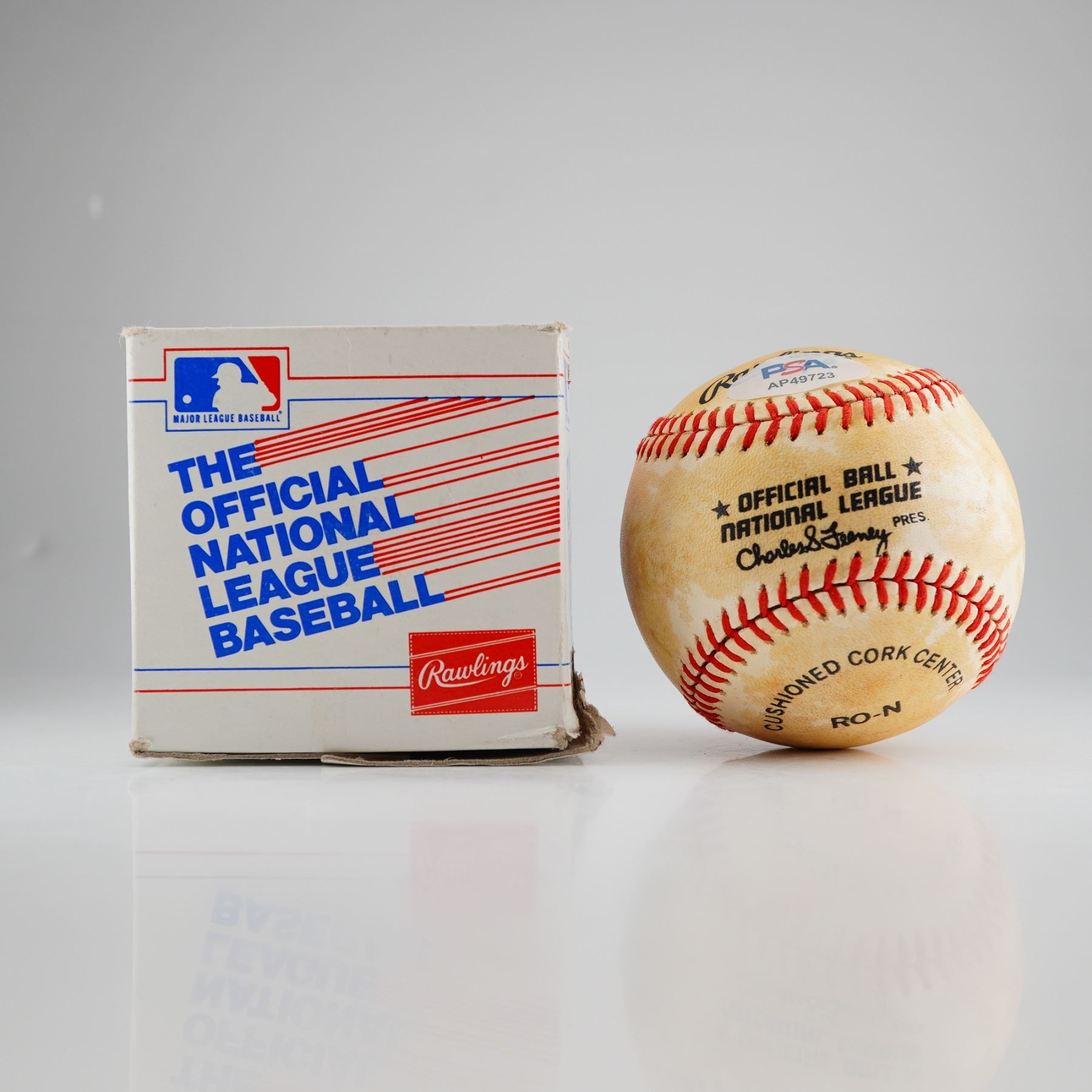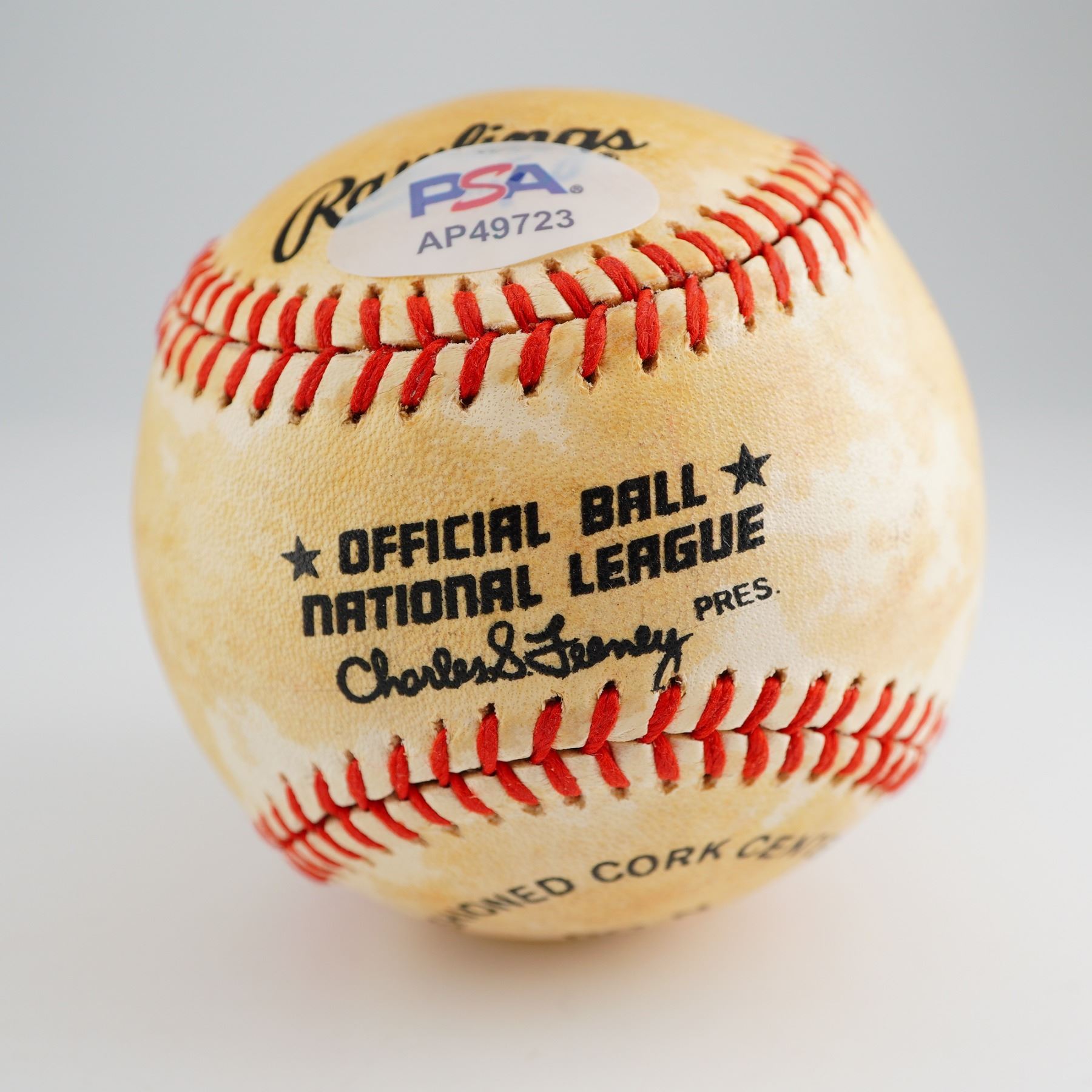 This professionally cataloged autographed baseball features the signature of legendary Major League Baseball executive and Hall of Fame inductee Bill Veeck. The signature is hand-signed in blue ink on the sweet spot of a Rawlings Official National League baseball. This specific ball features the stamped signature of Charles S. Feeney, who served as the President of the National League from 1970 to 1986, dating the item to this significant era of baseball history. Bill Veeck (1914"1986) was a pioneering figure in the sport, known for his tenure as owner of the Cleveland Indians, St. Louis Browns, and Chicago White Sox. He is most famously remembered for breaking the American League color barrier by signing Larry Doby and for his innovative promotional stunts. The item is authenticated by PSA and carries certificate number AP49723. It is accompanied by an original period-correct Rawlings "The Official National League Baseball" box.