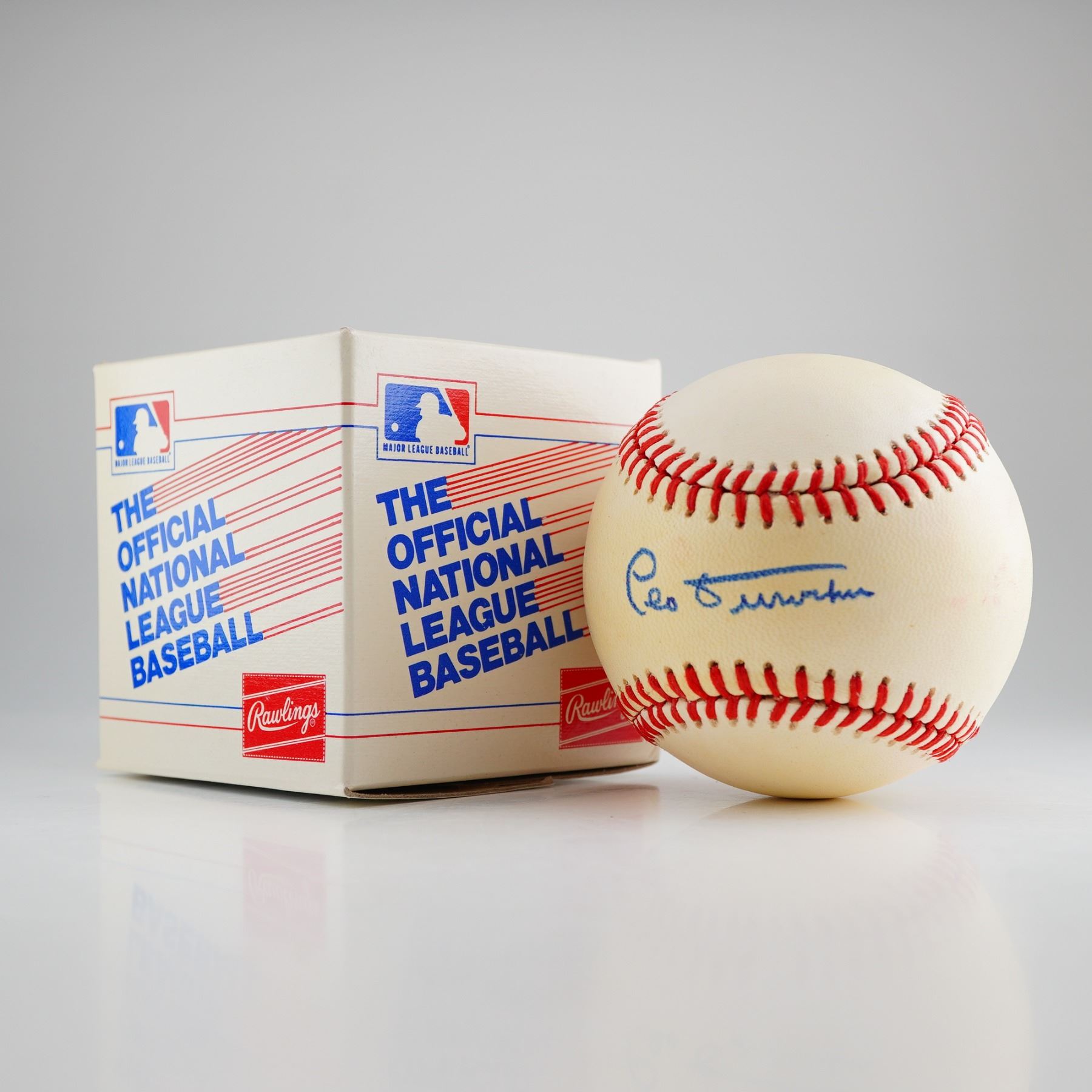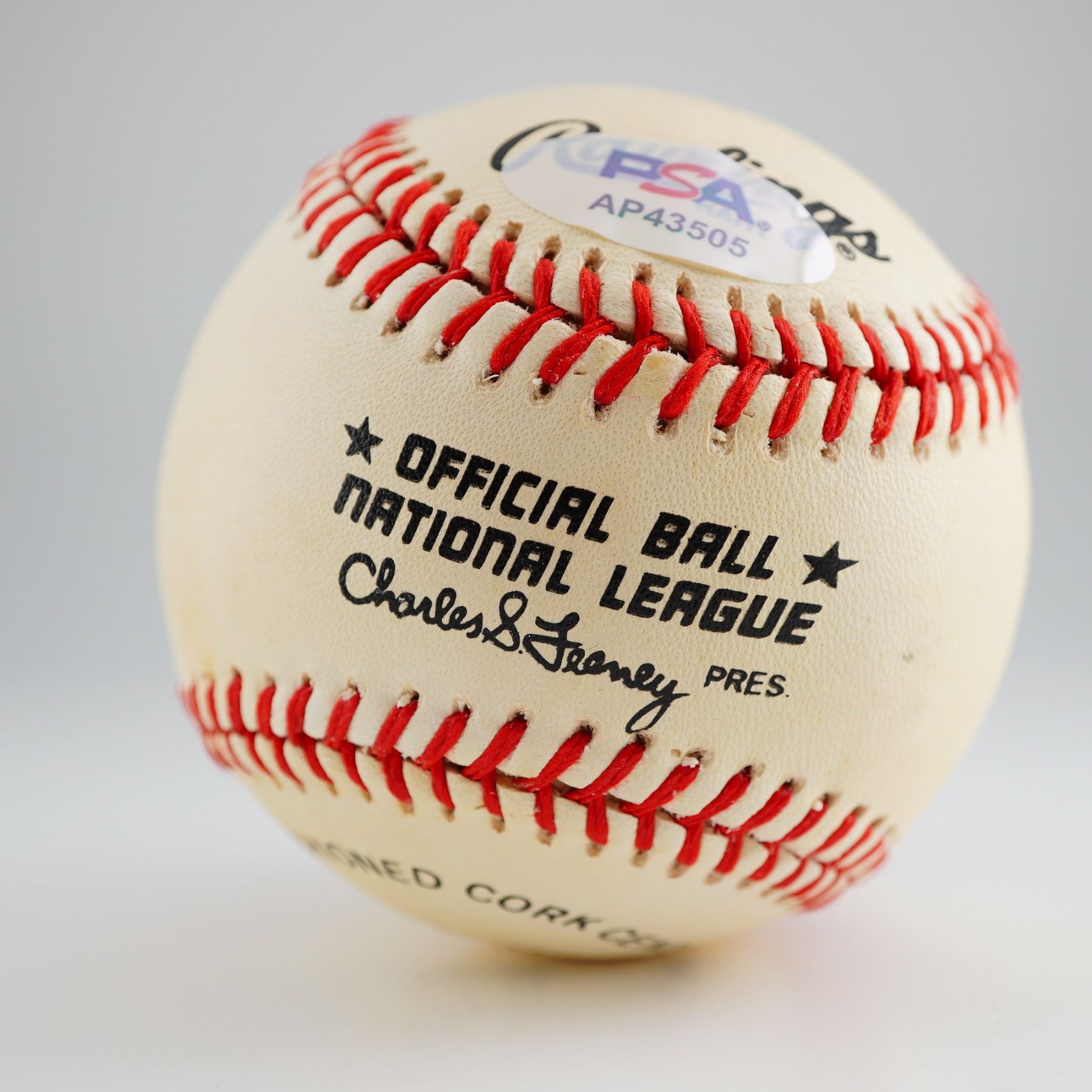 This professional auction lot features an Official National League (ONL) baseball manufactured by Rawlings, signed by Baseball Hall of Fame manager and player Leo Durocher (Class of 1994). Durocher, a legendary figure associated with the Chicago Cubs, Brooklyn Dodgers, and New York Giants, has placed a bold signature in blue ink directly on the sweet spot of the ball. The baseball is a period-correct Charles S. Feeney era production (National League President, 1970"1986), as indicated by the facsimile signature on the panel. This collectible is PSA/DNA authenticated and carries a certification sticker (Cert #AP43505) for permanent identification. The item is accompanied by its original Rawlings "The Official National League Baseball" retail box, providing excellent provenance for the serious sports memorabilia collector.