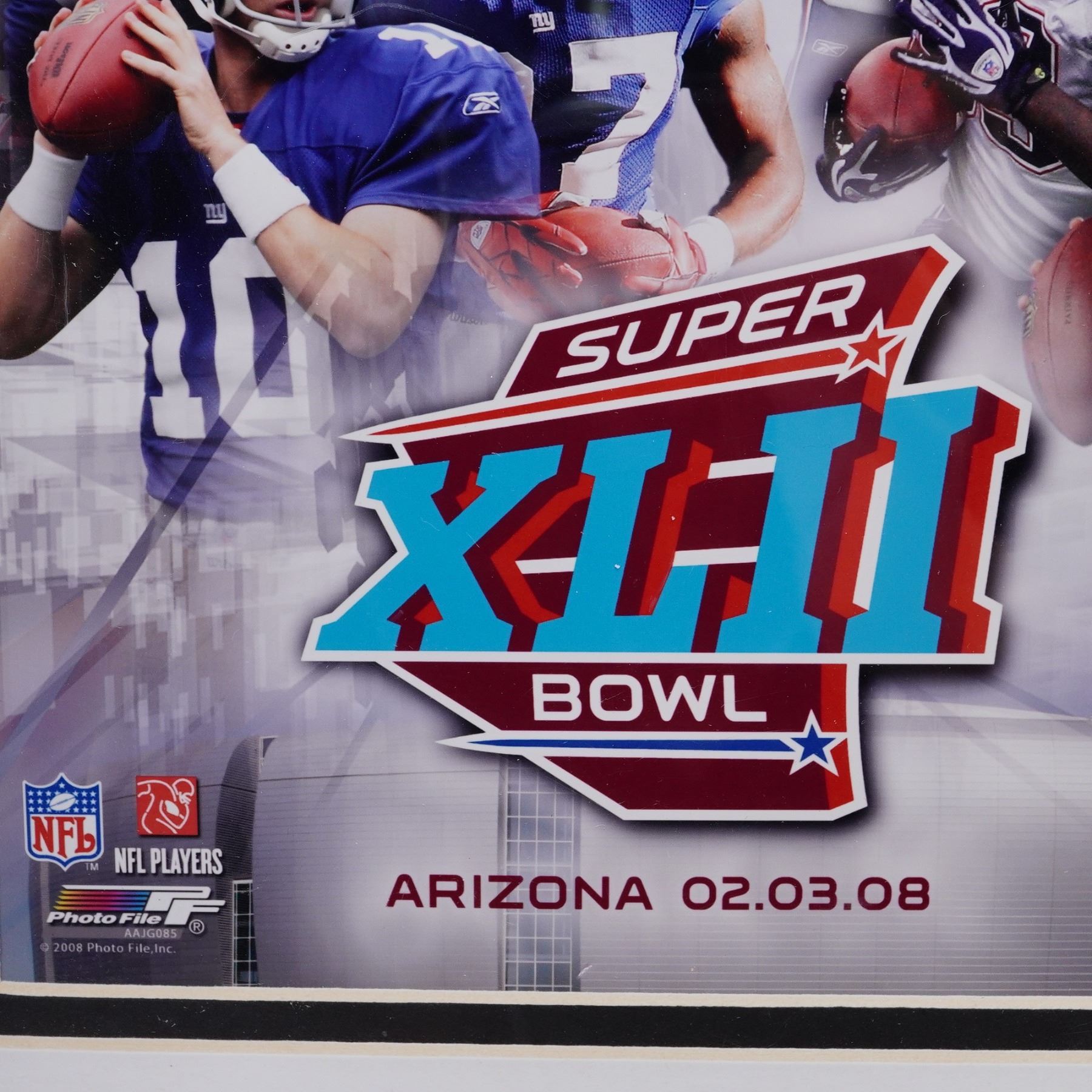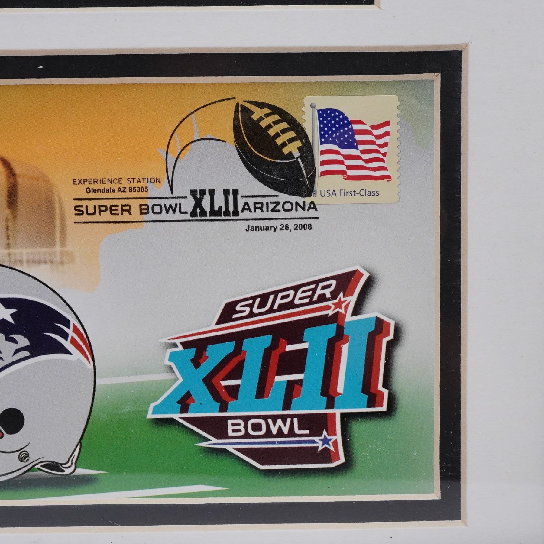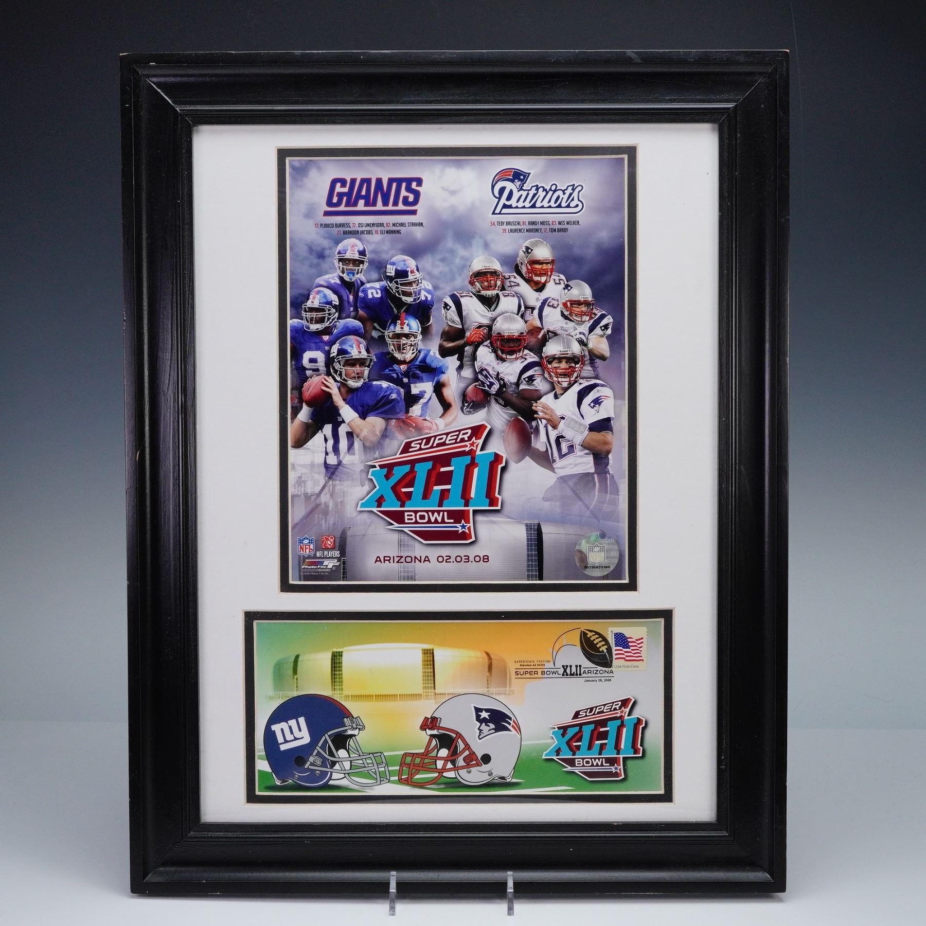 Featuring the match up between the New York Giants and the New England Patriots. The display includes a photo collage with team players, a commemorative ticket-style insert showcasing team helmets, the official Super Bowl XLII logo, and a USA First-Class stamp with cancellation marking dated January 26, 2008. Presented in a black matted frame with official NFL and NFL Players licensing.