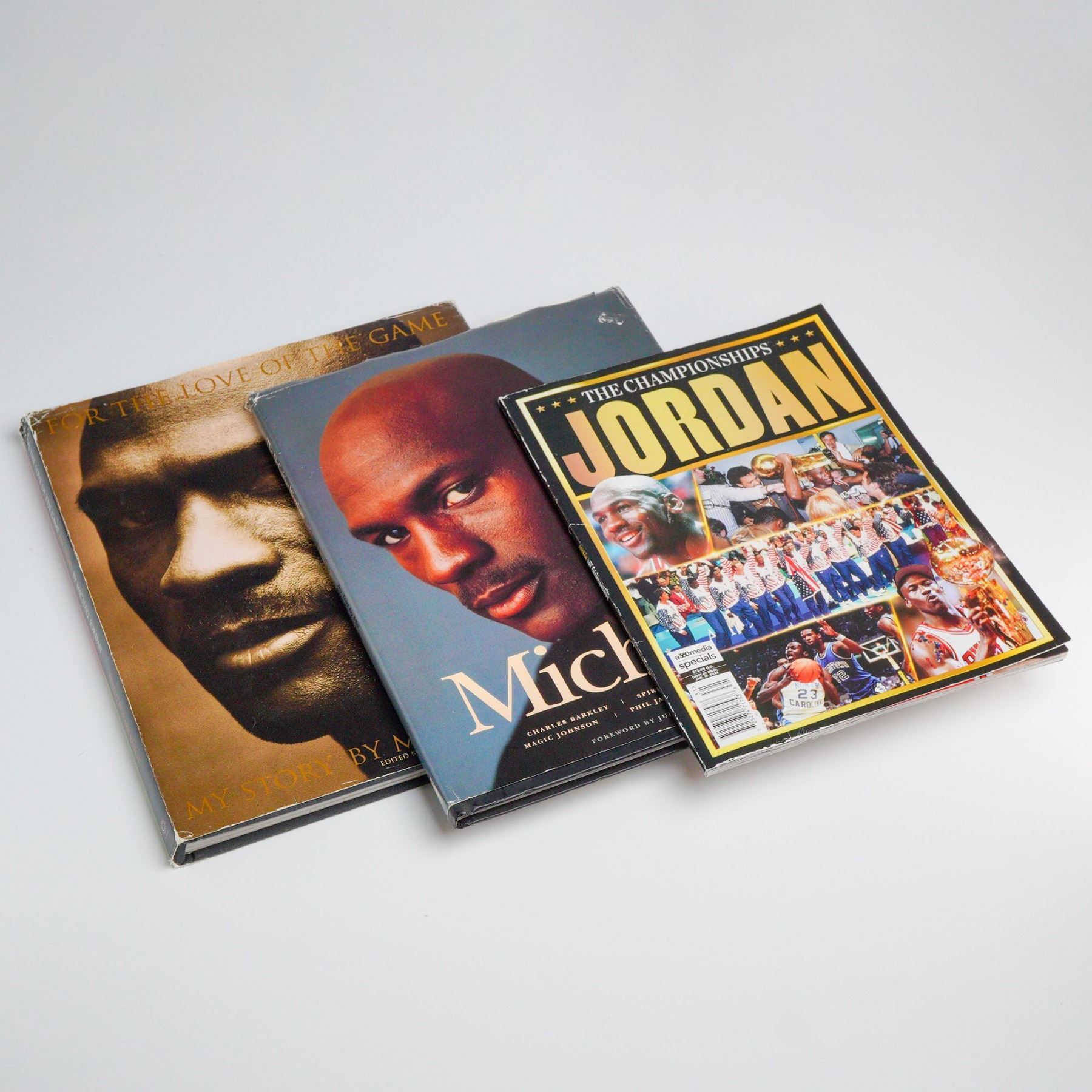 This lot features three publications focused on the career of Michael Jordan. The collection includes two hardcover books and one magazine. The first book is titled For the Love of the Game: My Story by Michael Jordan. The second is titled The Definitive Word on Michael Jordan by Charles Barkley. The third item is an a360media special edition magazine titled Jordan: The Championships. Each publication is constructed with glossy paper covers and contains full-color interior photography and text documenting NBA statistics and career highlights. Measurement is for whole collection.