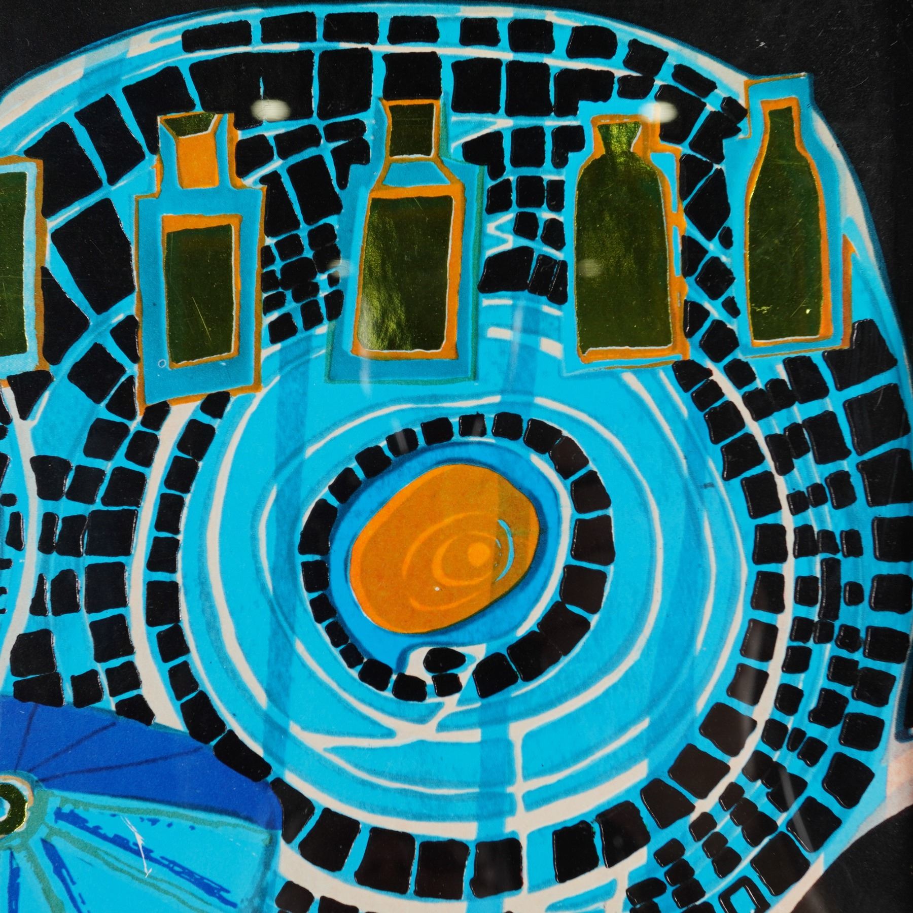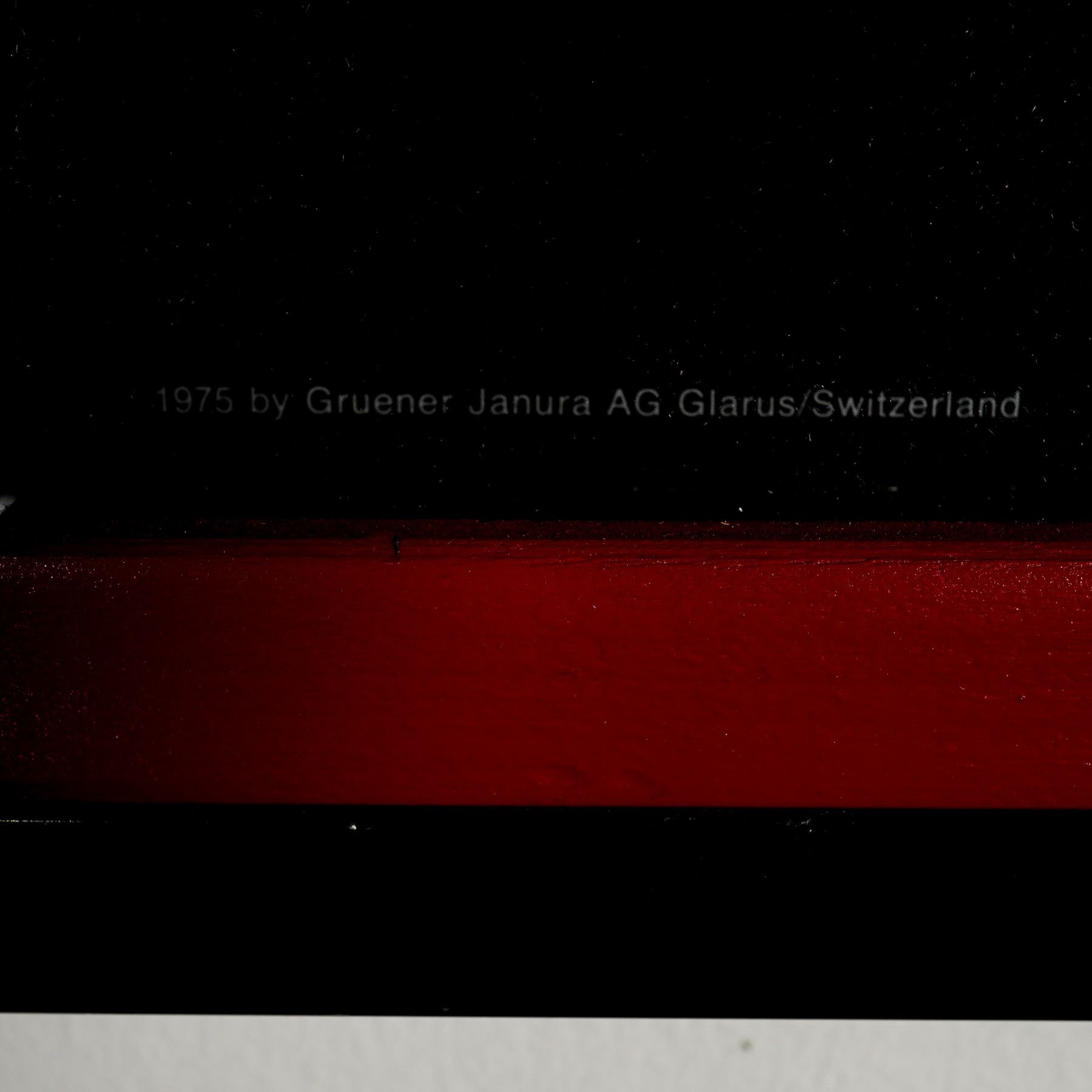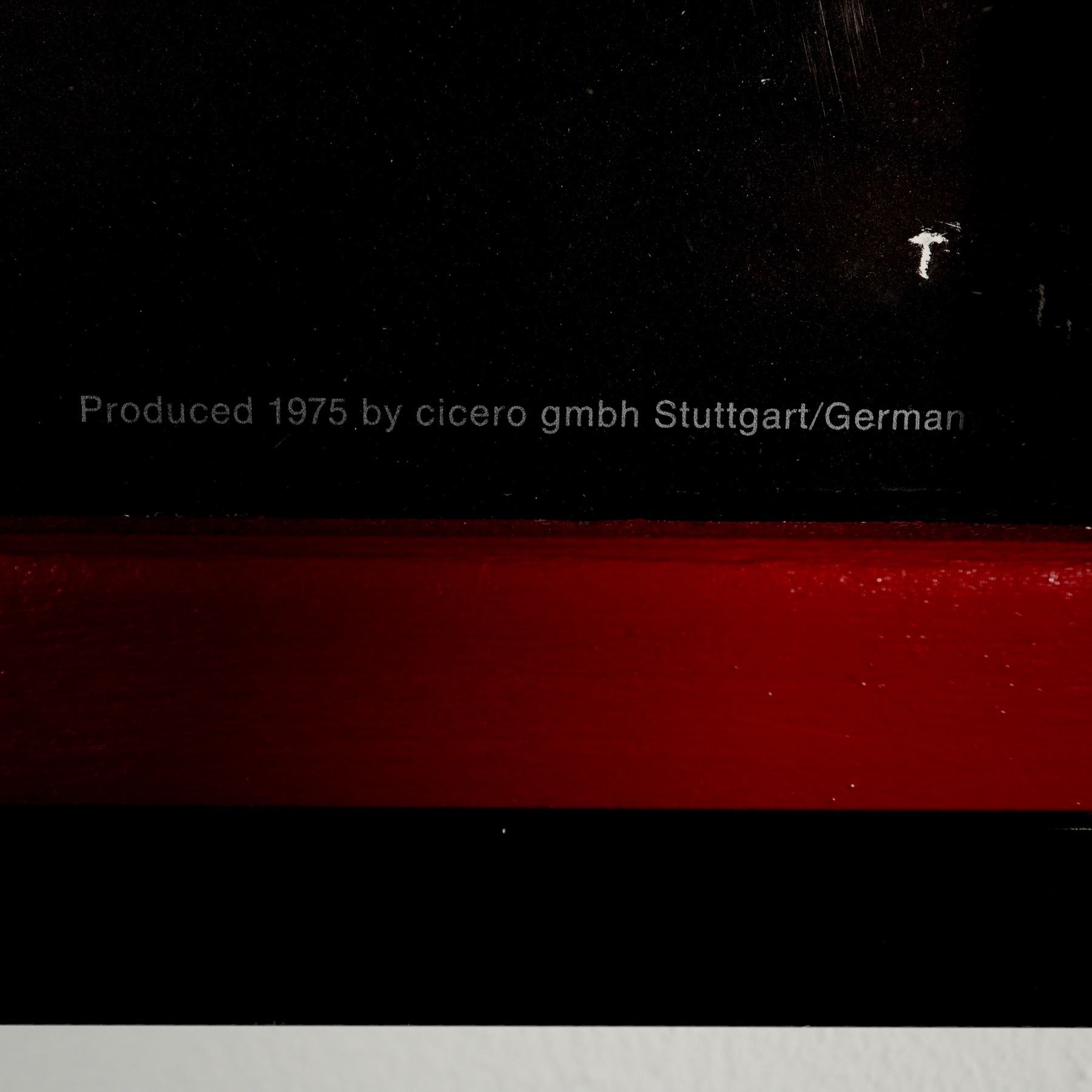 A framed color poster by Friedensreich Hundertwasser (Austrian, 1928-2000) for the World Tour (Welttournee) exhibition, dated 1975. The composition features the artist name in stylized white lettering across a black ground. The upper portion contains blue, yellow, and green circular and rectangular motifs, including bottle-like forms with metallic accents. The lower section is dominated by a large multicolored spiral in blue, peach, and black with integrated metallic elements. The work is inscribed at the lower left 1975 by Gruener Janura AG Glarus/Switzerland and at the lower right Produced 1975 by cicero gmbh Stuttgart/Germany. The piece is presented in a black wooden frame with a red inner border.