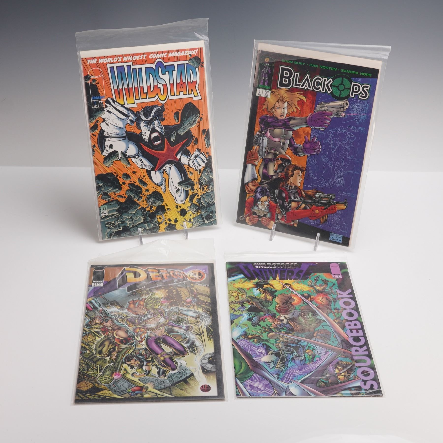 Including titles from the early 1990s independent publisher known for bold artwork and original characters. The lot features Prophet, centered on a genetically enhanced super-soldier; Strikeback, with themes of patriotism and team battles; Wildstar, following a man bonded with an alien symbiote; and Black Ops, focused on a covert team of operatives. Also included are Defcon 4, a futuristic action series; Extreme Super Christmas Special, a holiday-themed issue with characters from the Extreme Studios universe; Youngblood, a pioneering superhero team book; Vogue, spotlighting a Russian-born supermodel turned heroine; Team 7: Objective Hell, telling the backstory of elite soldiers; and Image Universe Sourcebook, a reference guide to interconnected characters and story lines.