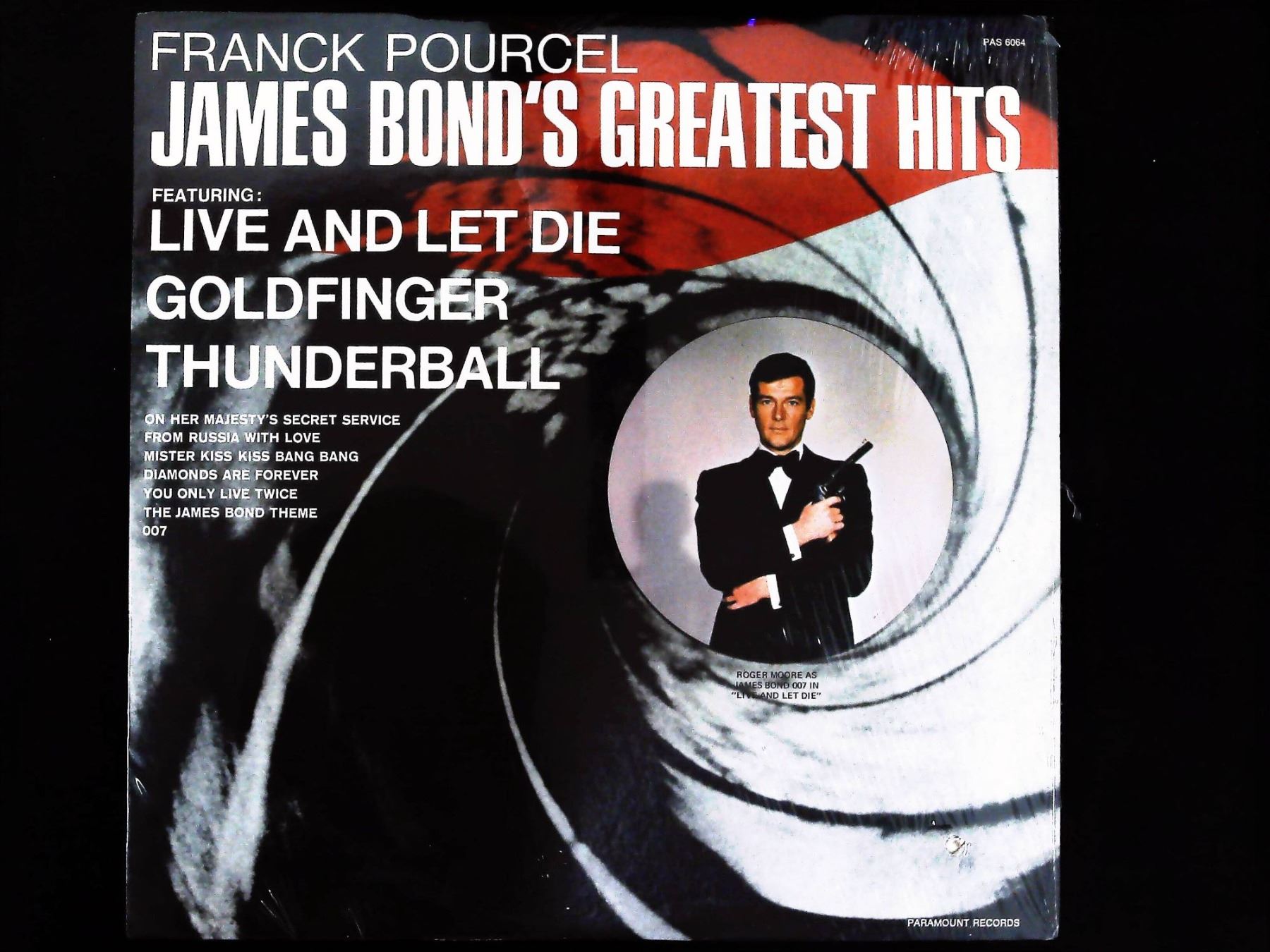 A vintage vinyl LP album sleeve for the record Franck Pourcel: James Bond's Greatest Hits. The album, catalog number PAS 6004, was released on Paramount Records, likely dating to 1973 based on web research. The front cover features a striking design incorporating the classic James Bond gun barrel sequence, framing a photograph of Roger Moore in a tuxedo, identified as 'Roger Moore as James Bond in Live and Let Die'. The sleeve lists 12 featured instrumental tracks, including "Live and Let Die," "Goldfinger," and "Thunderball." The reverse of the sleeve provides the full 12-track listing, running times, corresponding film sources, and extensive liner notes detailing the album's production context. Dimensions: 12.5" x 12.5"