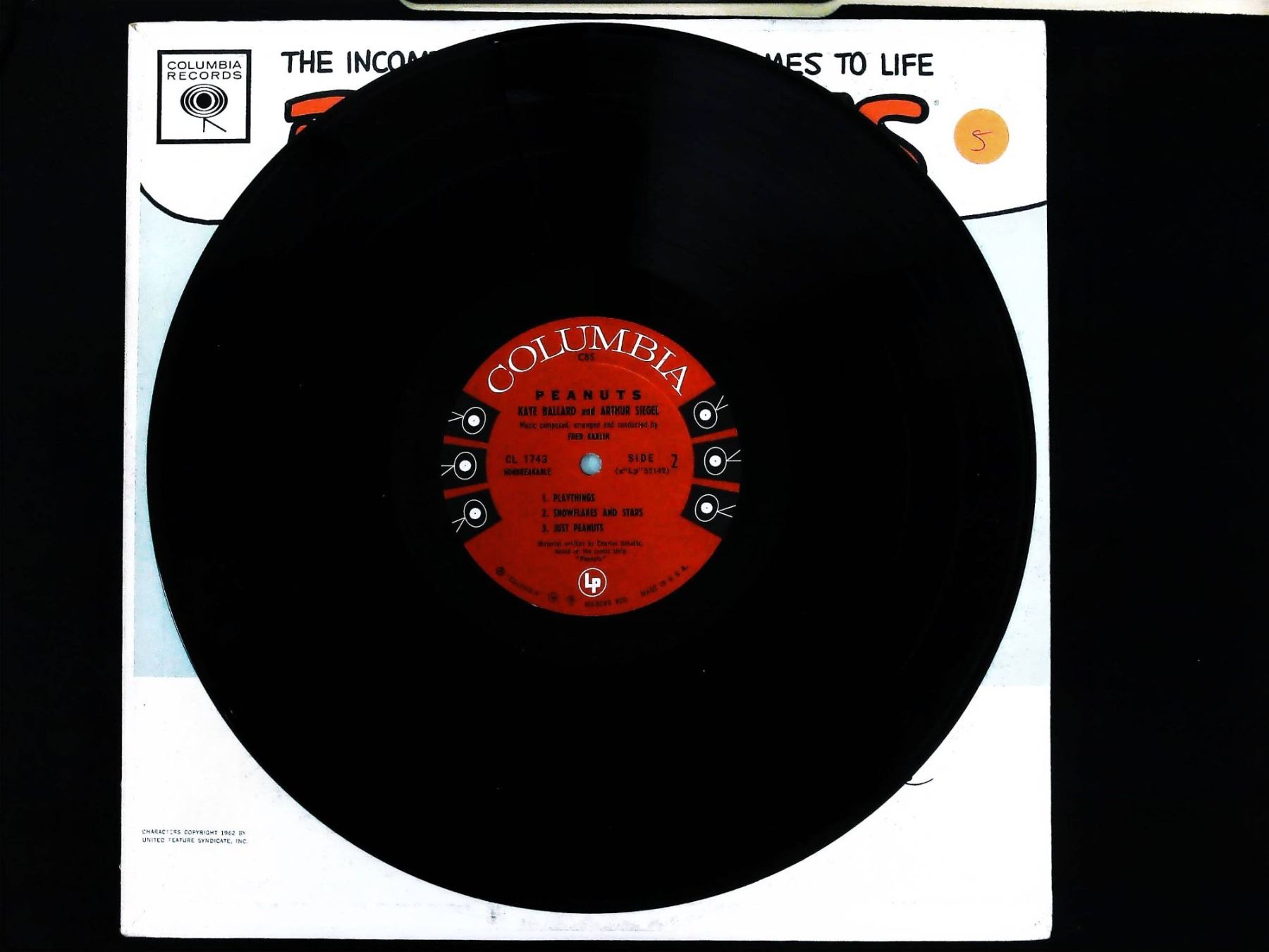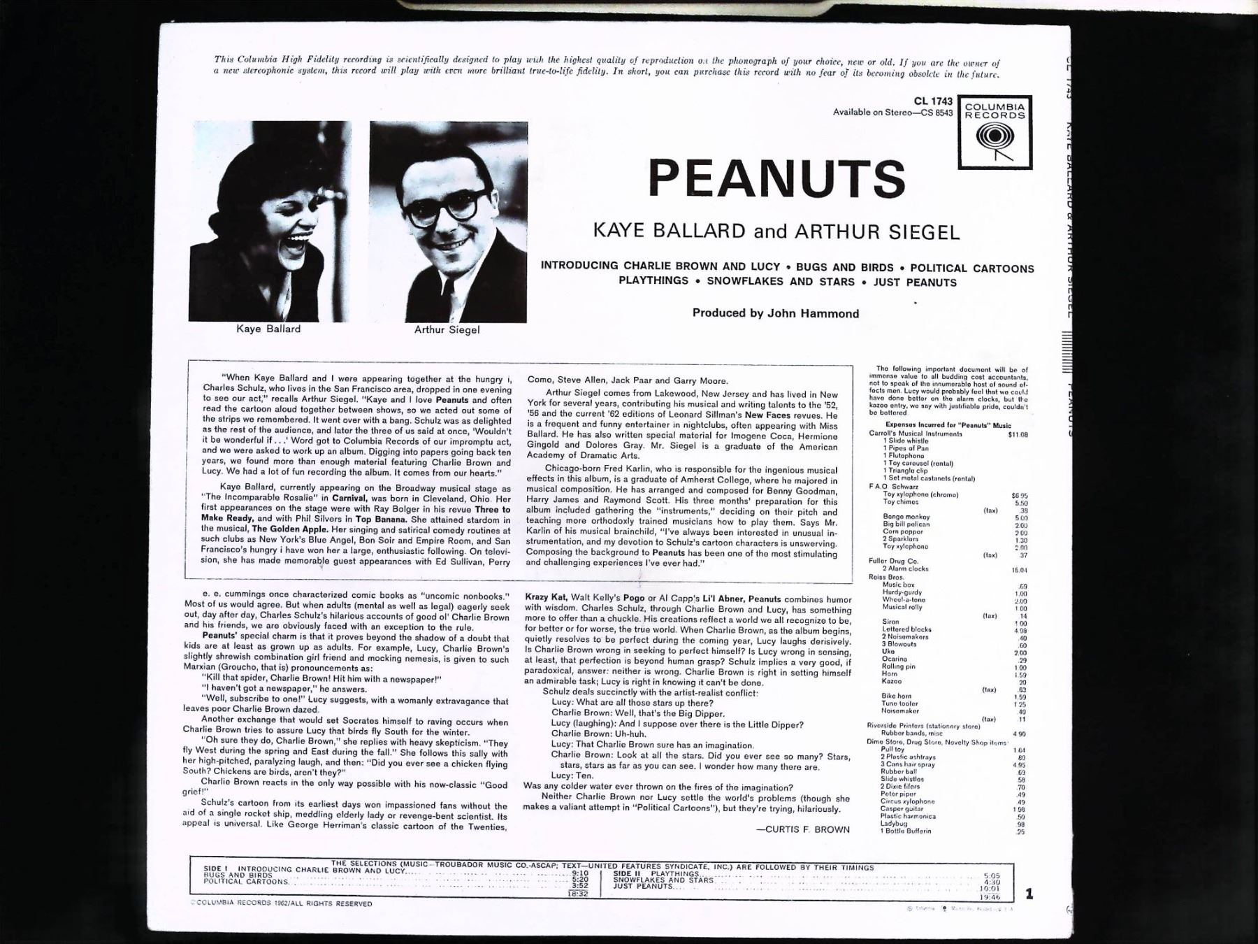 This 1962 vinyl LP record, titled Peanuts and frequently identified by the phrase Good Grief Charlie Brown, features performers Kaye Ballard and Arthur Siegel. Released by Columbia Records under catalog number CL 1743, the record in original album cover includes a black vinyl disc with a red and white Columbia label and a cardstock sleeve. The front cover displays Charles Schulz illustrations of the characters Lucy and Charlie Brown. The reverse side of the sleeve contains liner notes by Curtis F. Brown, photographs of the performers, and a track listing including titles such as Introducing Charlie Brown and Lucy, Playthings, and Just Peanuts. The album was produced by John Hammond and features music composed and conducted by Fred Karlin.