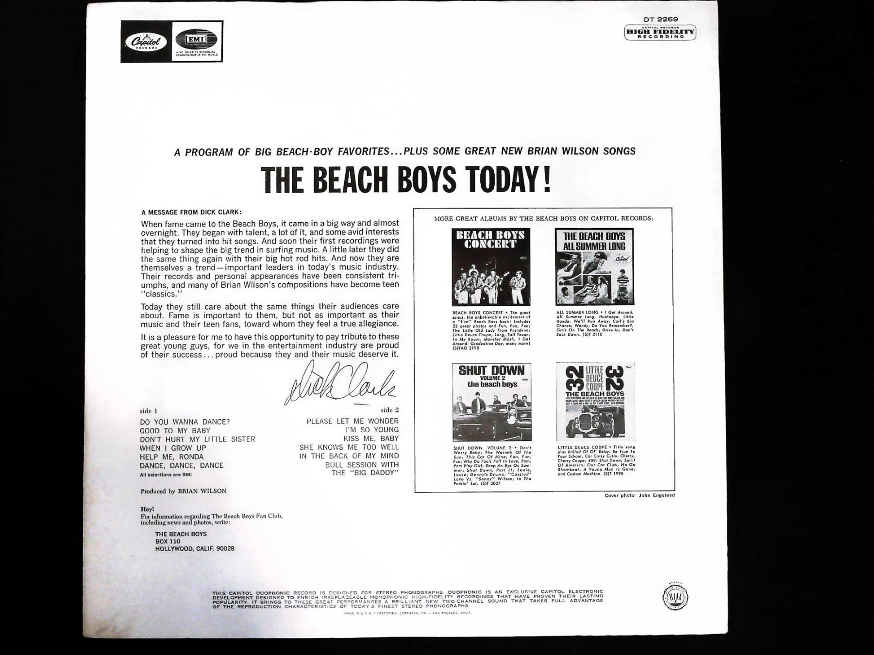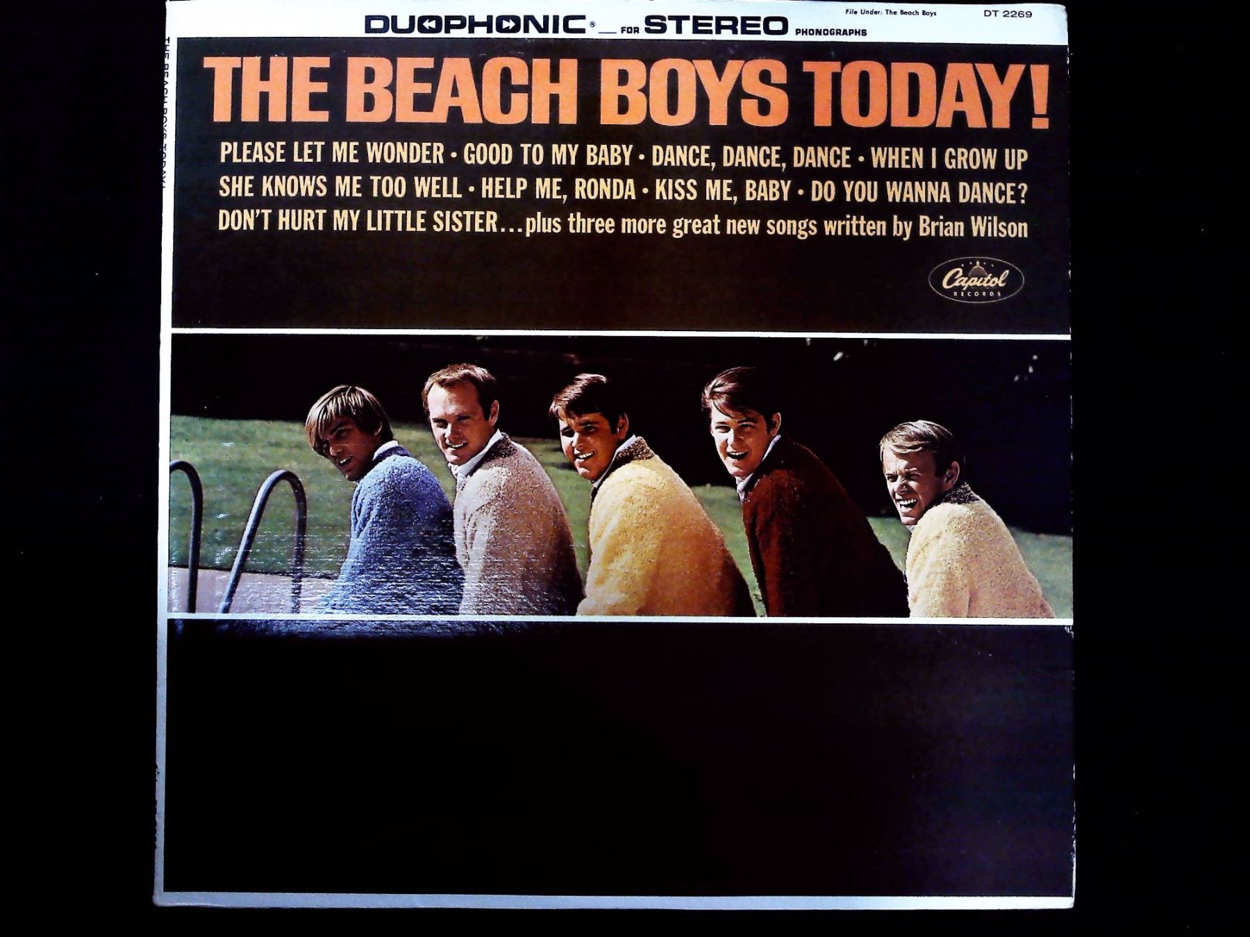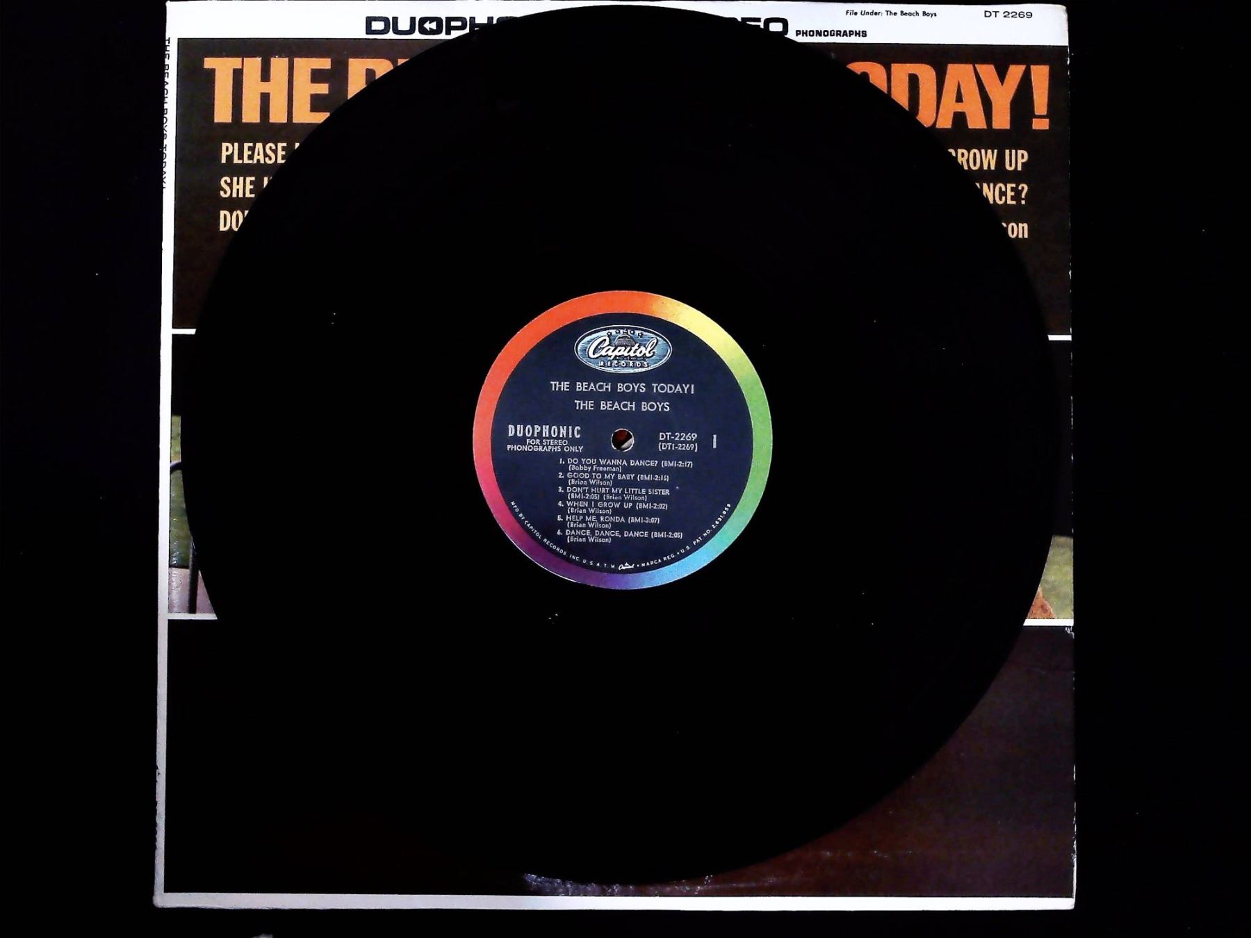 A vintage 12-inch vinyl Long Play (LP) album by the American rock band The Beach Boys, titled The Beach Boys Today!. This specific pressing is identified as a Duophonic (simulated stereo) version intended for stereo phonographs, released by Capitol Records under catalog number DT 2269. Web intelligence confirms this pressing dates to approximately 1965. The album features a black vinyl disc with the multicolored Capitol label. The printed cardboard sleeve displays a photograph of the five band members on the front, along with a track list including "Help Me, Ronda," "Dance, Dance, Dance," and "When I Grow Up (To Be a Man)". The reverse side includes liner notes attributed to Dick Clark and confirms production by Brian Wilson. Dimensions: 12.5" x 12.5"