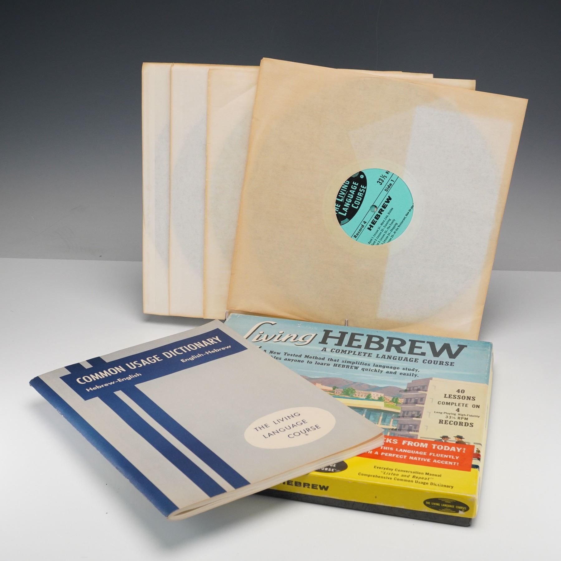 This collection includes five vinyl records: a 4-piece Living Hebrew Language Course set of 33 1/3 RPM records, Back from Israel, Tov Lanu Lashir, None Shall Make Them Afraid, and We Were As Dreamers. A unique mix of educational material and cultural recordings, perfect for language learners and collectors. These records are in their original covers.