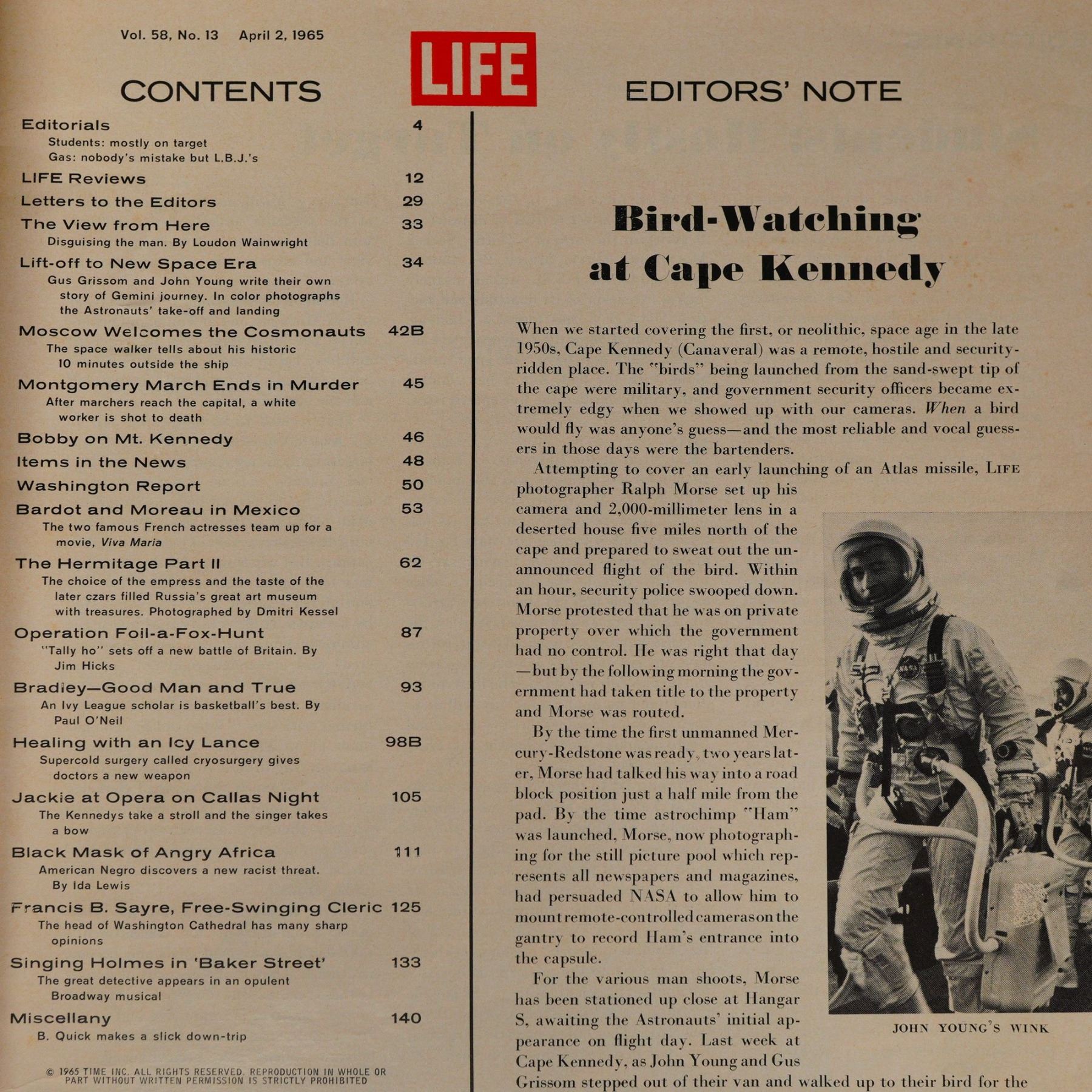 LIFE Magazine. The Astronauts' Own Story: Gemini's Journey. New York: TIME INC., April 2, 1965. Original printing of Vol. 58, No. 13. Binding is softcover paper wrappers, saddle-stitched (stapled), in a quarto format. The magazine is profusely illustrated with color and black-and-white photographs, featuring the cover story The Astronauts' Own Story GEMINI'S JOURNEY by Gus Grissom and John Young, detailing the Gemini space mission and recovery. The cover image shows the capsule recovery at sea. Other features include LIFT-OFF TO A NEW ERA IN SPACE and Hoist in Long Johns, Welcome in Robes. The magazine is complete, containing the full contents including the article Montgomery Clift Ends in Murder. Copyright statement reads 1965 TIME INC. ALL RIGHTS RESERVED. No dust jacket applicable. No signatures or inscriptions present.