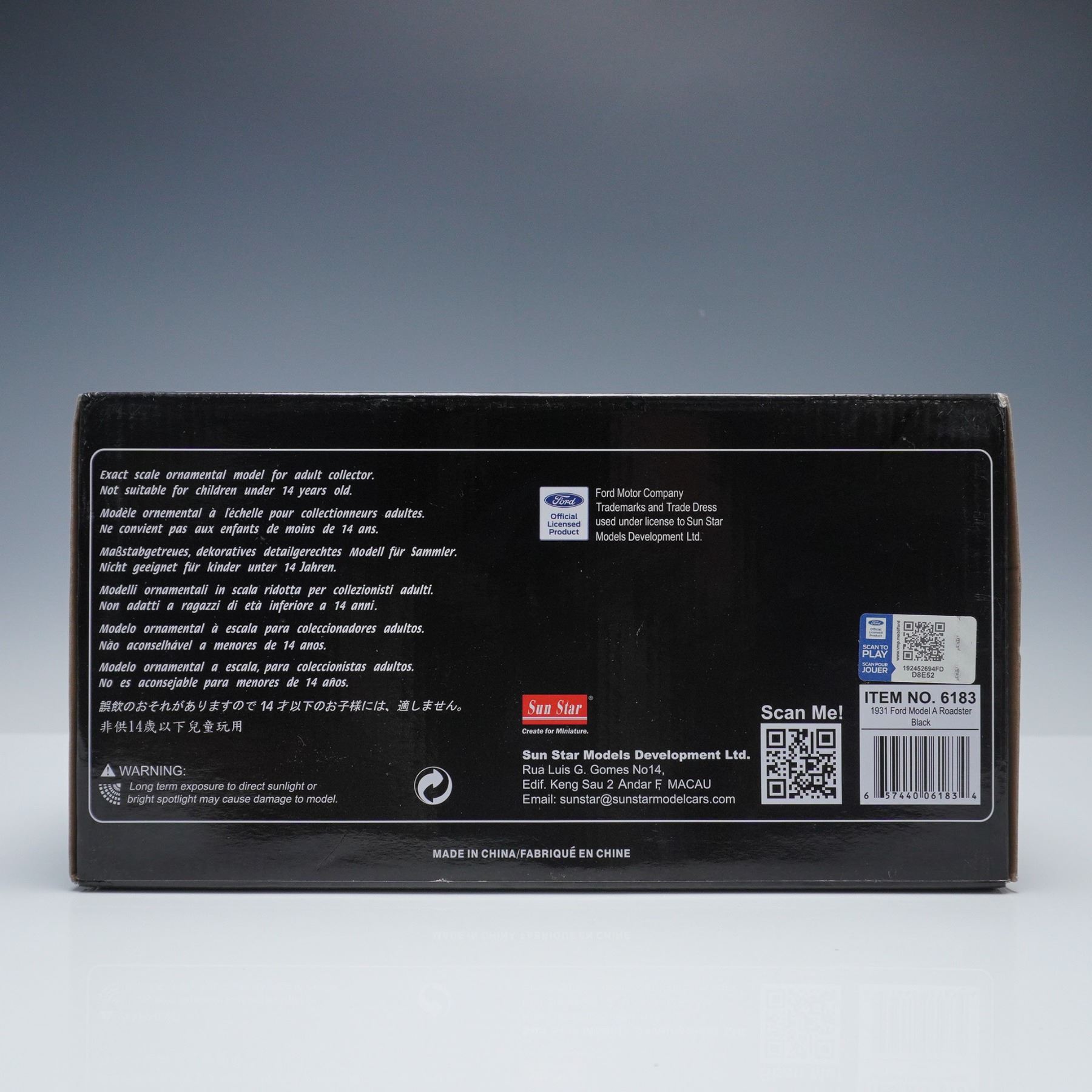 Highly detailed 1:18 scale die-cast model of the 1931 Ford Model A Roadster by Sun Star Models Development Ltd. Features include an accurate vintage body style with chrome accents, whitewall wheels, and a convertible top. Part of the "Ford Classic Collectibles" series, this model is presented in its original packaging with clear display window.