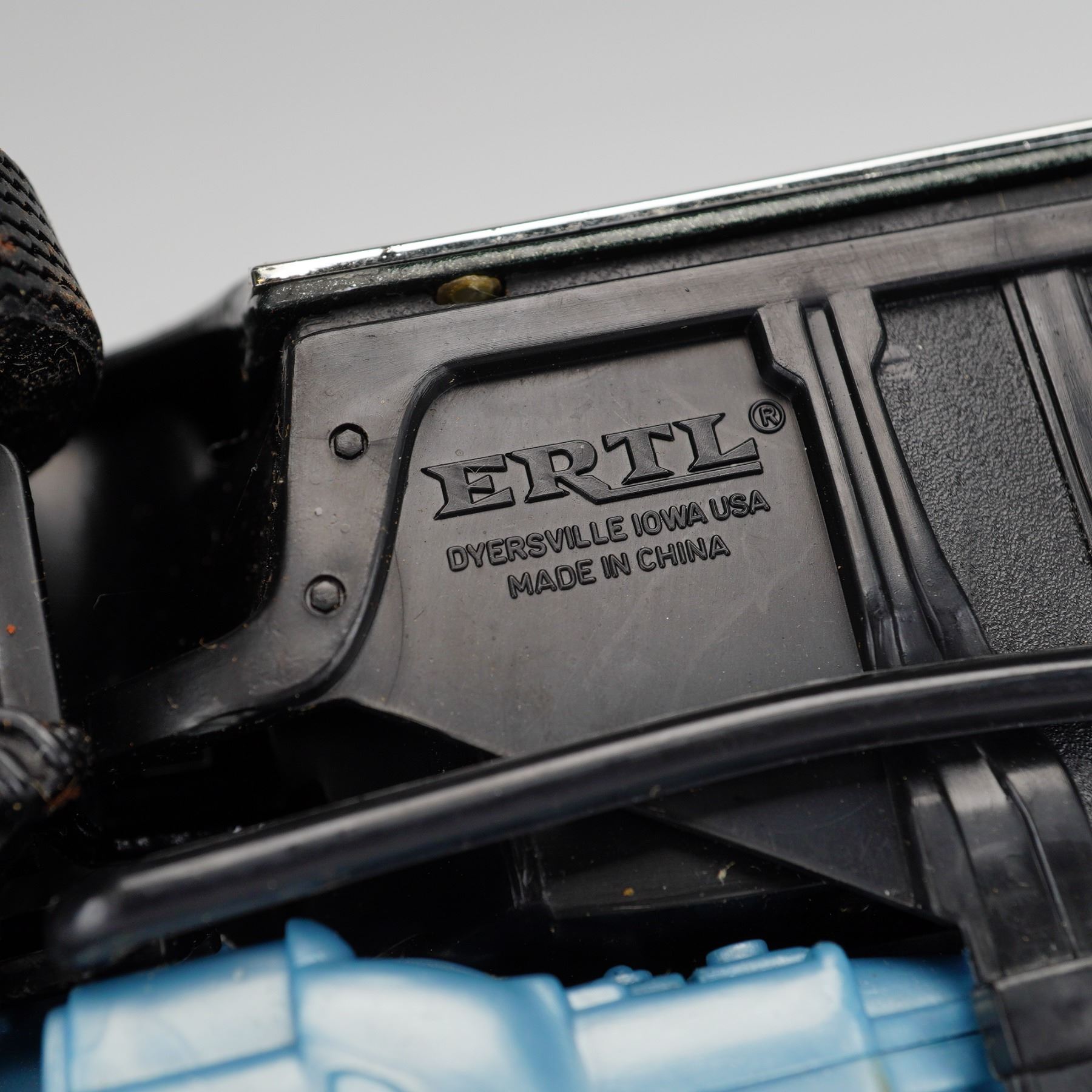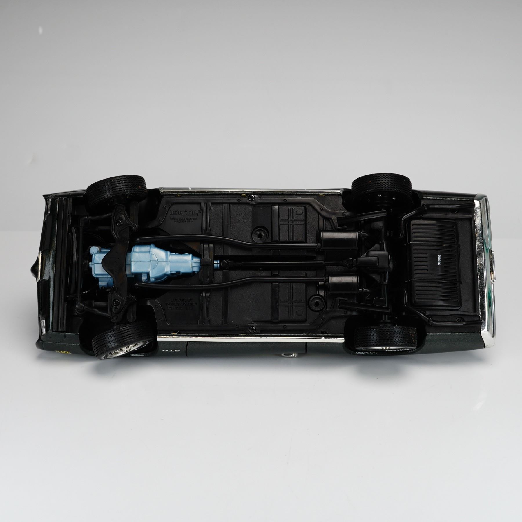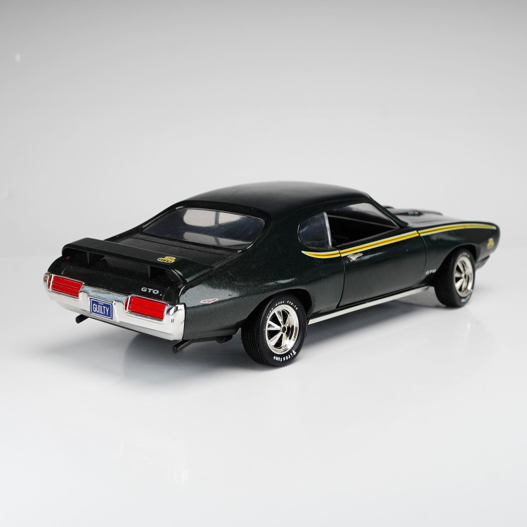 Produced by Ertl as part of the American Muscle collection, this 1:18 scale die-cast metal model depicts a 1969 Pontiac GTO "The Judge" Ram Air III. The vehicle is finished in a dark green metallic paint and features authentic "The Judge" decals on the front fenders and rear spoiler, complemented by yellow and white side stripes. The model is equipped with opening doors and rolling wheels. It sits on chrome-finish wheels with Firestone Wide Oval tires and features a rear chrome-colored bumper with a personalized Iowa license plate reading "GUILTY." The interior is composed of detailed black plastic with bucket seats and a wood-grain accented dashboard. The black plastic chassis includes a contrasting blue-painted engine and transmission component. The underside bears the manufacturer mark: "ERTLo DYERSVILLE IOWA USA MADE IN CHINA." This item is offered without the original packaging.