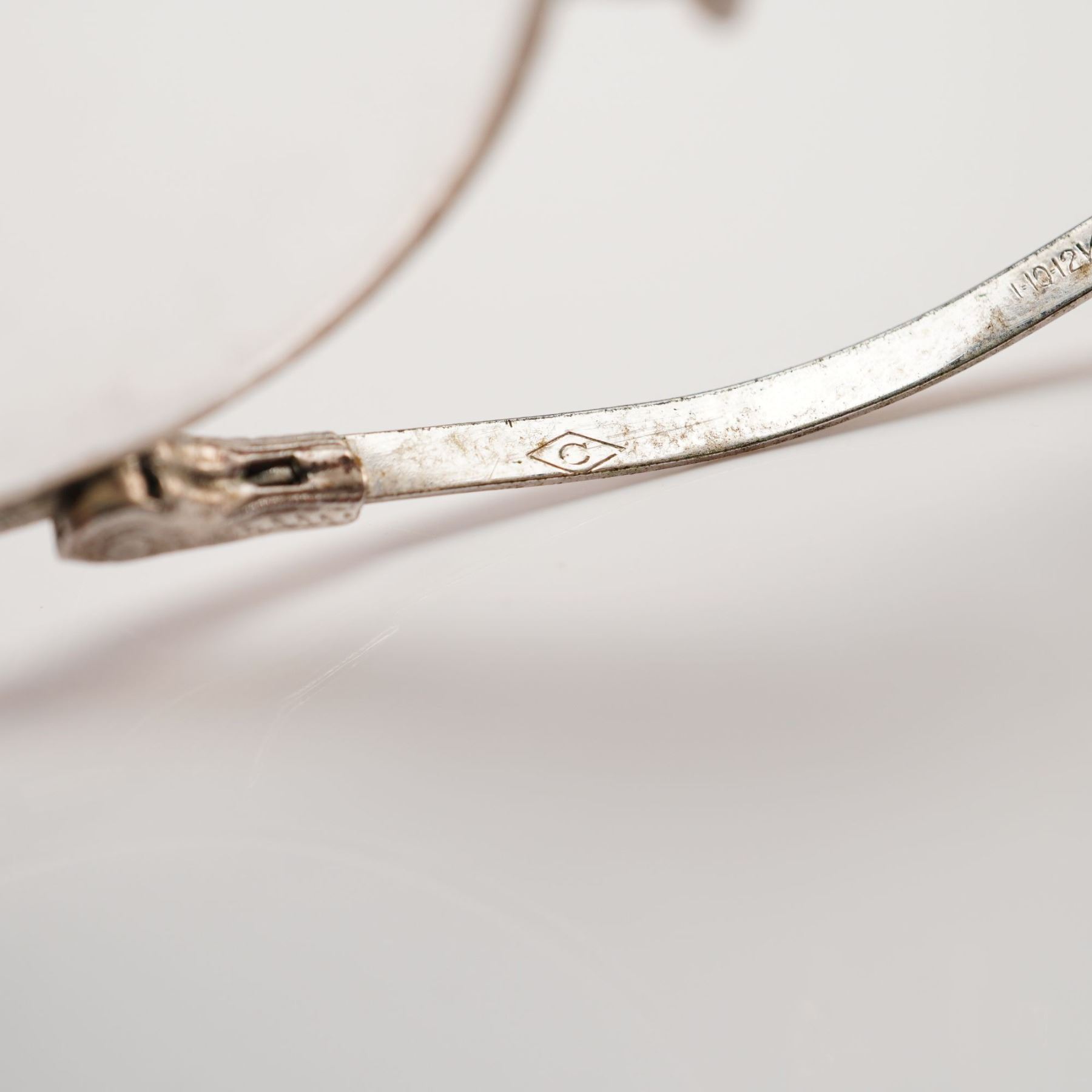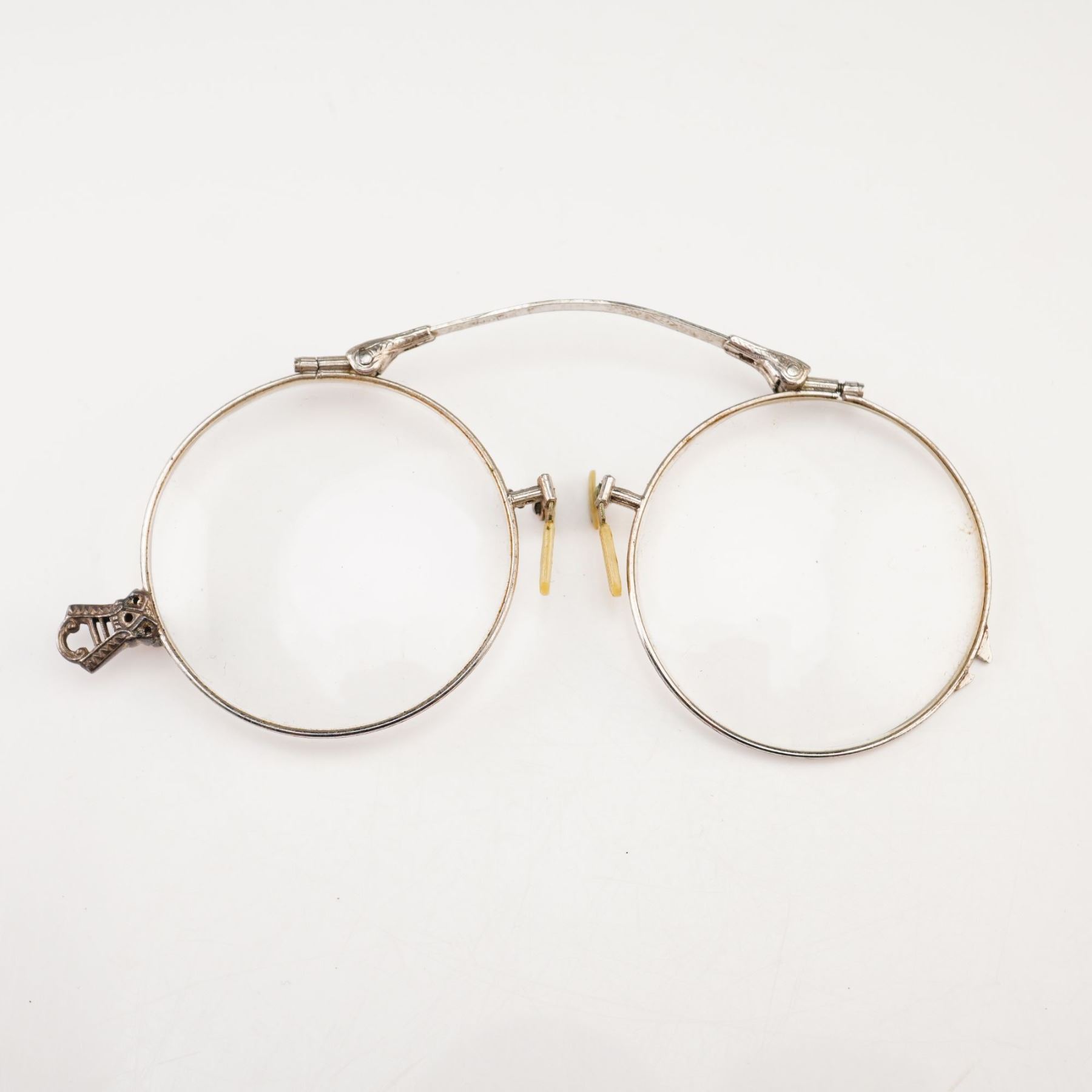 These vintage pince-nez spectacles feature a hallmark of a C inside a diamond and are marked 1/10 12K SPG on the bridge. The eyeglasses are constructed from 12 karat white gold-filled metal and feature perfectly round glass lenses. The design utilizes a classic spring-tension mechanism with an arched bridge adorned with decorative engraving at the hinges. The piece includes adjustable celluloid nose pads on spring arms and a small decorative loop on the outer edge of one lens frame intended for a gallery chain or cord.