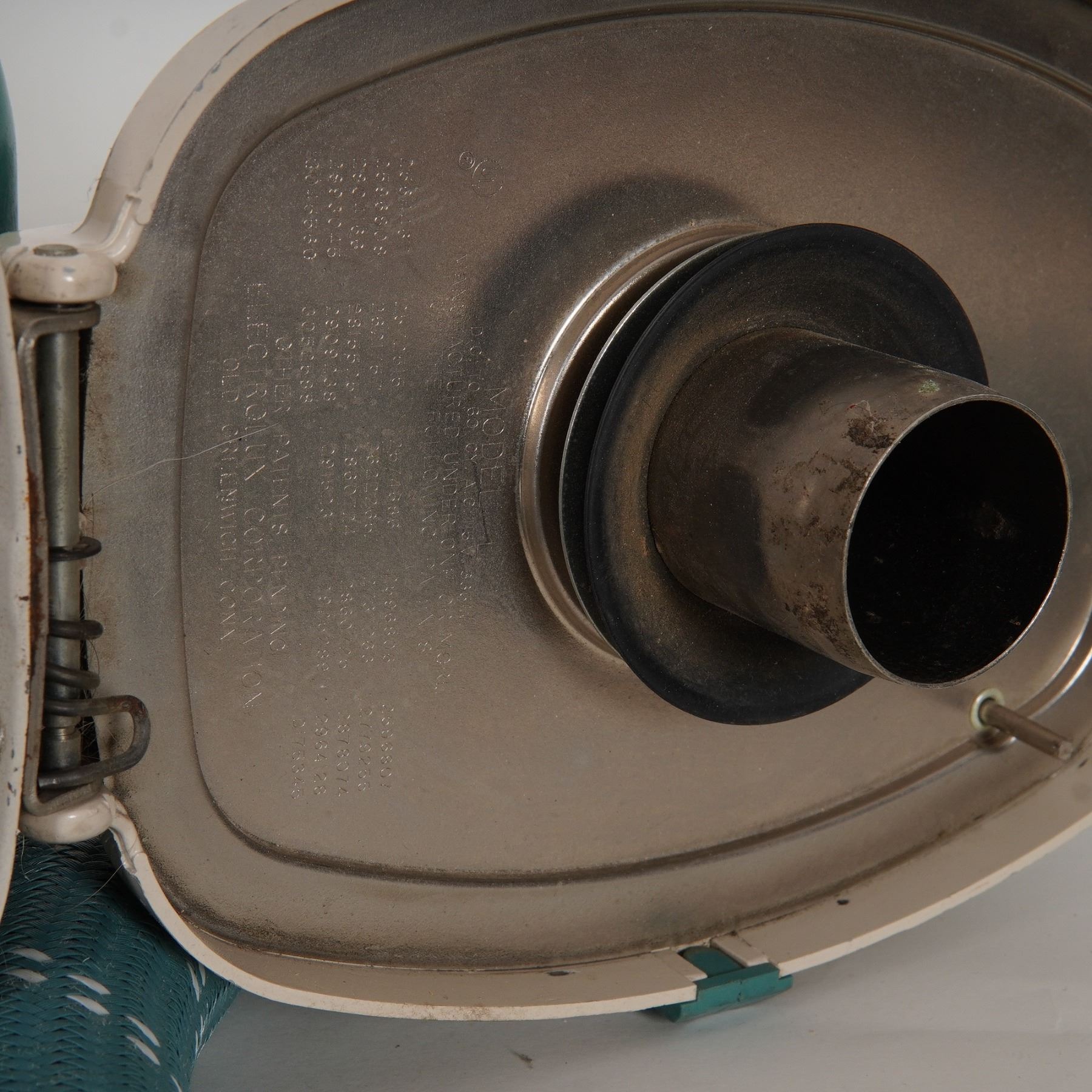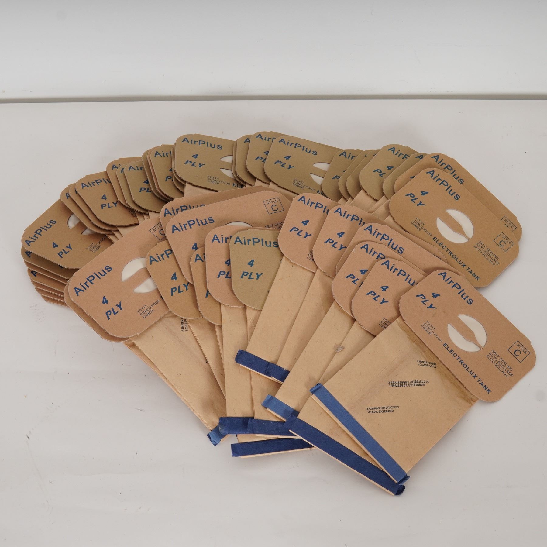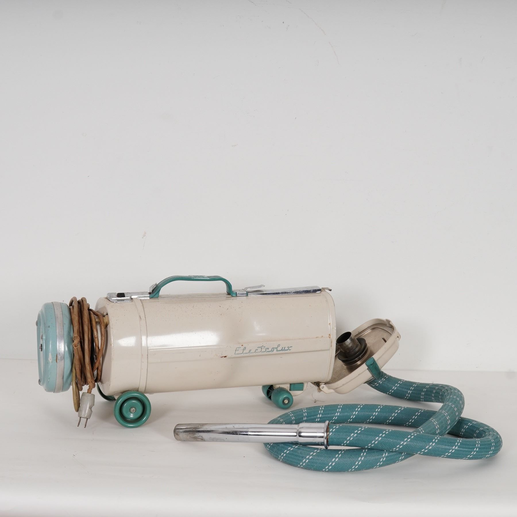 A mid-20th-century Electrolux canister vacuum cleaner, finished in cream with teal accents, accompanied by its flexible teal hose, metal wand, and assorted attachments. The cylindrical body sits on four wheels for maneuverability and features the classic Electrolux script logo. Included is a large quantity of unused AirPlus 4-ply Type C vacuum bags, compatible with Electrolux tank models.