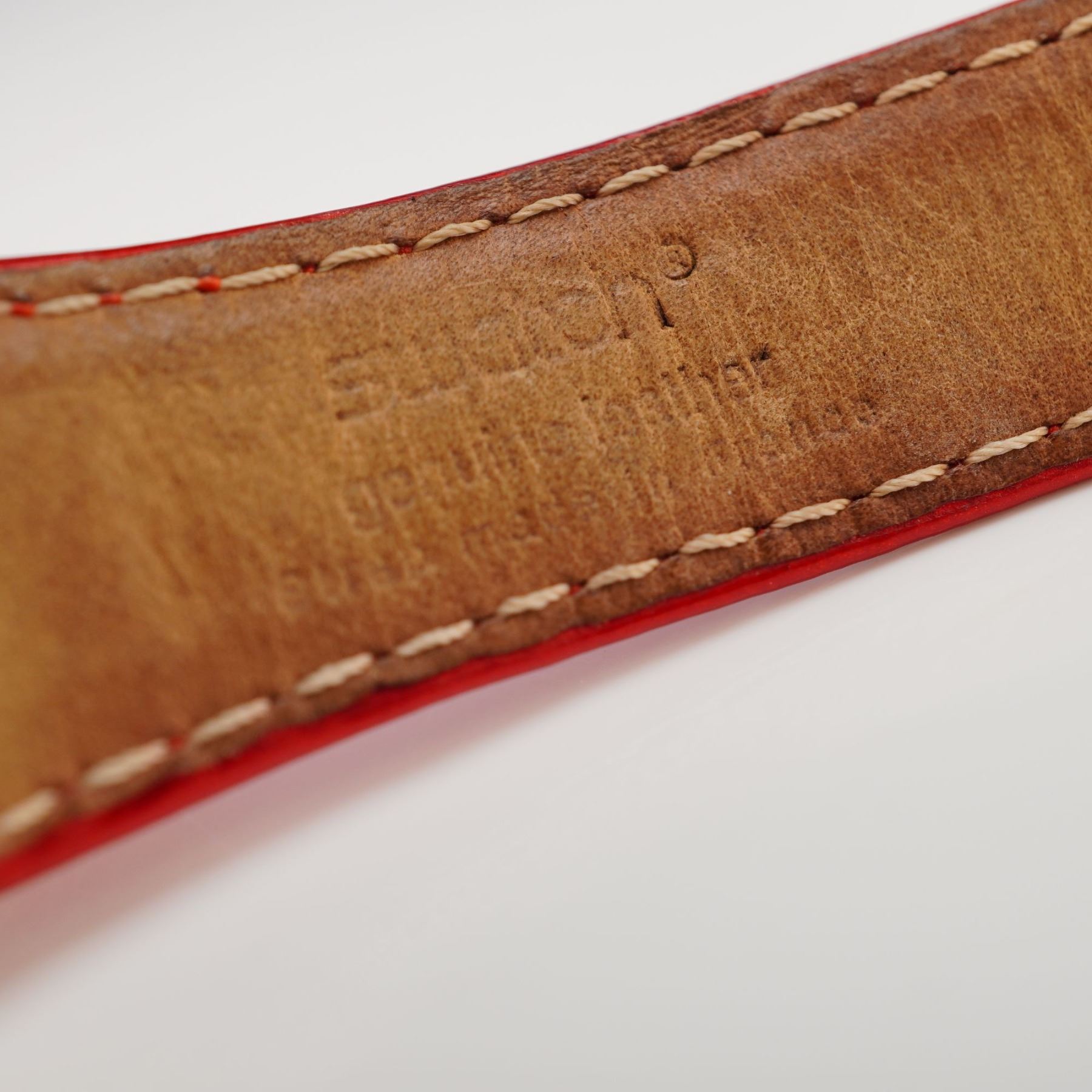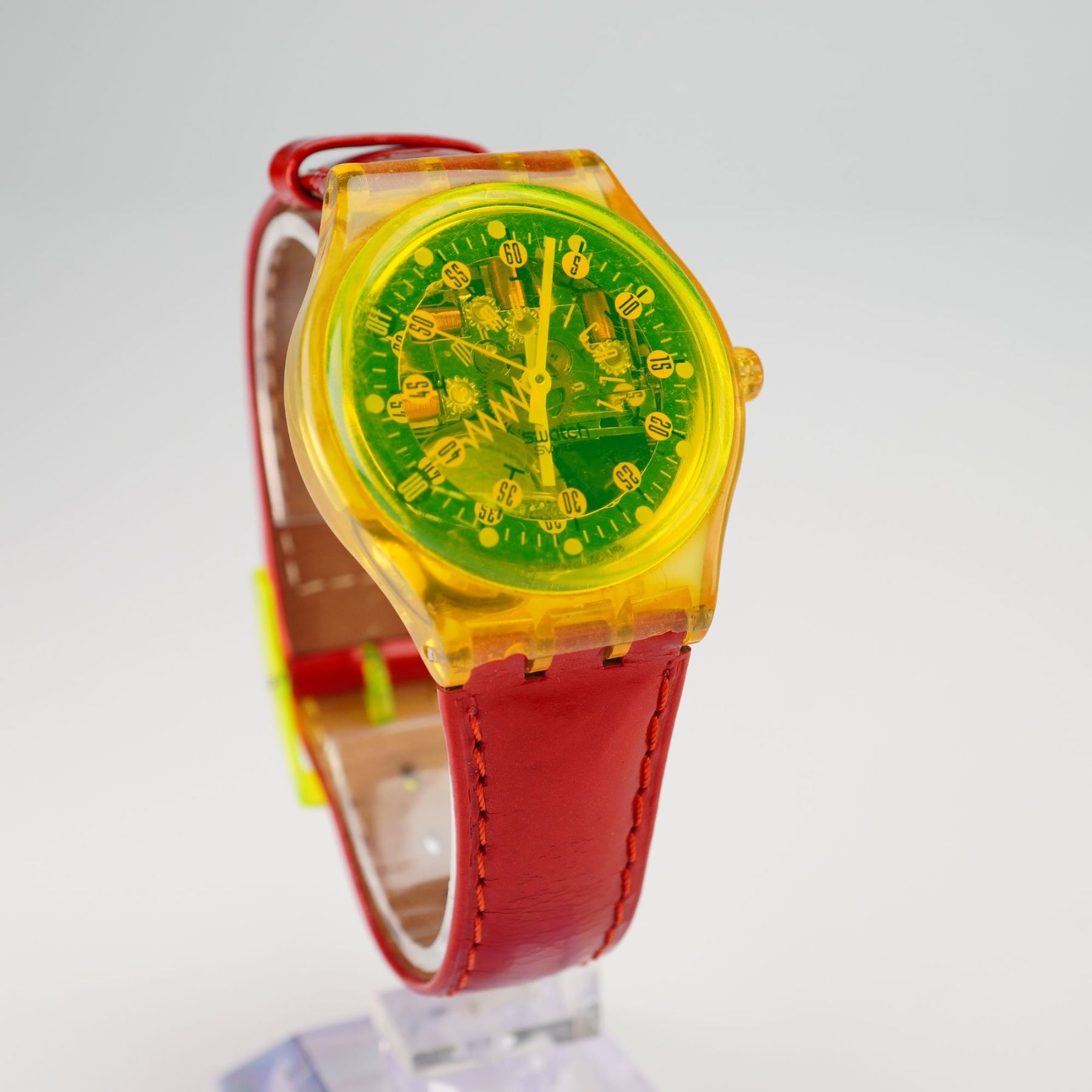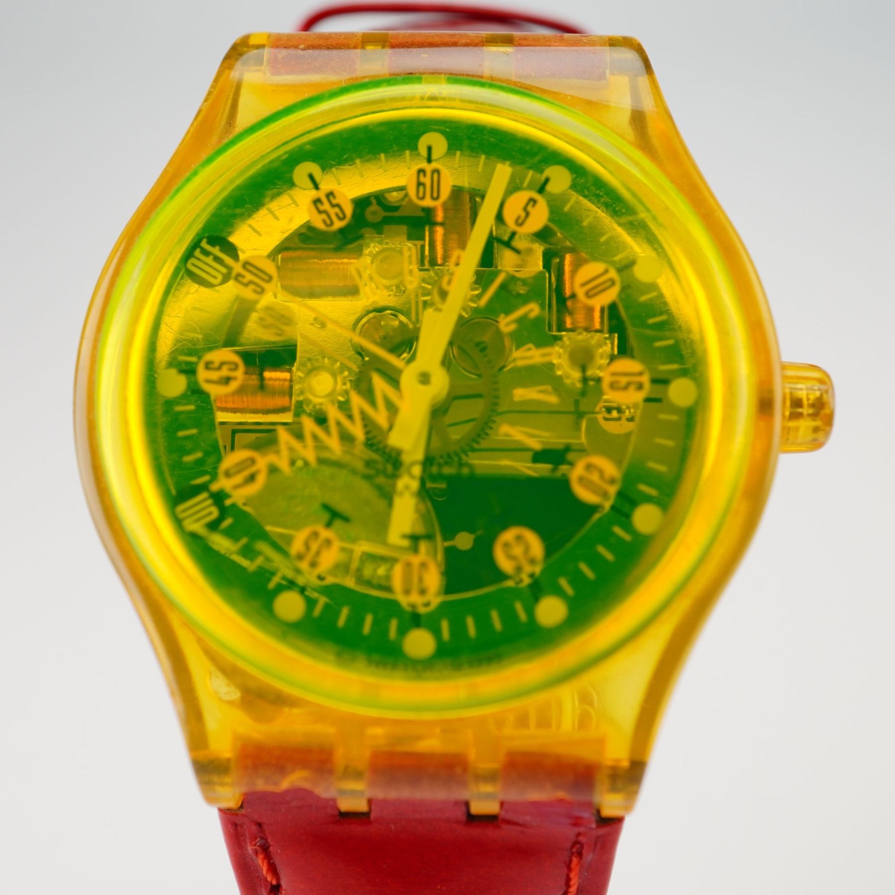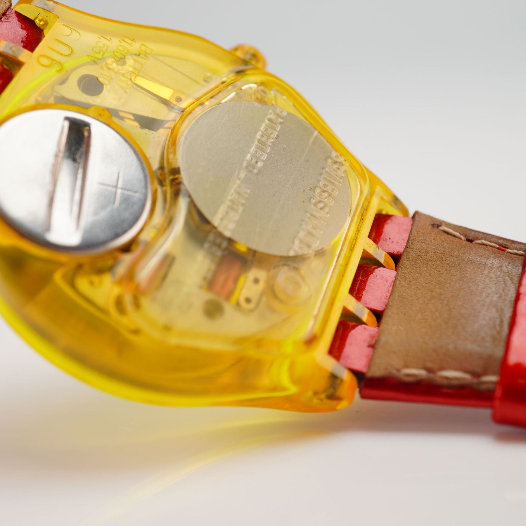 Brand: Swatch. Model: Retro-rosso Flash. Reference Number: GK186. Movement Type: Quartz. Case Material: Translucent yellow plastic. Dial Color: Translucent green skeleton dial with yellow Arabic numerals and yellow hands. Bracelet: Original red patent leather strap with yellow plastic buckle, marked Swatch Genuine Leather, Made in France. Serial Number: 606.