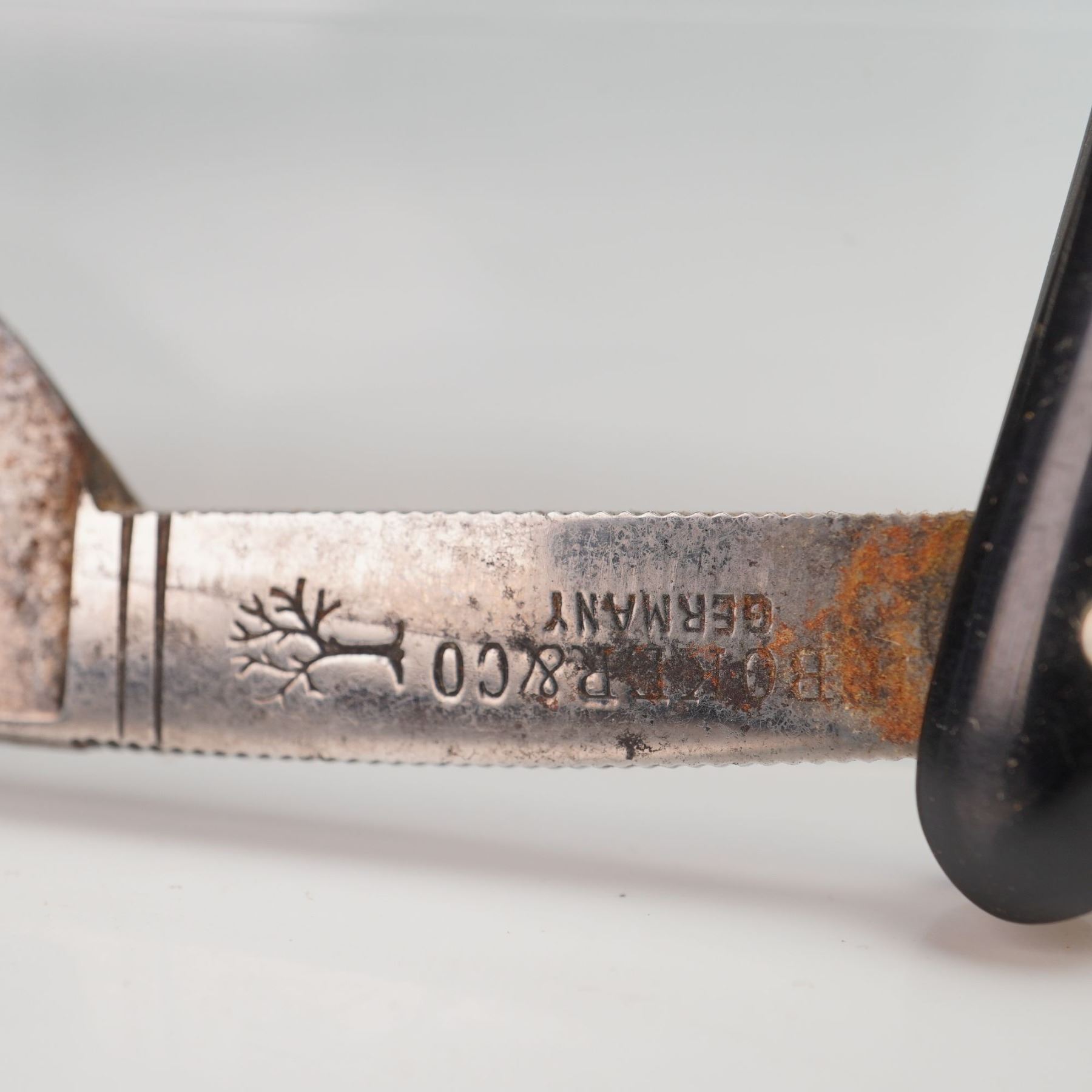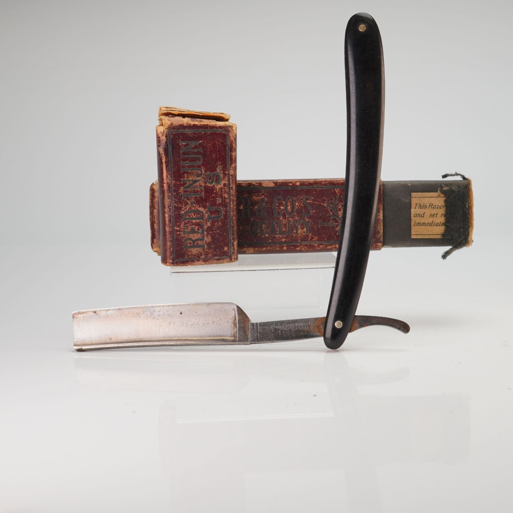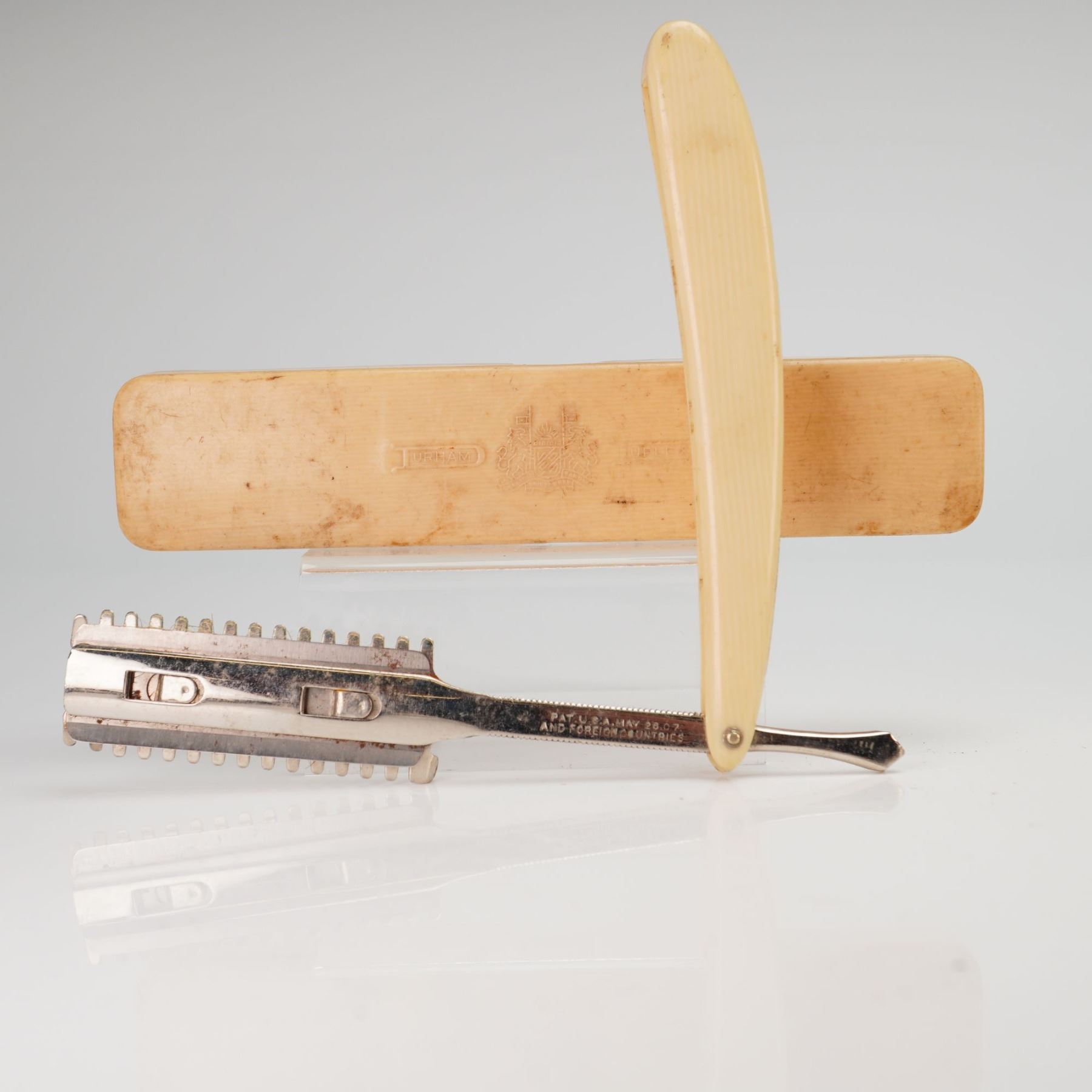 This lot features an H. Boker & Co. straight razor and a Durham Duplex safety razor. The Boker razor is equipped with a carbon steel blade and black celluloid scales, with the tang stamped H. BOKER & CO GERMANY alongside the iconic tree logo and the number 100. It is accompanied by its original Red Injun cardboard box. The Durham Duplex is a straight-style safety razor featuring cream celluloid scales and a plated steel blade holder, stamped PAT. U.S.A. MAY 28, 07 AND FOREIGN COUNTRIES. It is housed in its original cream-colored hard case with an embossed logo. This 3pc razor and razor cases collection represents a classic era of American and German grooming history. Blade lengths 3" and 2.25".