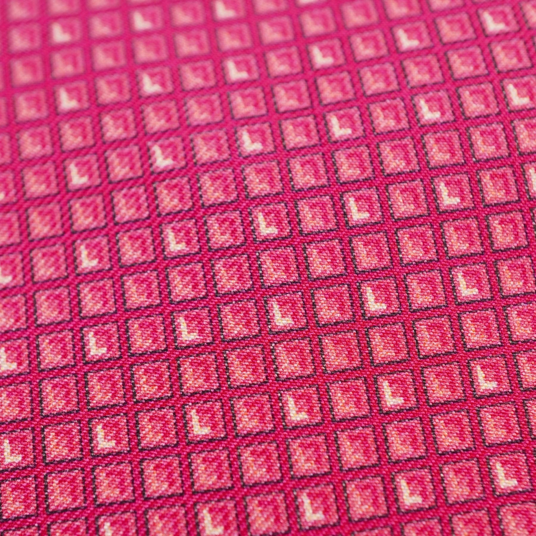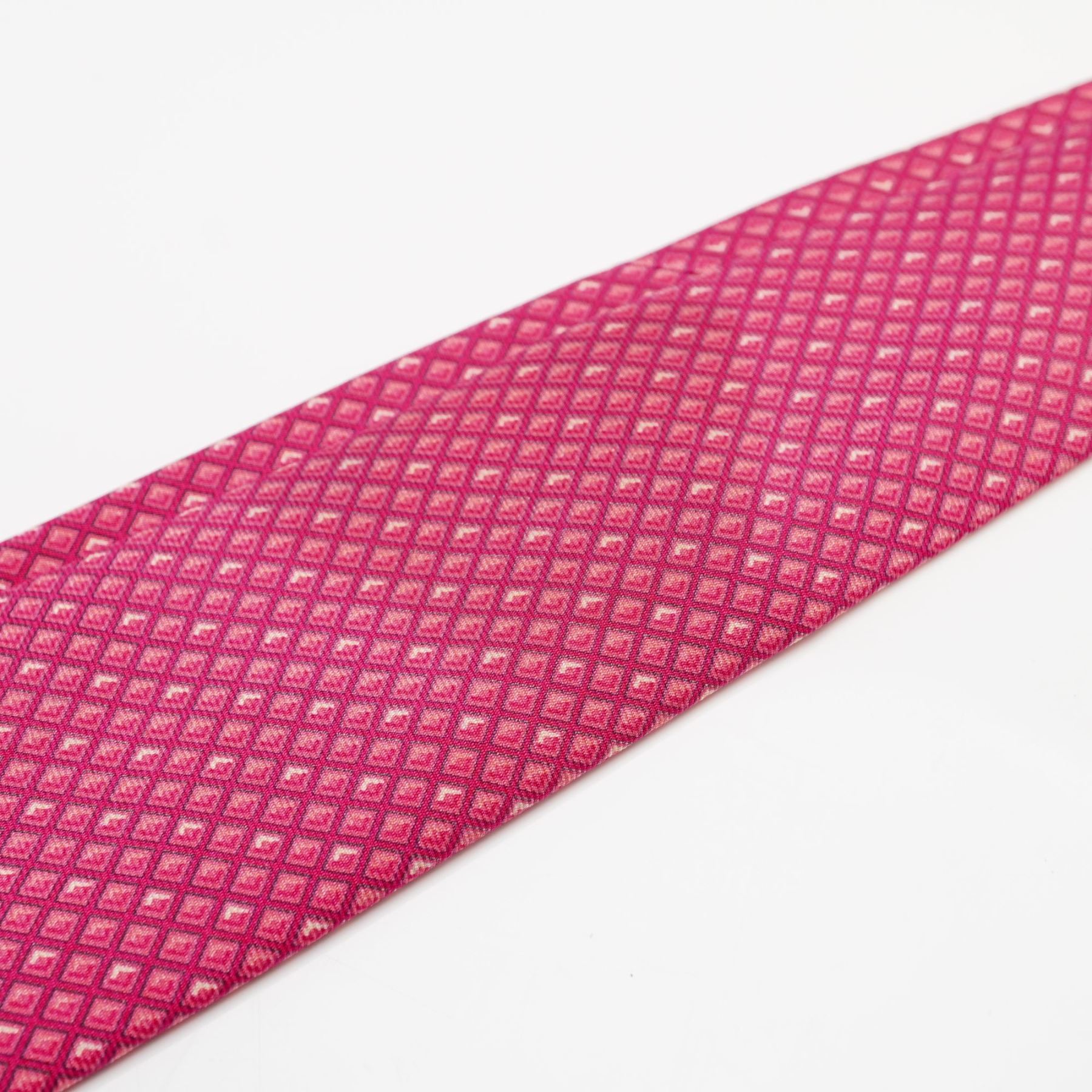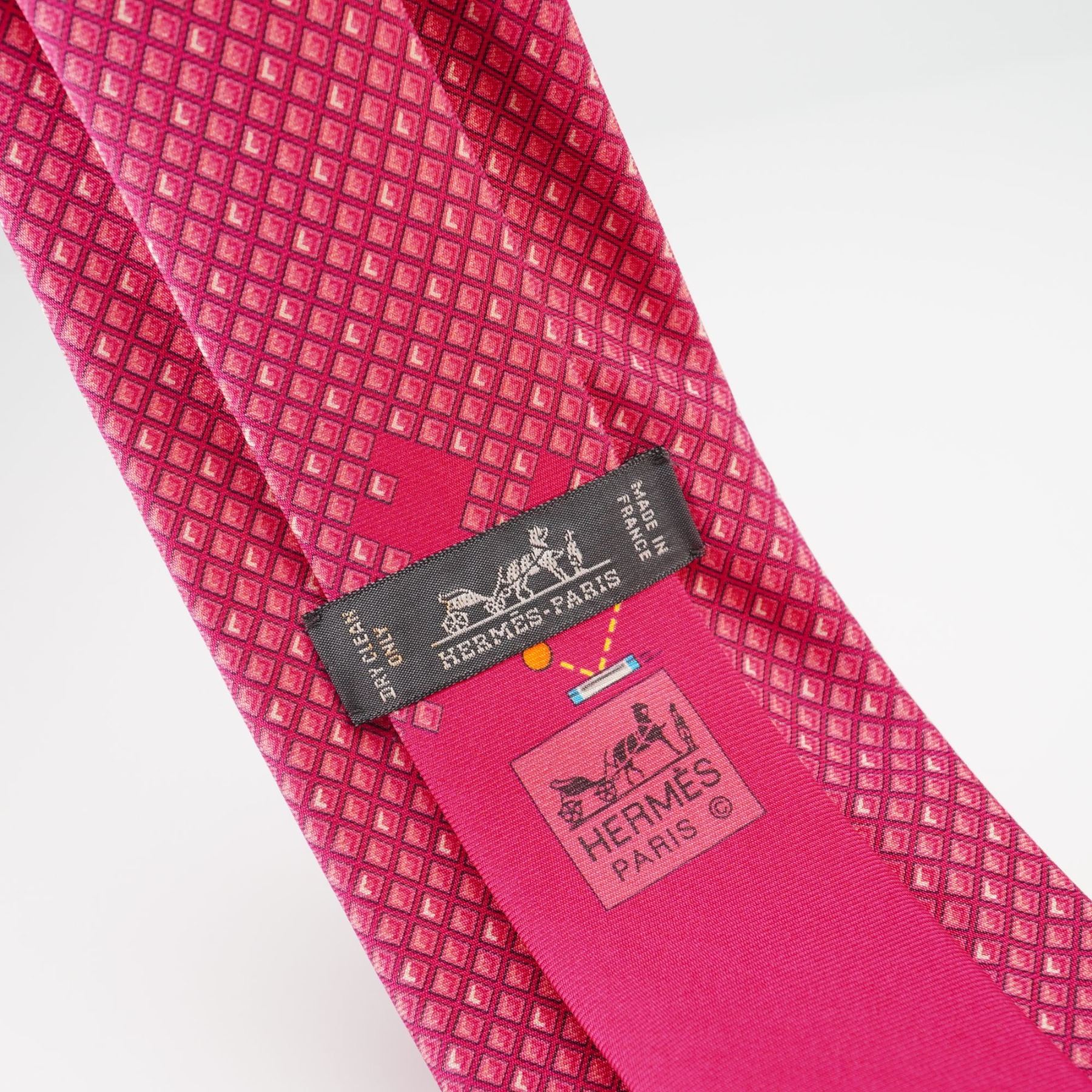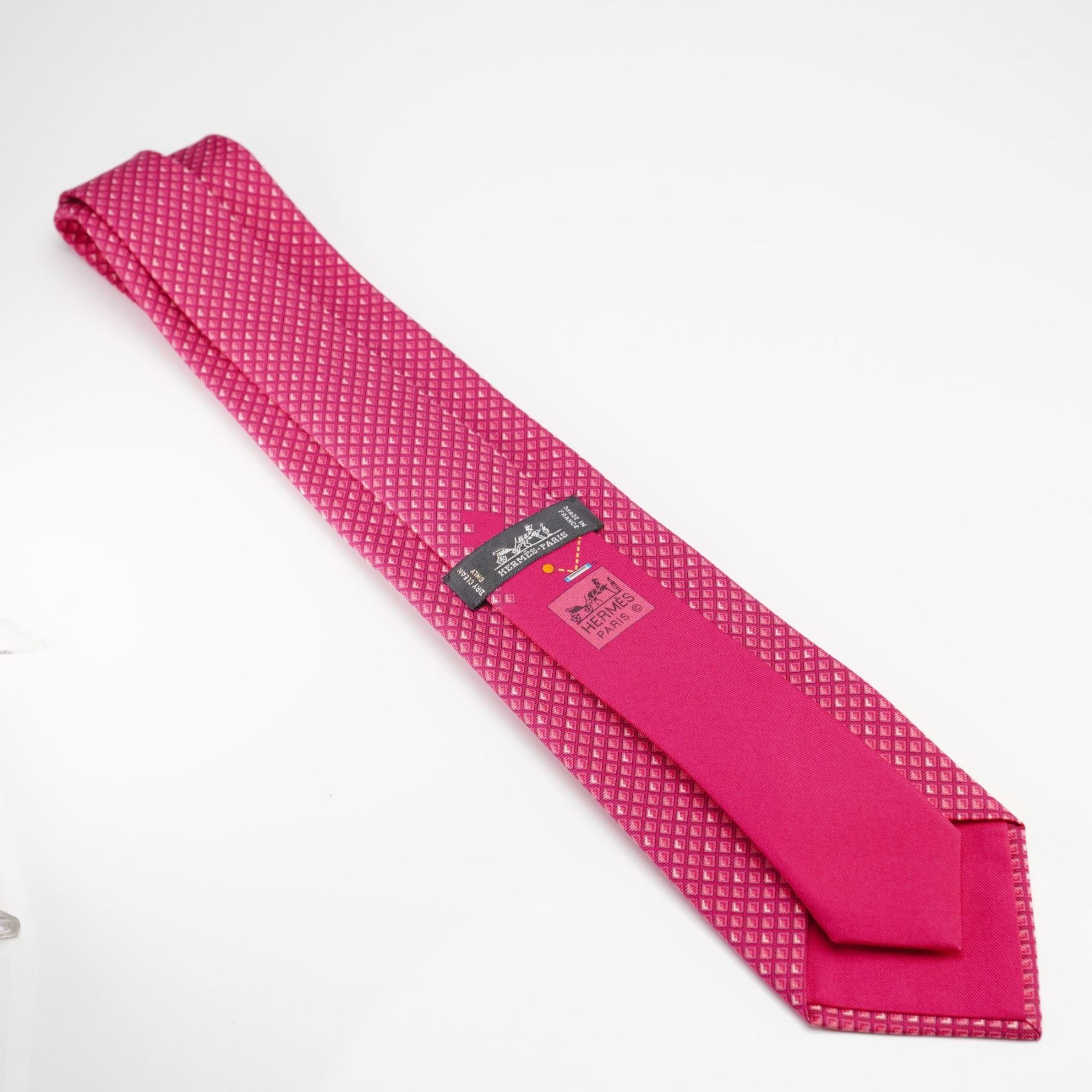 Hermes professional-grade necktie made in France from 100% silk. This Pink Hermes Paris Silk Tie features a vibrant fuchsia pink color with a fine geometric grid pattern. The design consists of small squares, many of which contain a subtle, stylized L motif in a lighter cream tone. The item contains no hardware. The reverse side features the characteristic Hermes woven keeper loop and the wide blade is finished with the iconic horse and carriage logo.