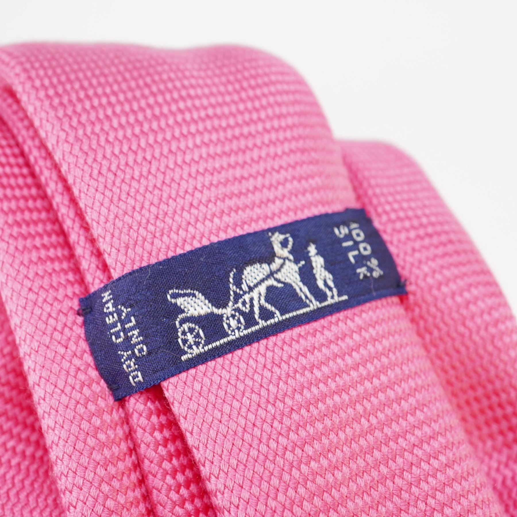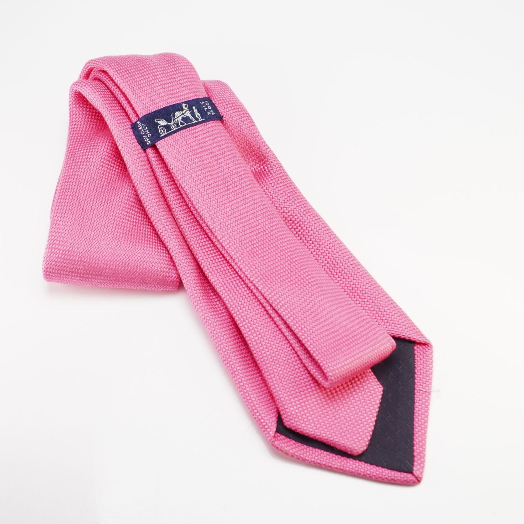 This Hermes Paris necktie is crafted from 100% silk in a vibrant pink color. It features the signature Faconnee H pattern, a sophisticated tonal weave of miniature H monograms that creates a textured basketweave appearance. The tie is handmade in France and includes the brand's iconic horse and carriage logo on the interior label. The reverse side is finished with a tonal H monogram lining.