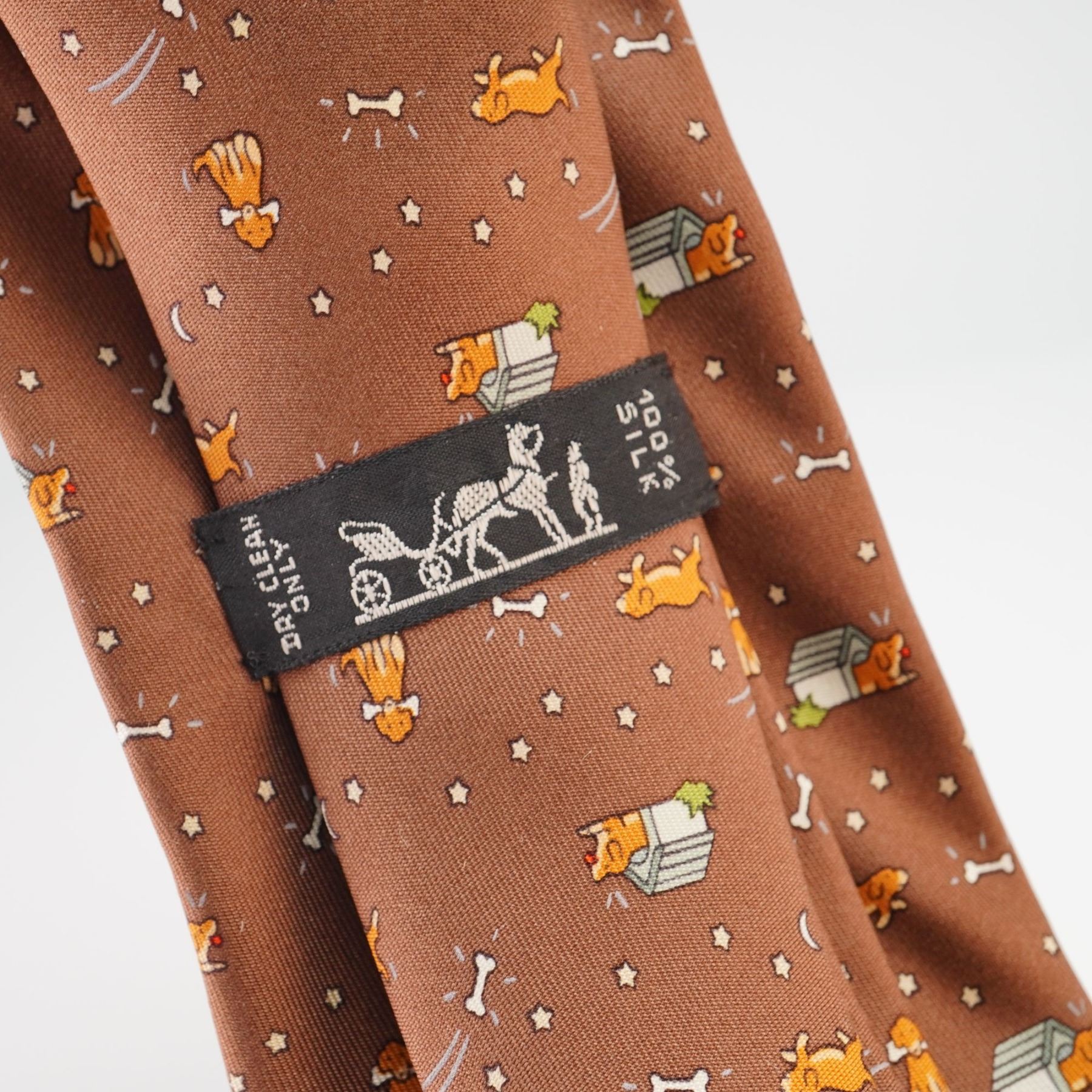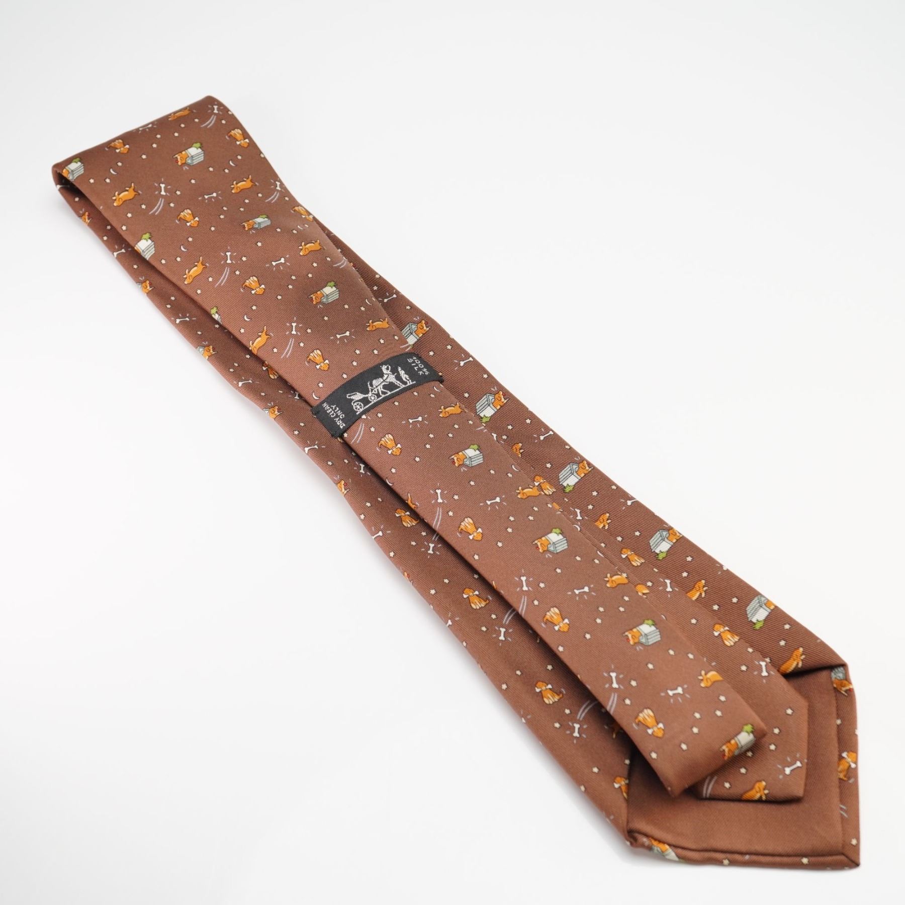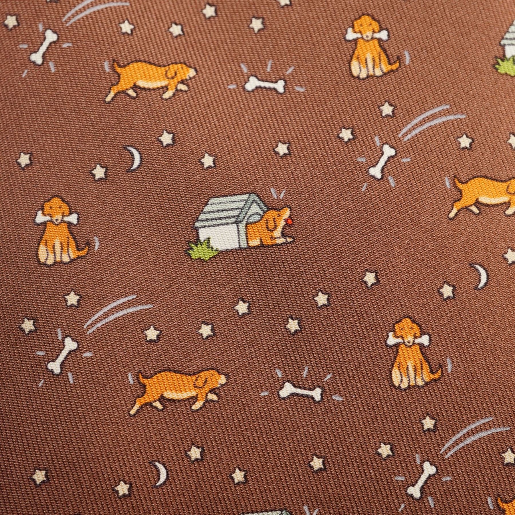 This authentic Hermes Paris silk tie features a whimsical repeating motif of golden-colored dogs in various poses, including sitting with a bone, running, and peeking from a doghouse. The playful design is accented with dog bones, stars, and crescent moons, all set against a chocolate brown ground. Crafted in France from 100% silk, the necktie includes the signature Hermes horse and carriage logo on the keeper loop.