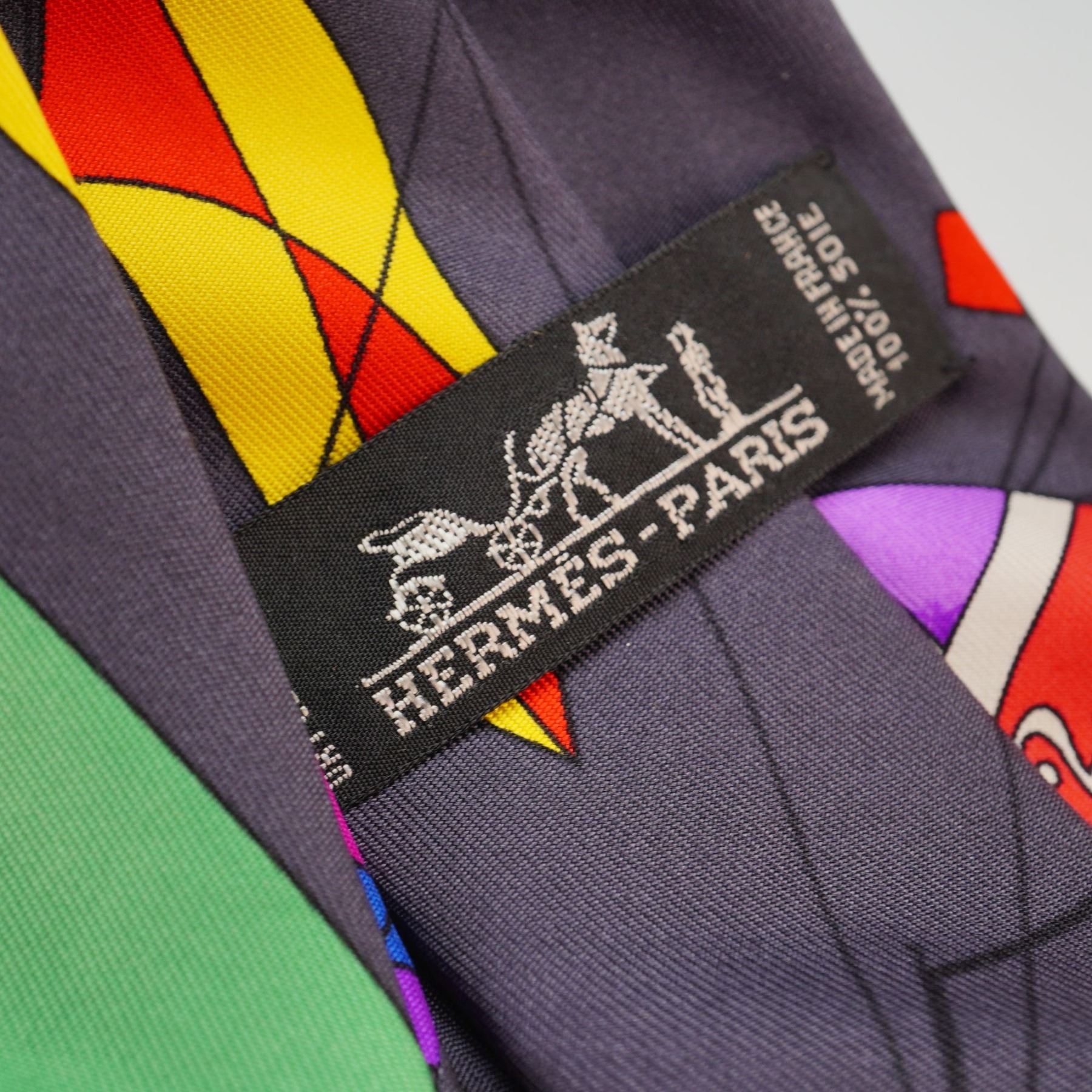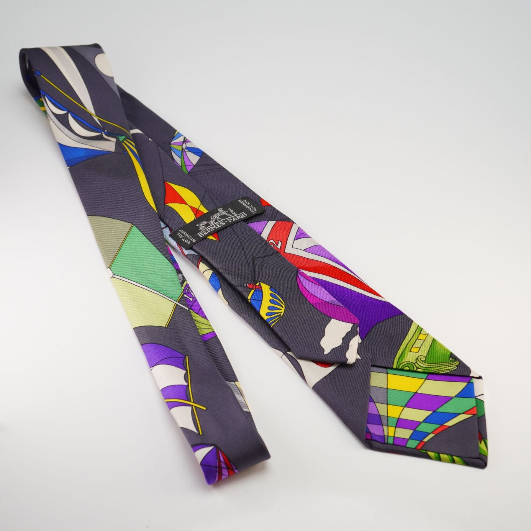 This authentic Hermes Paris necktie is crafted from 100% silk (soie) and was made in France. The piece features a whimsical aeronautical pattern showcasing an array of multi-colored hot air balloons, parachutes, and historical flying vessels. These vibrant graphics in emerald green, bright yellow, scarlet red, and purple are set against a dark charcoal gray ground. Hermes Paris tag.