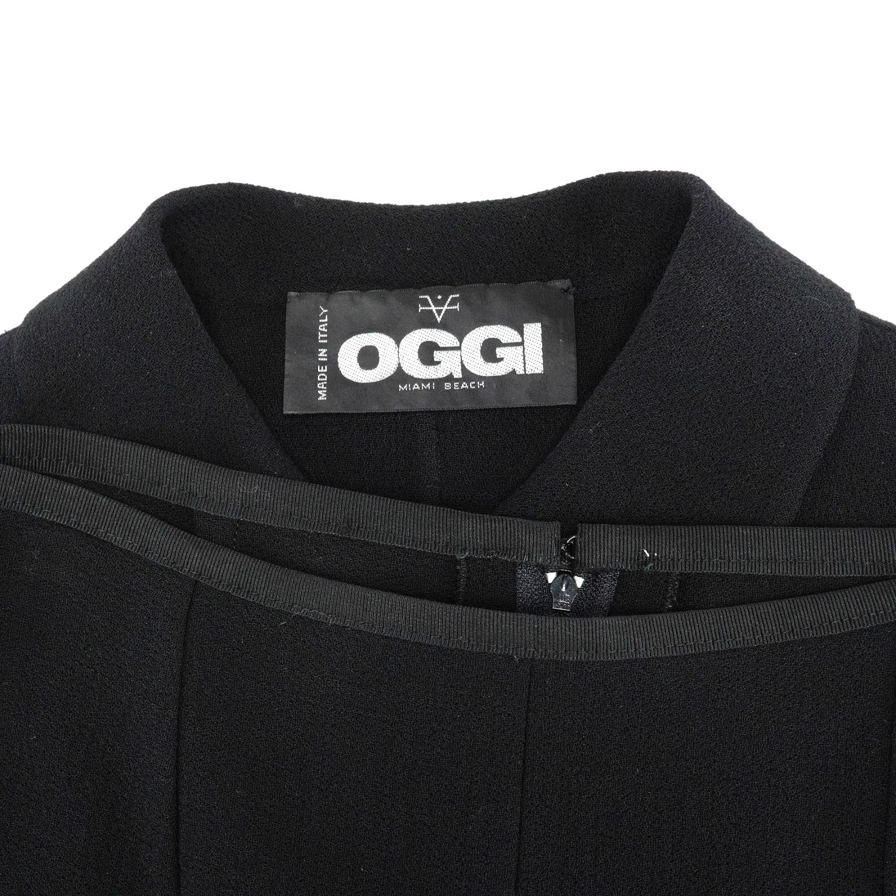 This two-piece skirt suit is produced by Oggi Miami Beach and was made in Italy. The set is constructed from a black wool fabric featuring a distinct crepe-textured weave. The single-breasted jacket is designed with a tailored silhouette achieved through princess seams and features a pointed collar with a four-button front closure. The buttons are dark-toned with a horizontal cat eye slot. The jacket includes two rounded patch pockets at the hip. The matching straight-cut skirt features vertical darts at the waist for shaping and a rear zipper closure. The interior waistband of the skirt is finished with a black grosgrain ribbon. A black woven label at the neck of the jacket is marked MADE IN ITALY with a stylized logo above the brand name OGGI and MIAMI BEACH centered below.