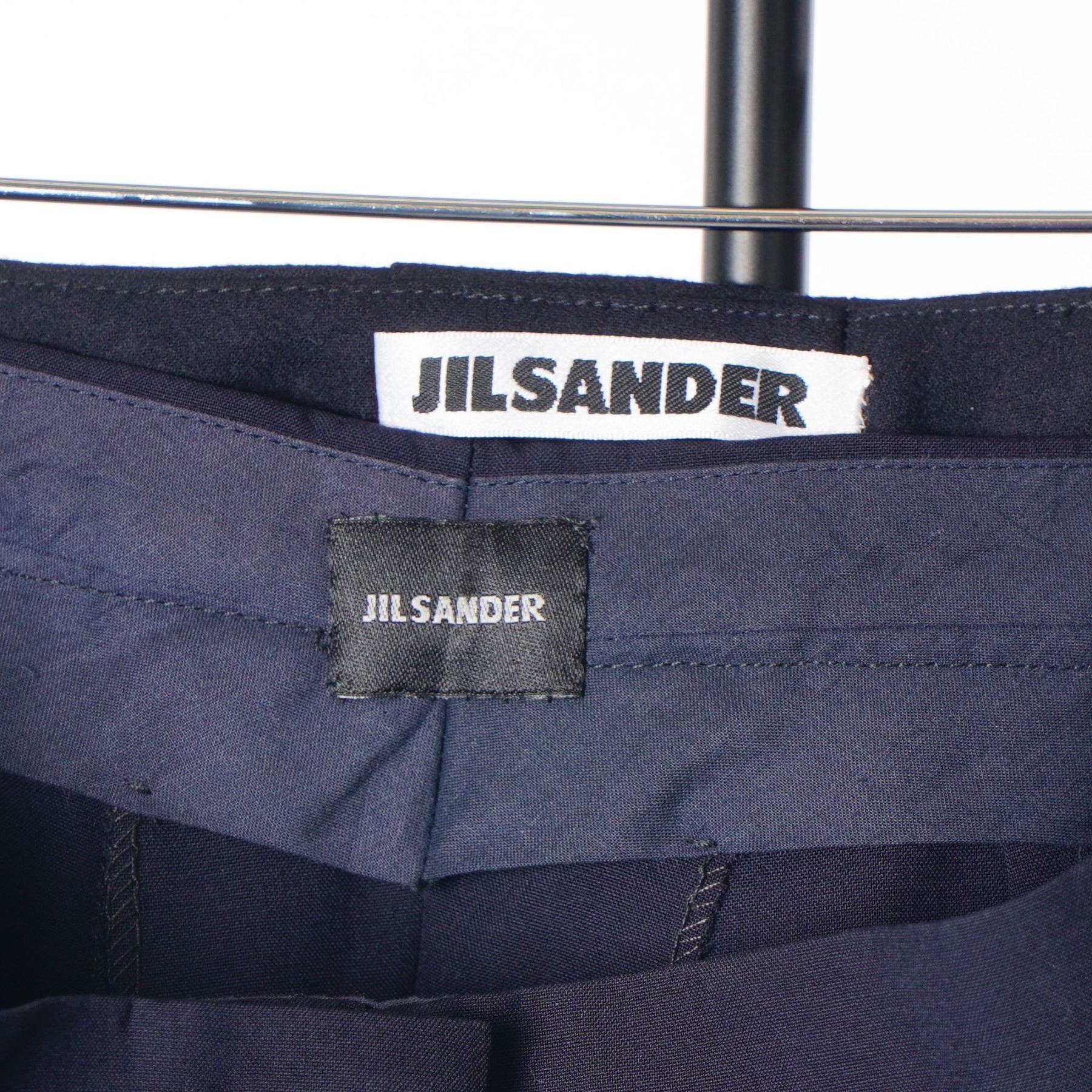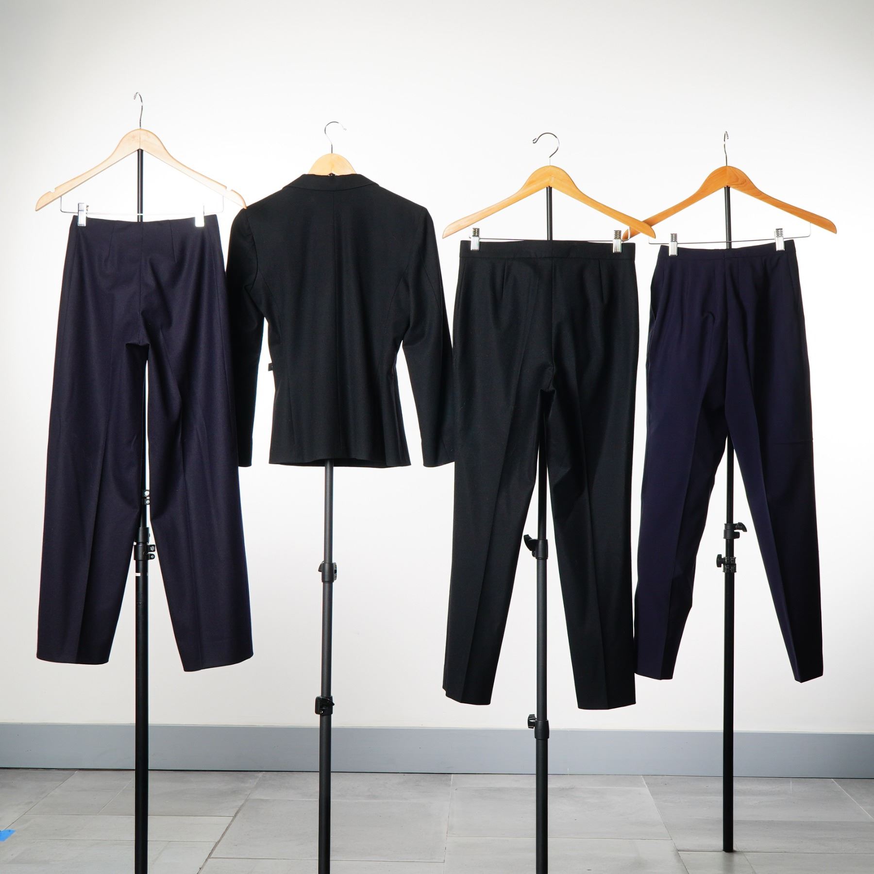 This collection of professional attire from Jil Sander consists of four pieces of tailored clothing. The group includes one single-breasted black wool blazer featuring notched lapels and a distinctive integrated thin waist belt with a small silver-tone buckle. Accompanying the jacket are three pairs of trousers: one navy blue wide-leg pair with central pressed creases, one black pair featuring buttoned adjustment tabs at the side of the waistband, and one navy blue straight-leg pair with central pressed creases. All garments are constructed from high-quality wool or wool-blend suiting fabric. Internal fabric labels are present bearing the Jil Sander mark. Sizes: One suit size 36, two pairs of pants size 36, and one pair of pants size 38.