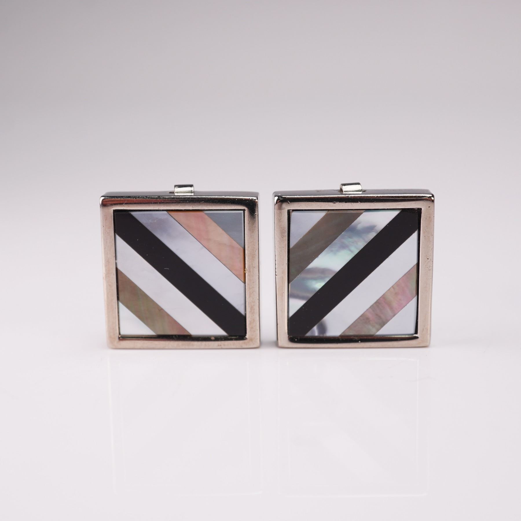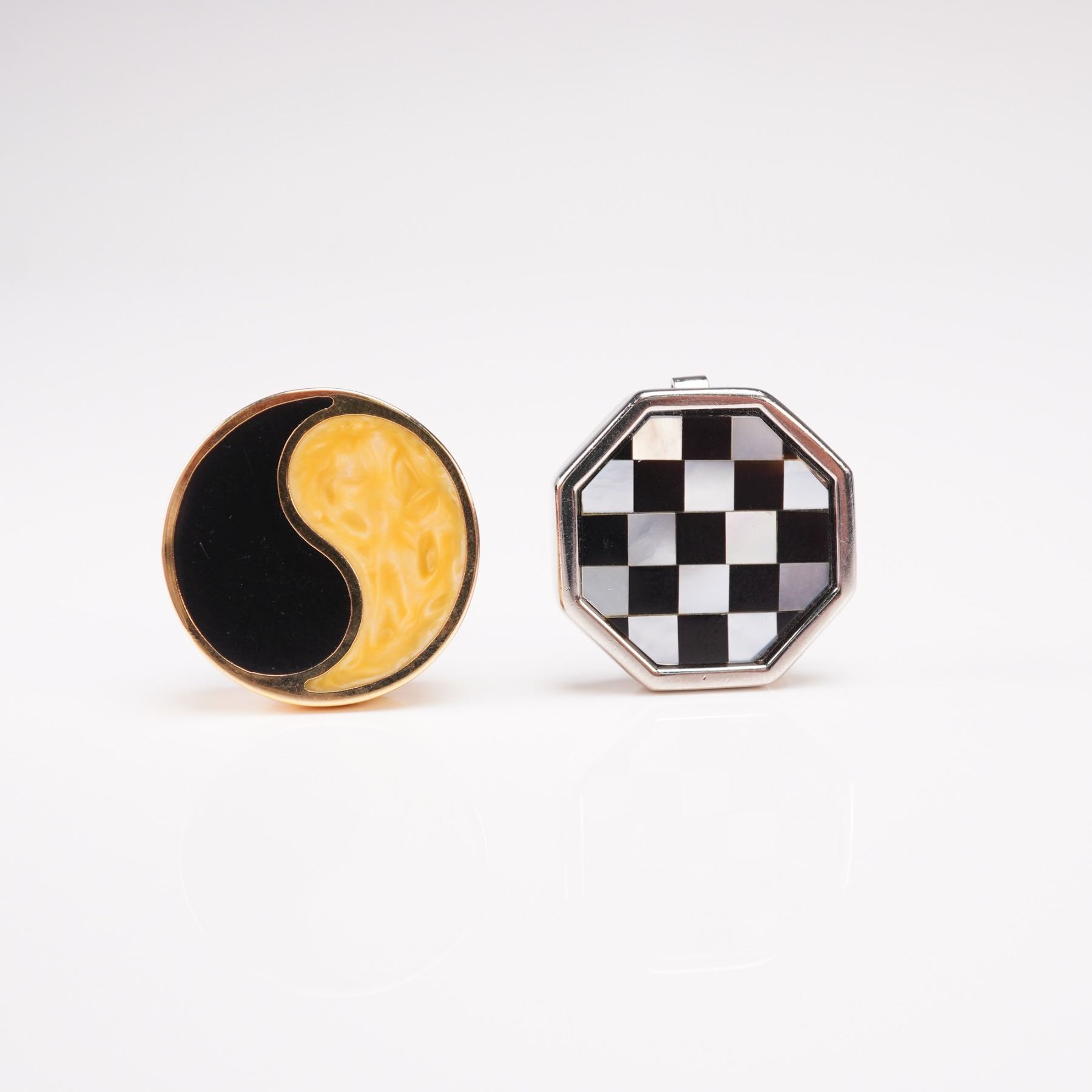 An eye-catching trio of button covers, each featuring bold geometric designs and vibrant inlays. The collection includes one pair with square silver-tone frames set with diagonal stripes of mother of pearl and black enamel, a pair of octagonal gold-tone covers with textured black enamel in a diamond grid pattern, and two single round and octagonal covers with contrasting yin-yang and checkerboard motifs. Together they showcase a dynamic mix of Art Deco influence and modernist flair, perfect for adding a stylish accent to formalwear.