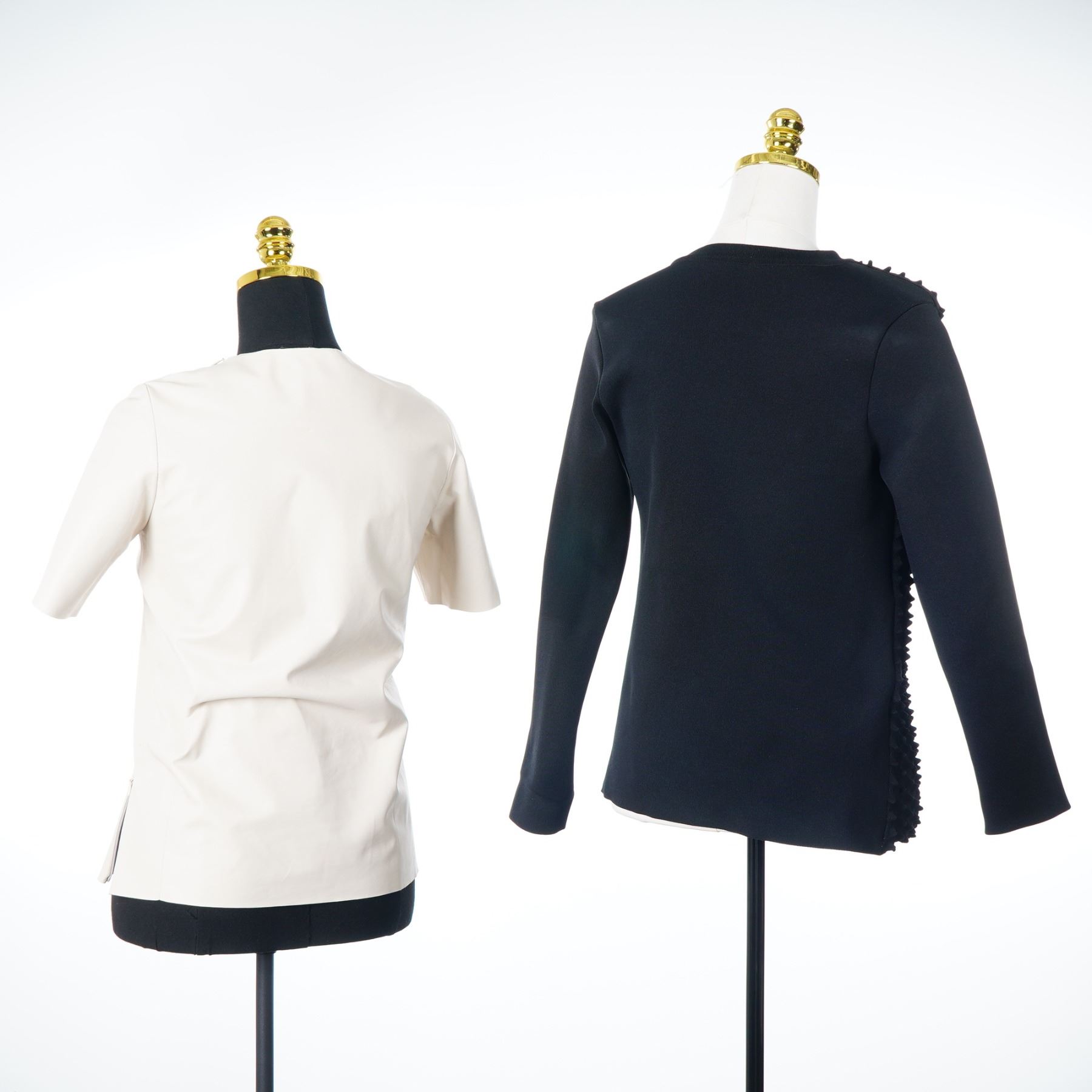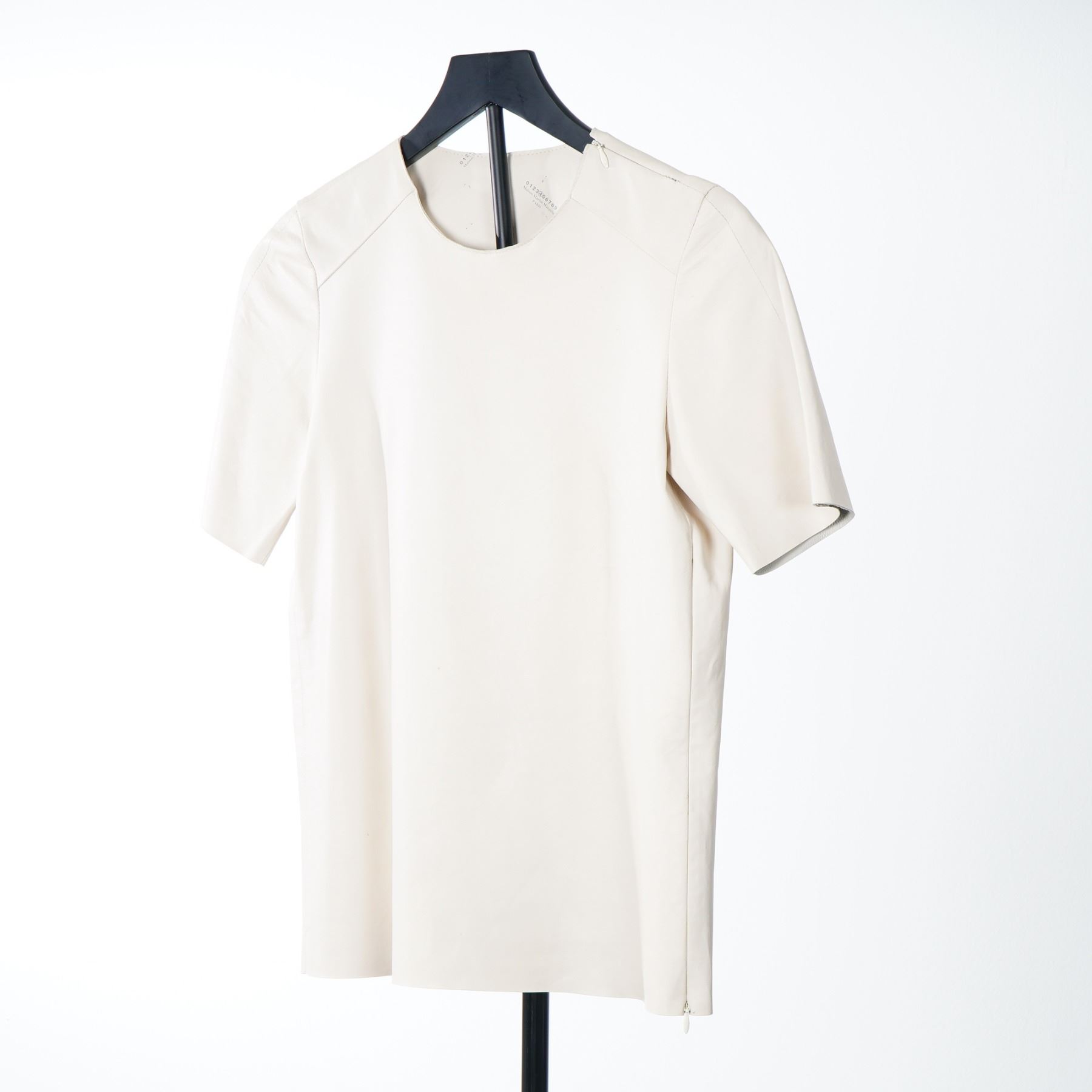 This lot consists of two designer garments. The first is a Maison Martin Margiela leather shirt in a cream or light beige color. This sleeveless top is designed with a round neckline and side zippers with teardrop-shaped metal pulls. The interior neckline features a printed label with the numbers 0 through 9 and the number 4 circled, indicating the Garde-robe pour femme collection. The label also includes the text Maison Martin Margiela PARIS. The second garment is a Paco Rabanne black sweater in size XS, featuring elbow-length sleeves. It is crafted from a textured honeycomb open-knit fabric. The interior care and size tag identifies the material composition as 87 percent polyester, 11 percent polyamide, and 2 percent elastane.
