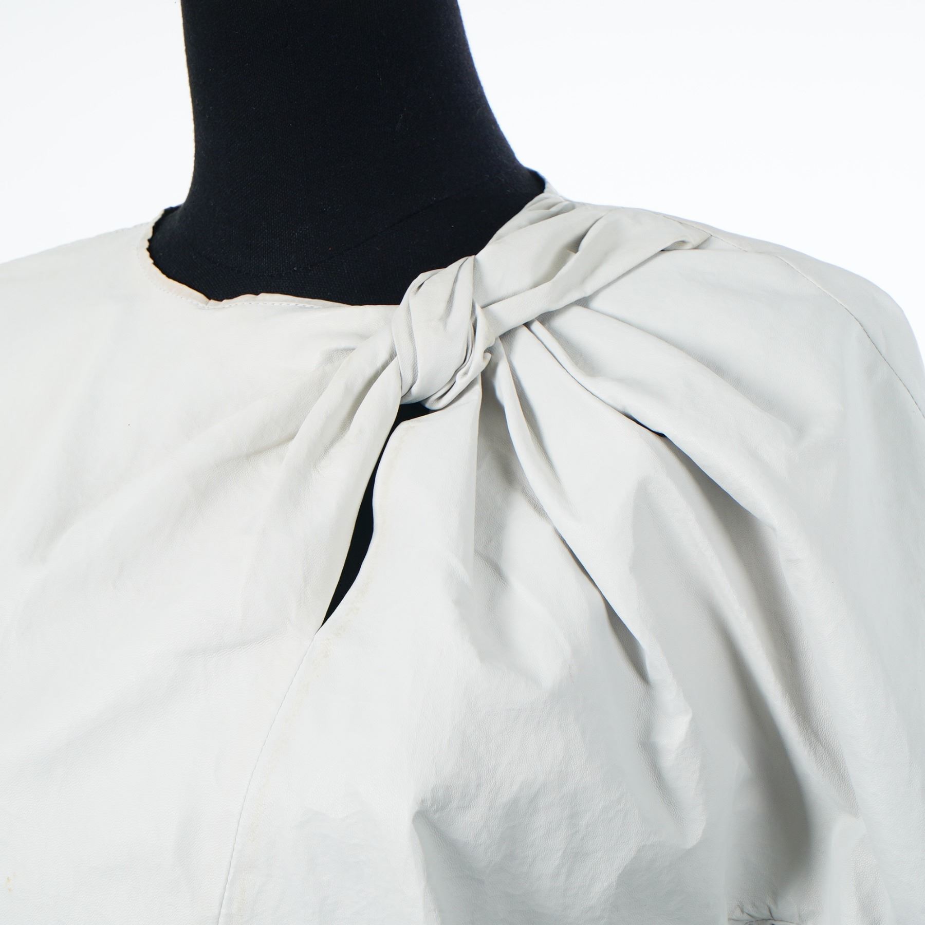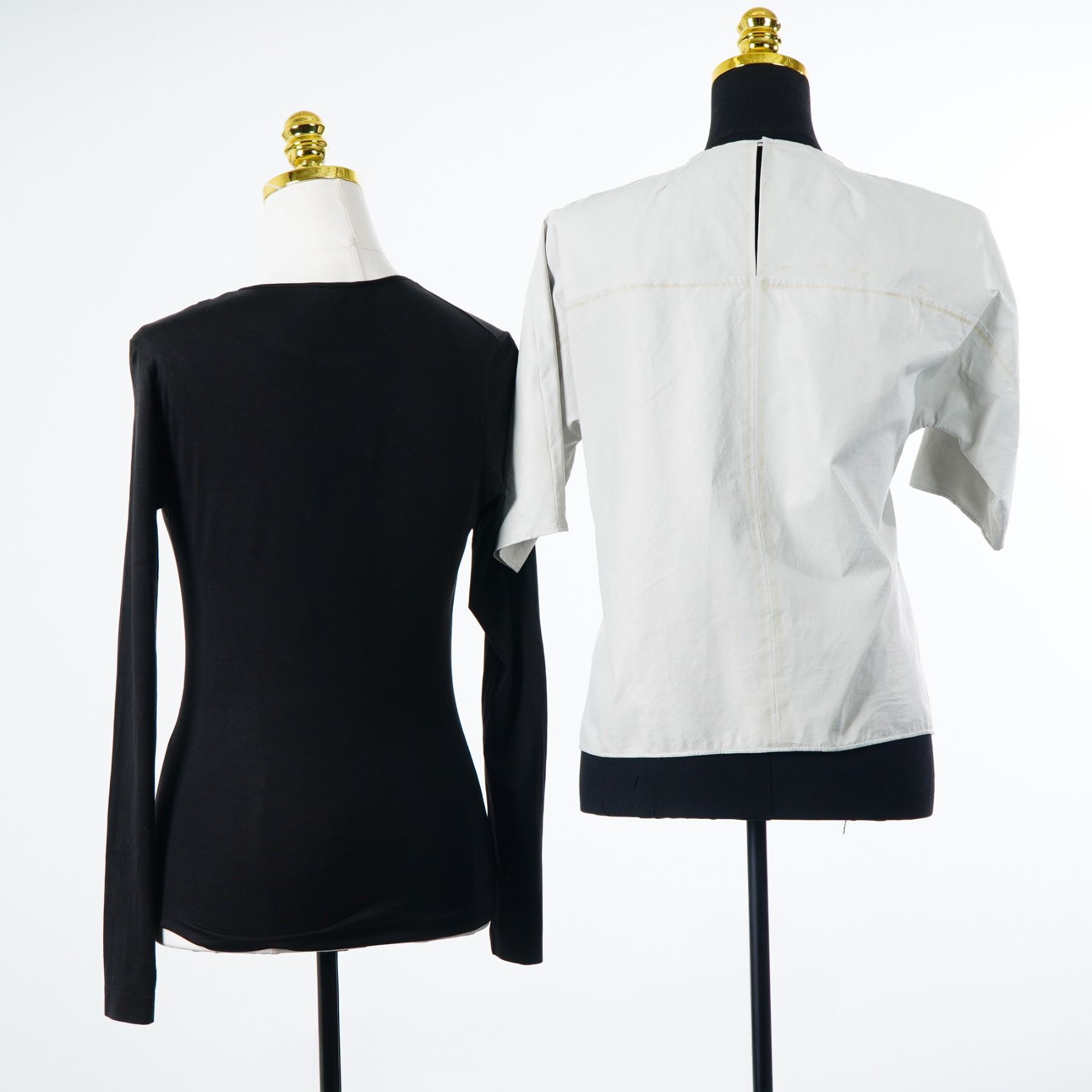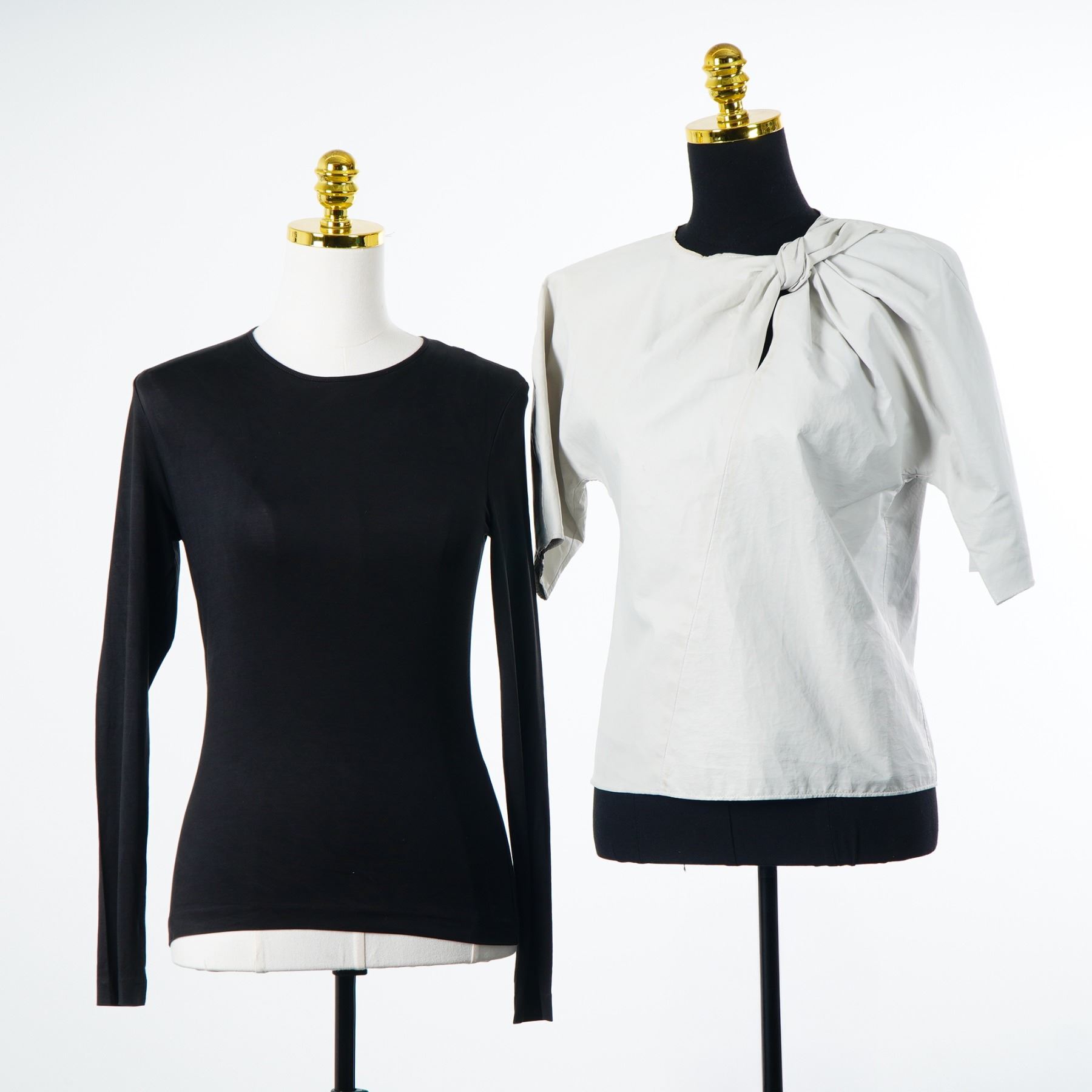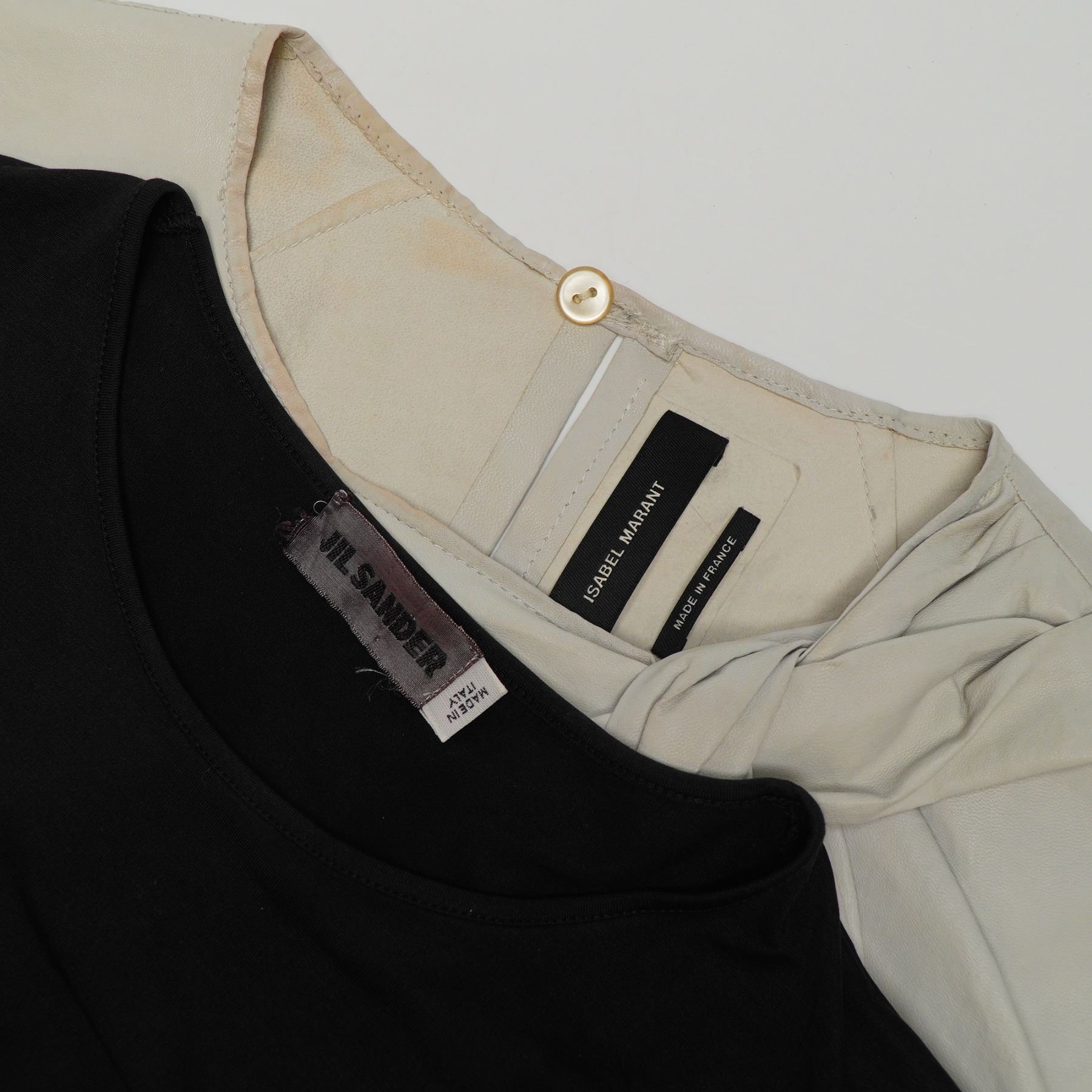 Two designer shirts including one Jil Sander long-sleeve cotton-jersey top and one Isabel Marant short-sleeve knotted blouse. The Jil Sander garment is a black, fine-gauge cotton-jersey knit top with a crew neck and long sleeves. It bears the Jil Sander brand label and a Made in Italy tag. The Jil Sander shirt has the size tag removed. The Isabel Marant garment is an off-white short-sleeve blouse featuring a prominent knot detail at the left shoulder that creates asymmetrical draping across the front. The back is designed with a vertical slit and a single button closure at the top. It is constructed from a lightweight material with a texture consistent with leather or a high-quality synthetic. The interior bears the Isabel Marant brand label and a Made in France tag.