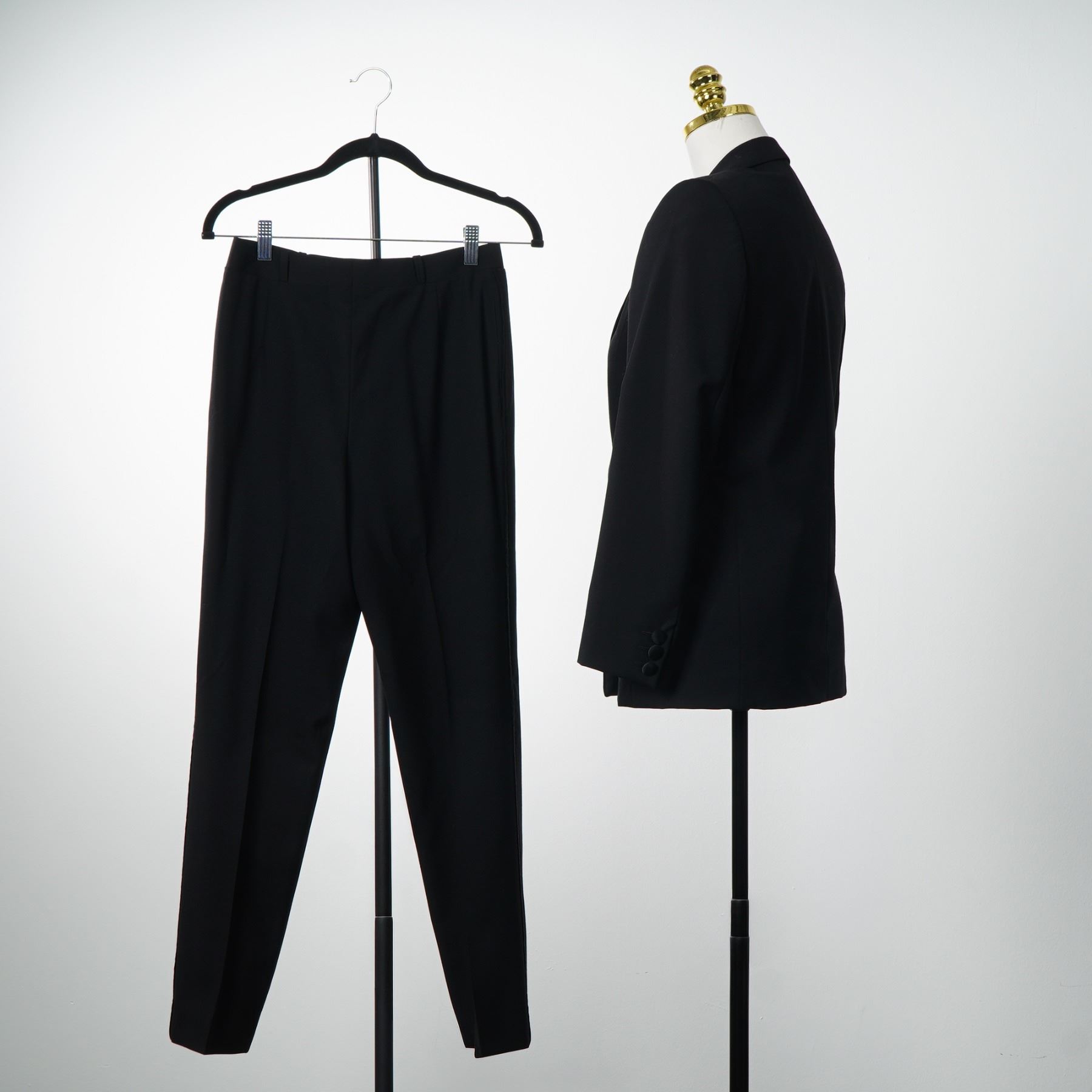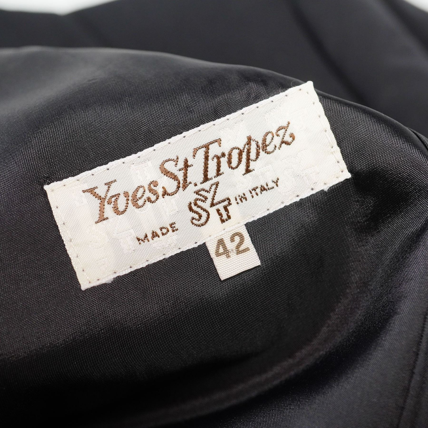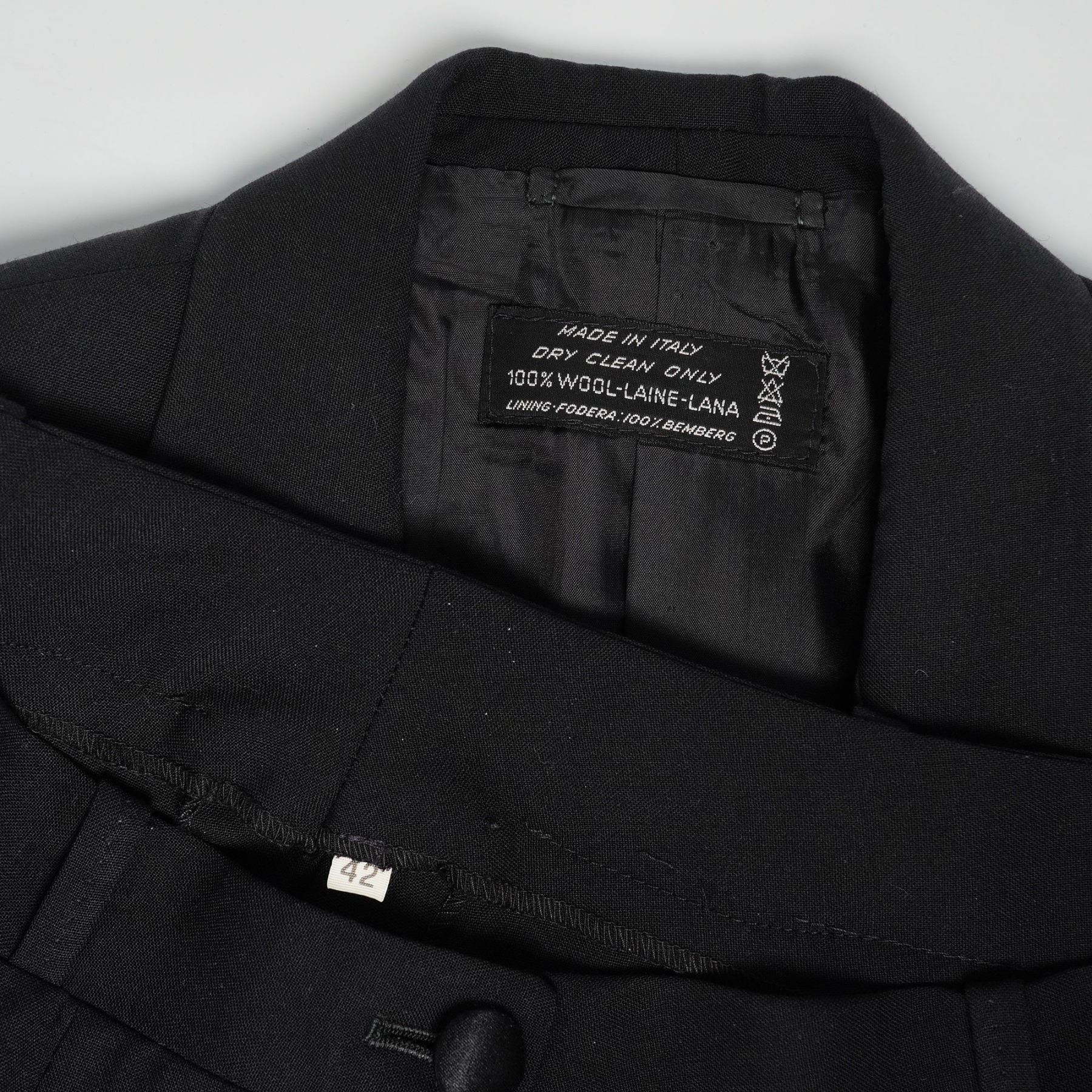 This two piece set of clothes includes an Yves St Tropez dress shirt and unmarked black pants, both size 42. The upper garment is a single breasted tuxedo blazer manufactured in Italy from 100 percent black wool. The blazer features prominent satin faced peak lapels, a single silk covered button front closure, and two front flap pockets with satin trim. The long sleeves are finished with three silk covered buttons at each cuff. The interior is fully lined in 100 percent Bemberg. The accompanying unmarked black pants are a straight leg style featuring a pleated front, waist loops, and a concealed front closure. The blazer bears the Yves St Tropez manufacturer label with a stylized ST logo and secondary tags confirming the size and material composition. This ensemble is designed in the classic smoking suit style.