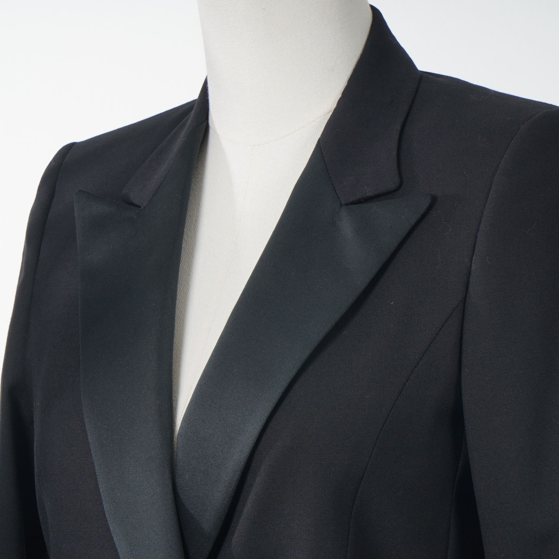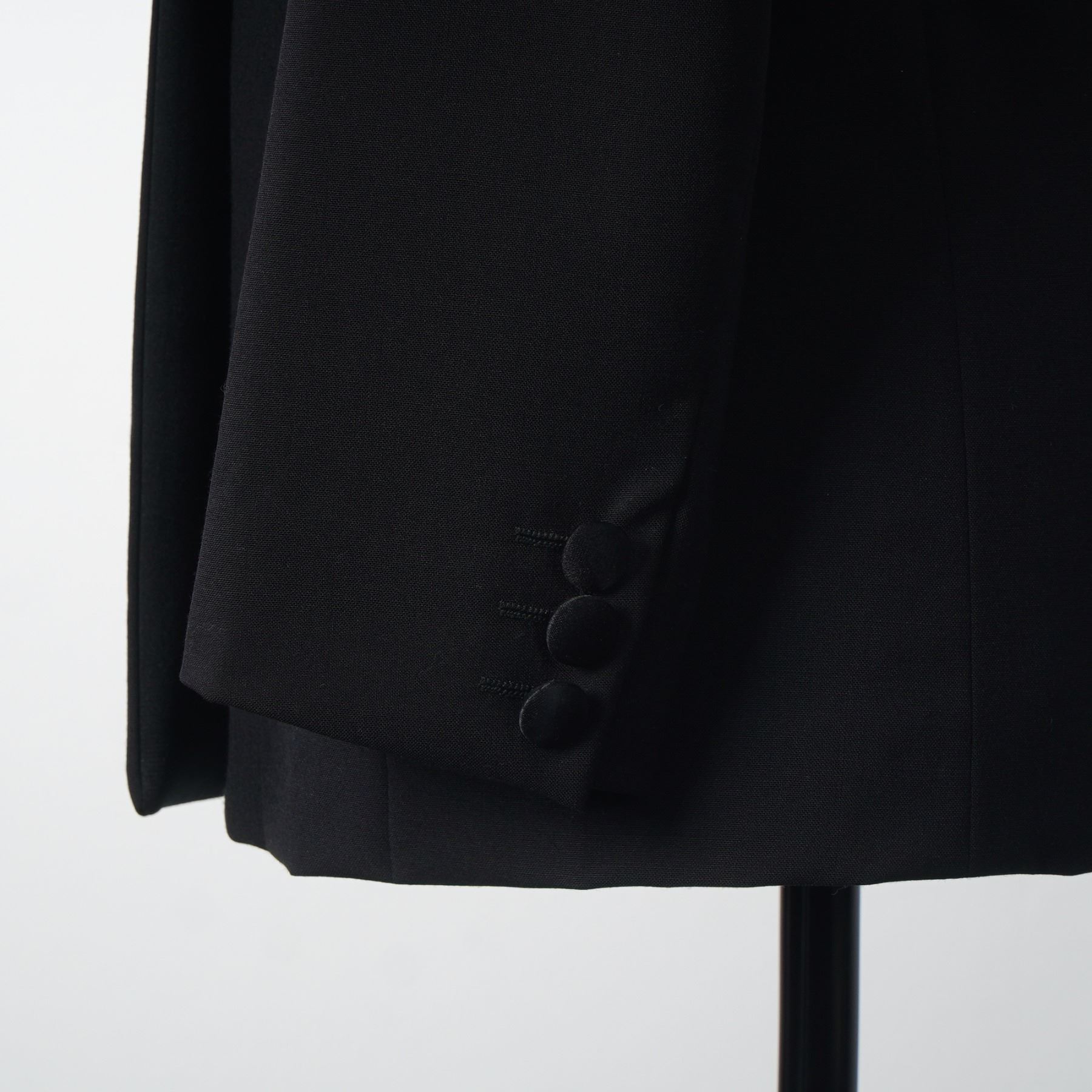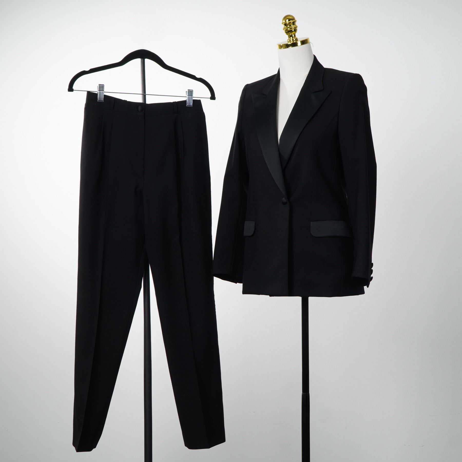 This two piece set of clothes includes an Yves St Tropez dress shirt and unmarked black pants, both size 42. The upper garment is a single breasted tuxedo blazer manufactured in Italy from 100 percent black wool. The blazer features prominent satin faced peak lapels, a single silk covered button front closure, and two front flap pockets with satin trim. The long sleeves are finished with three silk covered buttons at each cuff. The interior is fully lined in 100 percent Bemberg. The accompanying unmarked black pants are a straight leg style featuring a pleated front, waist loops, and a concealed front closure. The blazer bears the Yves St Tropez manufacturer label with a stylized ST logo and secondary tags confirming the size and material composition. This ensemble is designed in the classic smoking suit style.