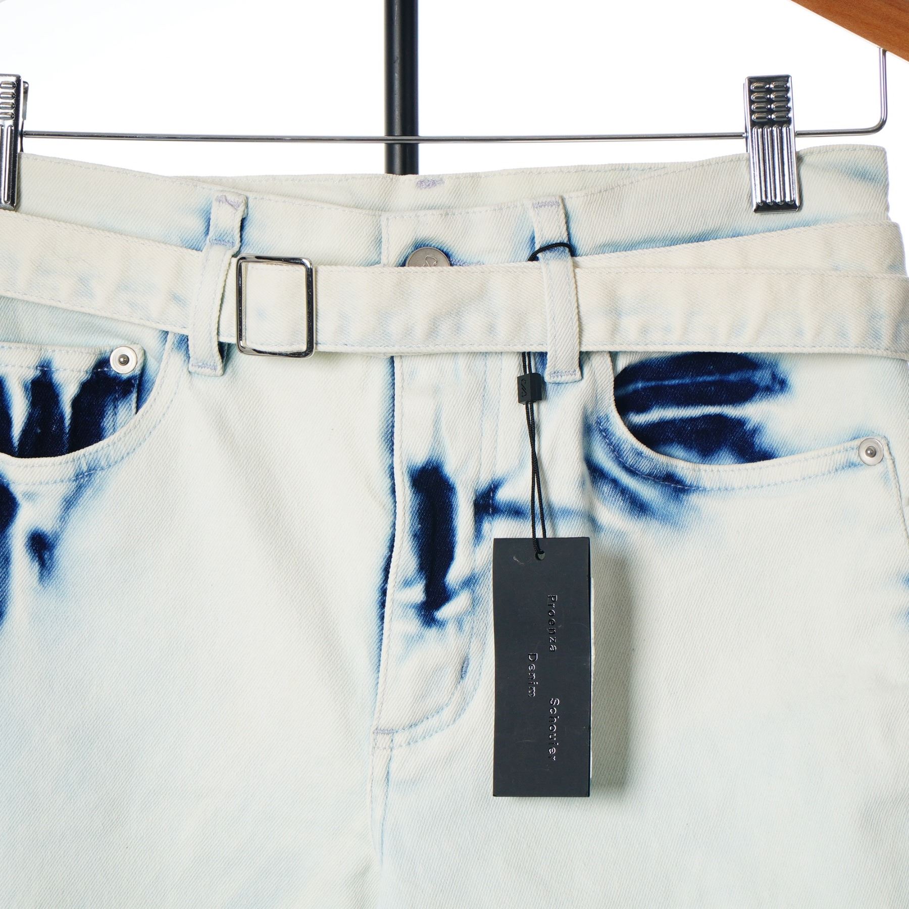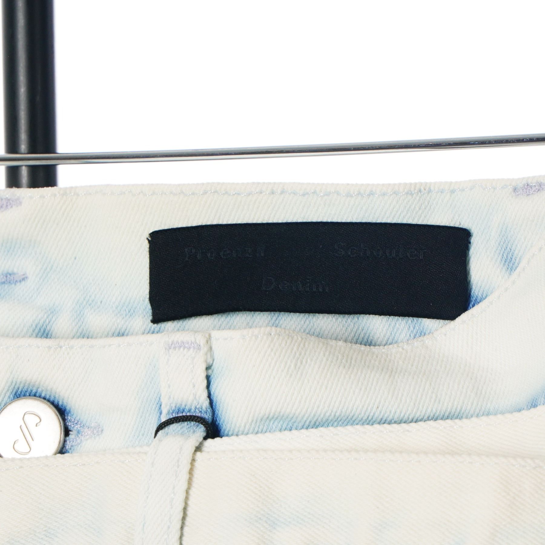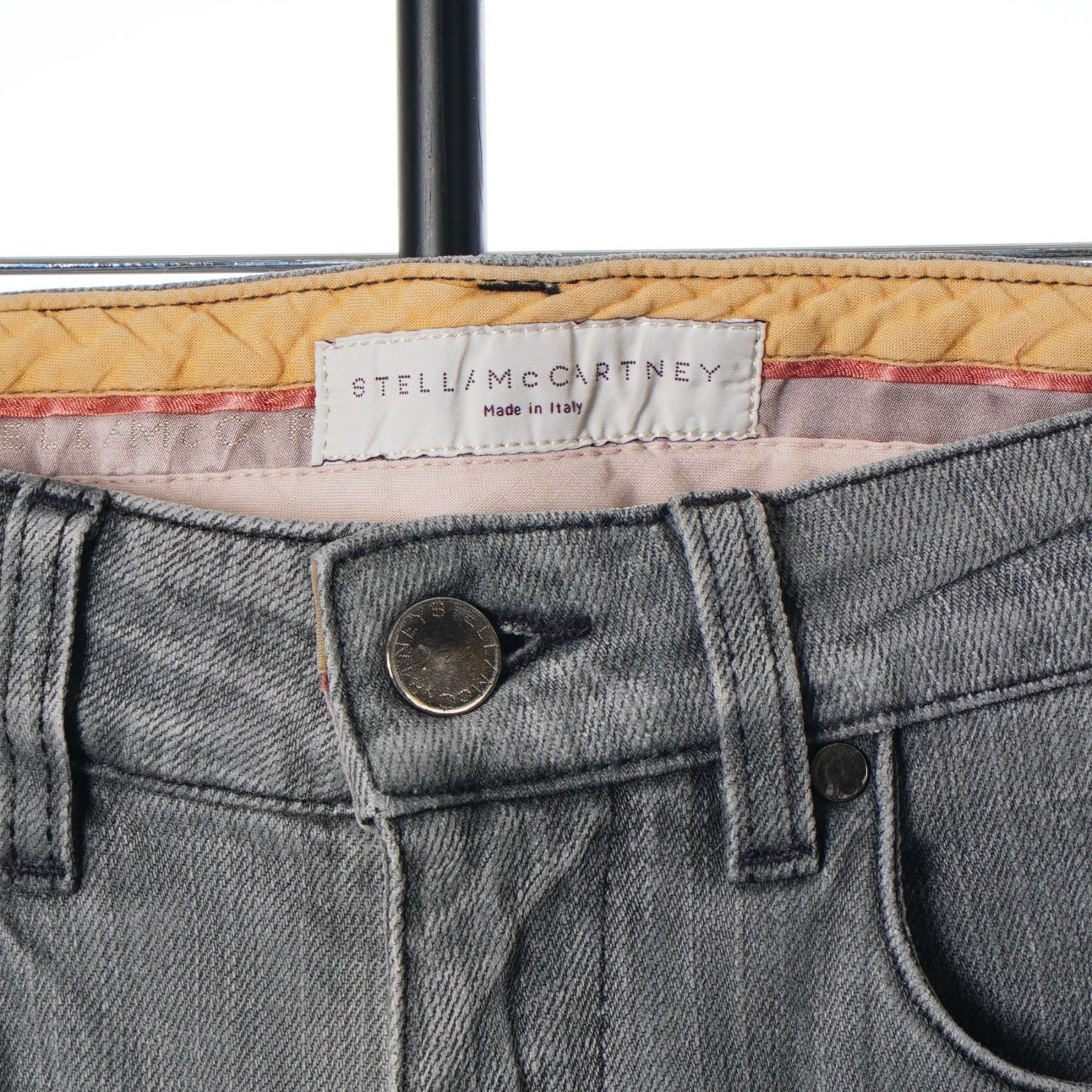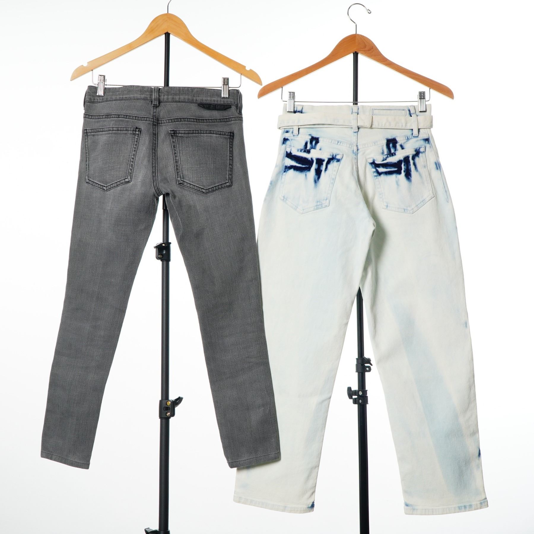 This lot features two pairs of designer denim jeans. The first pair is the Proenza Schouler Ellsworth straight-leg jean, constructed from bleached white denim with indigo-blue tie-dye accents on the pockets and side seams. This high-waisted style includes a coordinating fabric belt with a silver-tone square buckle and five-pocket styling. The interior back waistband features a black patch and the top button is embossed with a stylized PS logo, size 24. The second pair is a Stella McCartney slim-fit jean in a faded charcoal grey wash. These jeans feature tonal stitching, a five-pocket design, and a branded top button. The interior waistband label is marked Stella McCartney and indicates the garment was made in Italy. Size 27.