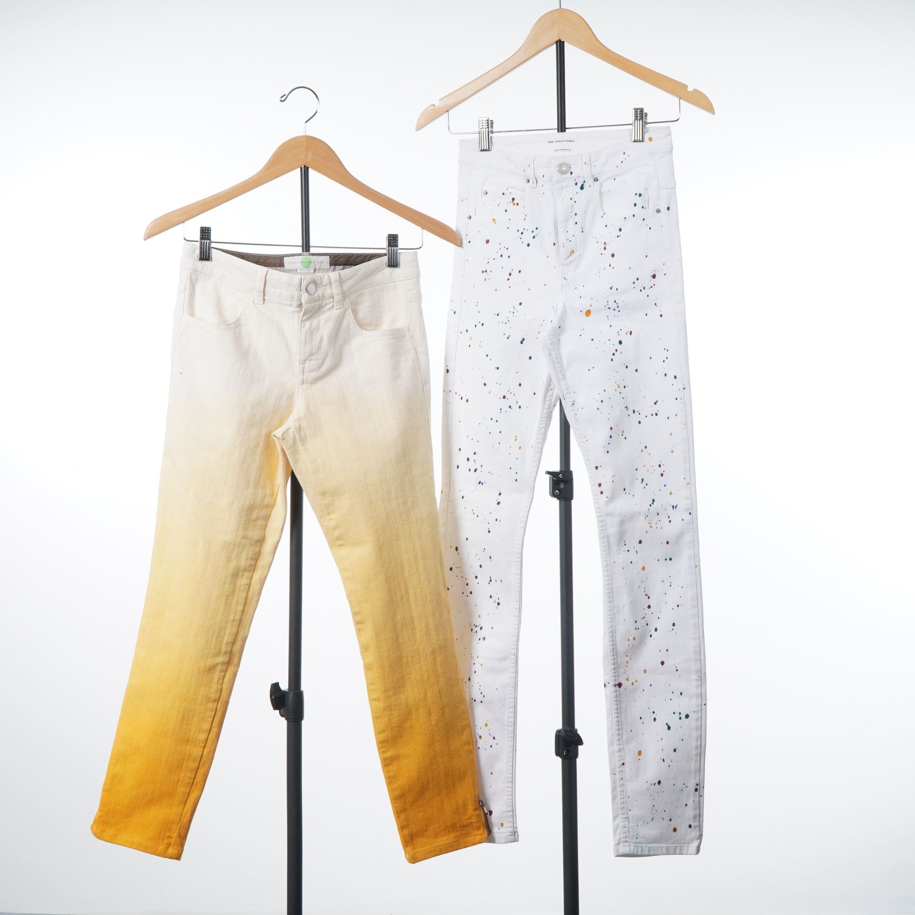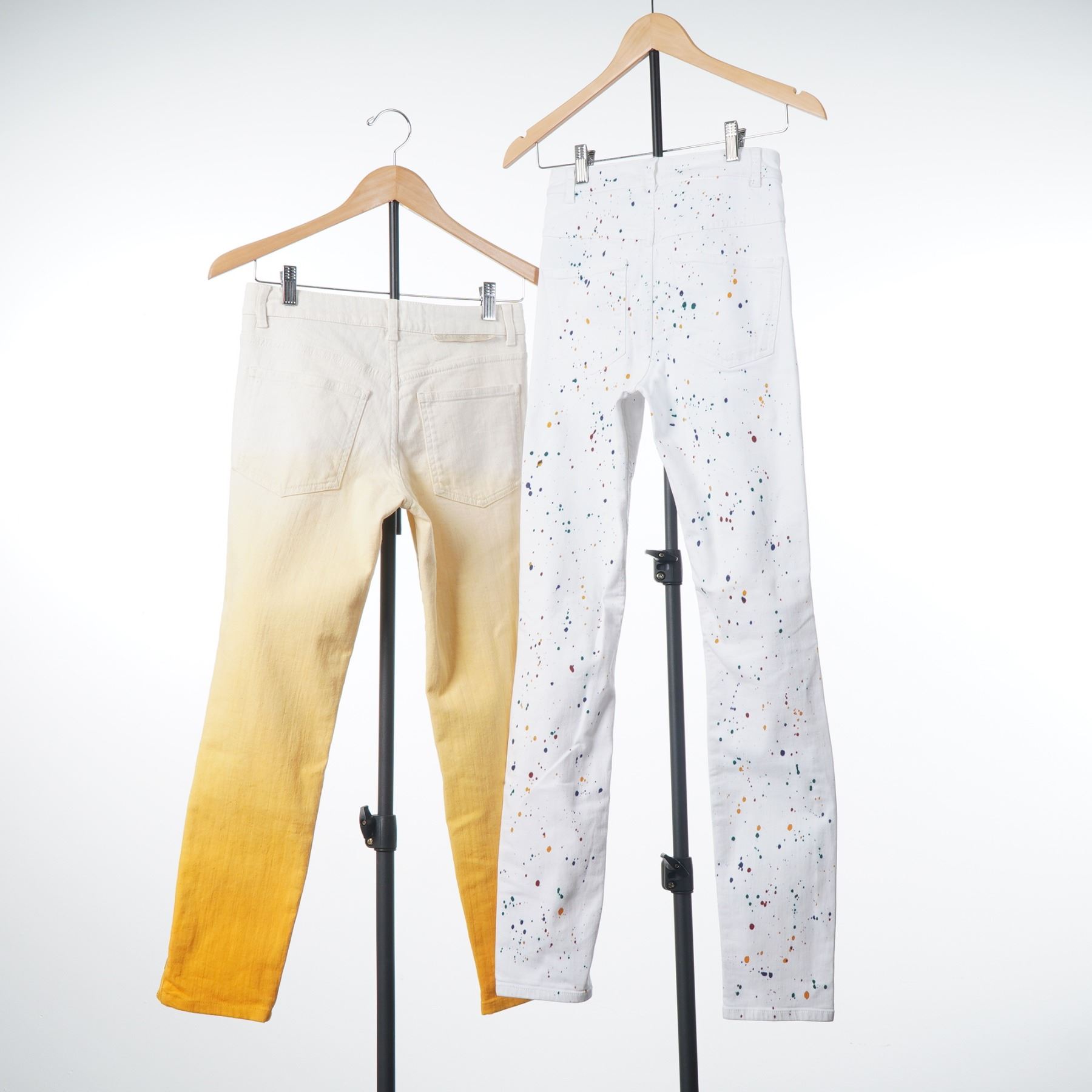 This lot features two pairs of designer pants. The first pair is by Stella McCartney, size 26, designed as five-pocket jeans in a fine-wale corduroy fabric. The colorway features a graduated ombre effect transitioning from cream at the waistband to a deep marigold yellow at the leg openings. The garment includes functional zippers at the interior ankle hems. Interior labels bear the Stella McCartney brand name and indicate the item was made in Italy. The second pair is the Brinsa model by Isabel Marant Etoile, featuring a slim-fit, five-pocket design in white denim. The fabric is decorated with a multi-colored paint splatter motif throughout in shades of red, orange, yellow, green, and blue. Interior labels bear the Isabel Marant Etoile brand name and indicate the item was made in Morocco. Size 34.