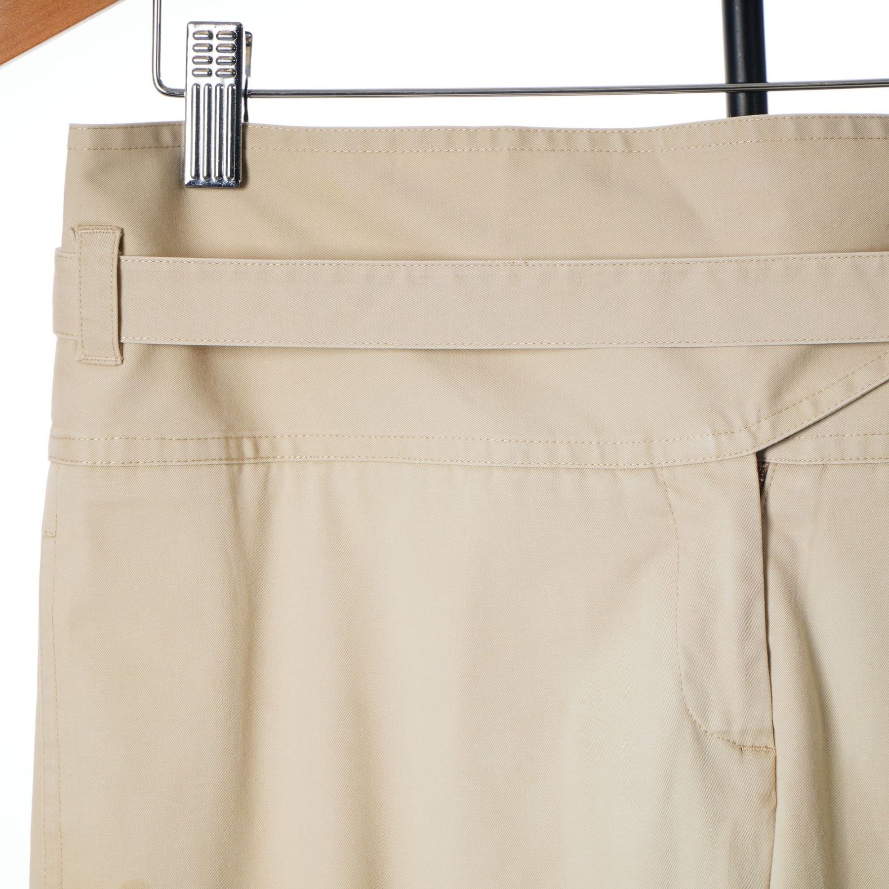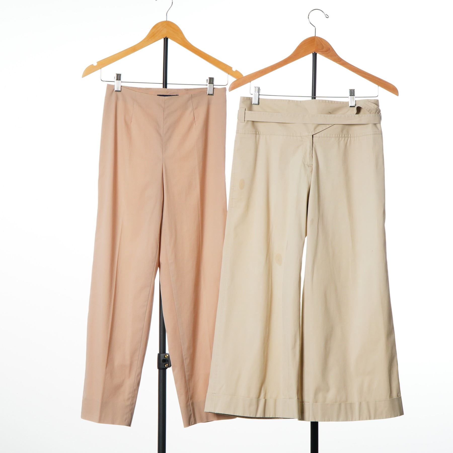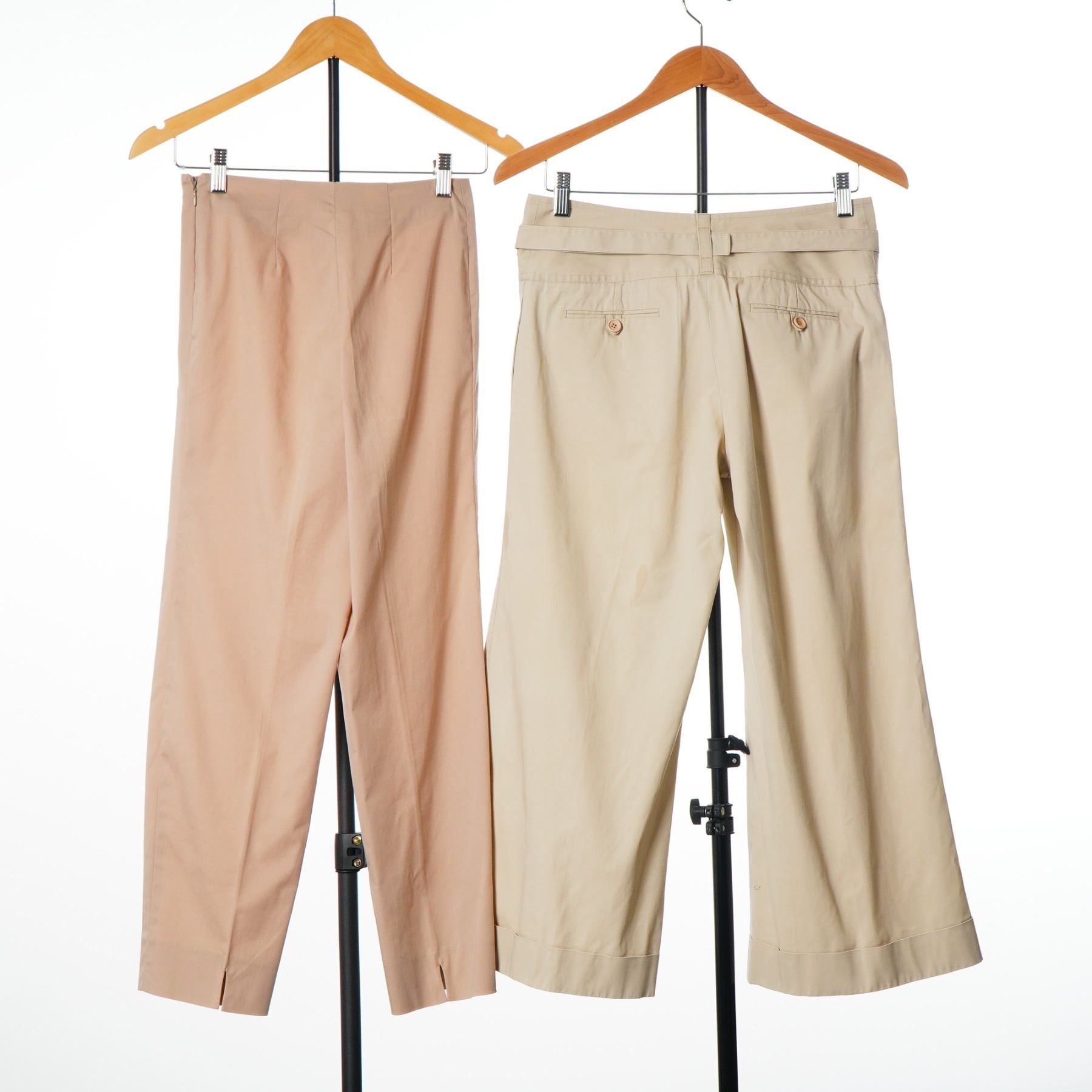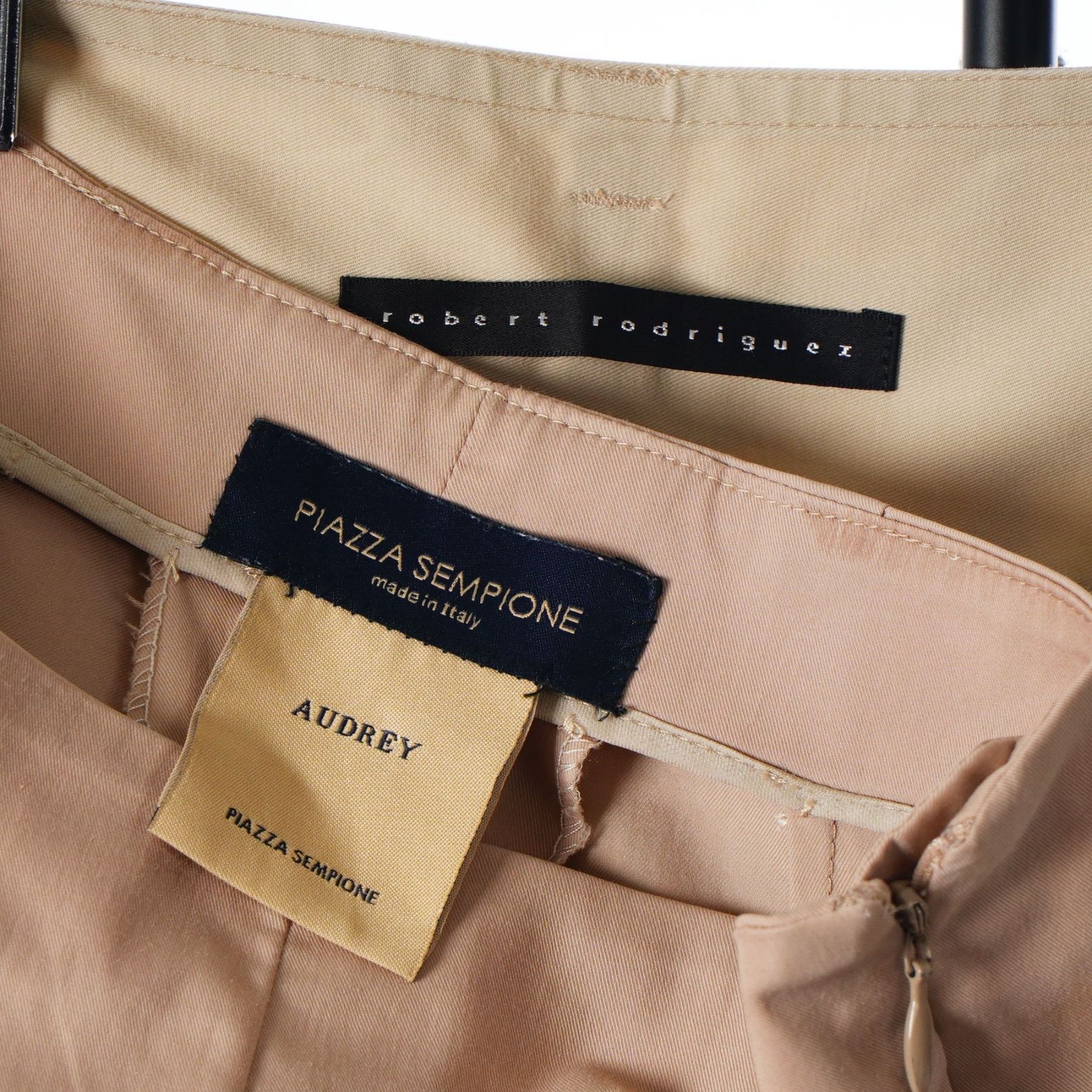 This lot features two pairs of designer women's trousers in neutral tones. The first pair is the Audrey model by Piazza Sempione, waist 26 inches, Length 34 inches, made in Italy. These slim-leg trousers are crafted from a dusty rose pinkish-tan fine twill weave and feature a high-waisted, flat-front design with a side-zip closure and small vents at the ankle hems. The second pair consists of Robert Rodriguez, size 2, side pleat wide-leg cropped capri pants in light beige khaki cotton twill. This garment features a high-waisted silhouette with a wide matching fabric belt, deep-set hems, and buttoned welt pockets at the rear.