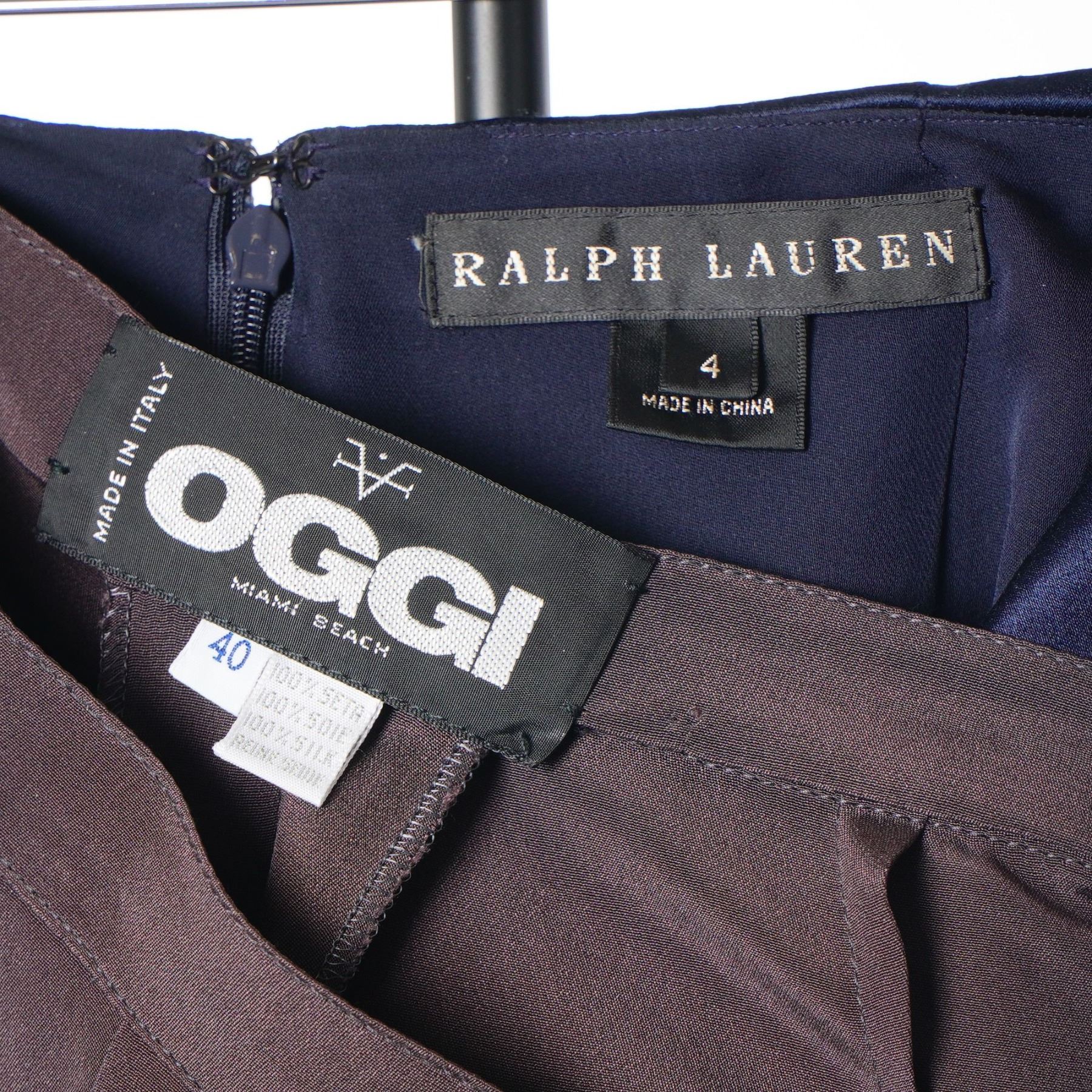 This lot features two pairs of luxury wide-leg trousers. The first pair is a navy blue garment by Ralph Lauren, featuring a satin finish and a fluid silhouette. The trousers are designed with a flat-front waistband and a rear zipper closure. Interior labels identify the brand as Ralph Lauren, size 4. The second pair is a dark plum or aubergine silk trouser by OGGI Miami Beach. This Italian-made garment is constructed from 100 percent silk and features front pleats, side-seam pockets, and a side zipper with a button closure. The interior label identifies the maker as OGGI Miami Beach, size 40, which corresponds to a US size 4. Both items are consistent with high-end designer retail sizing and styling.