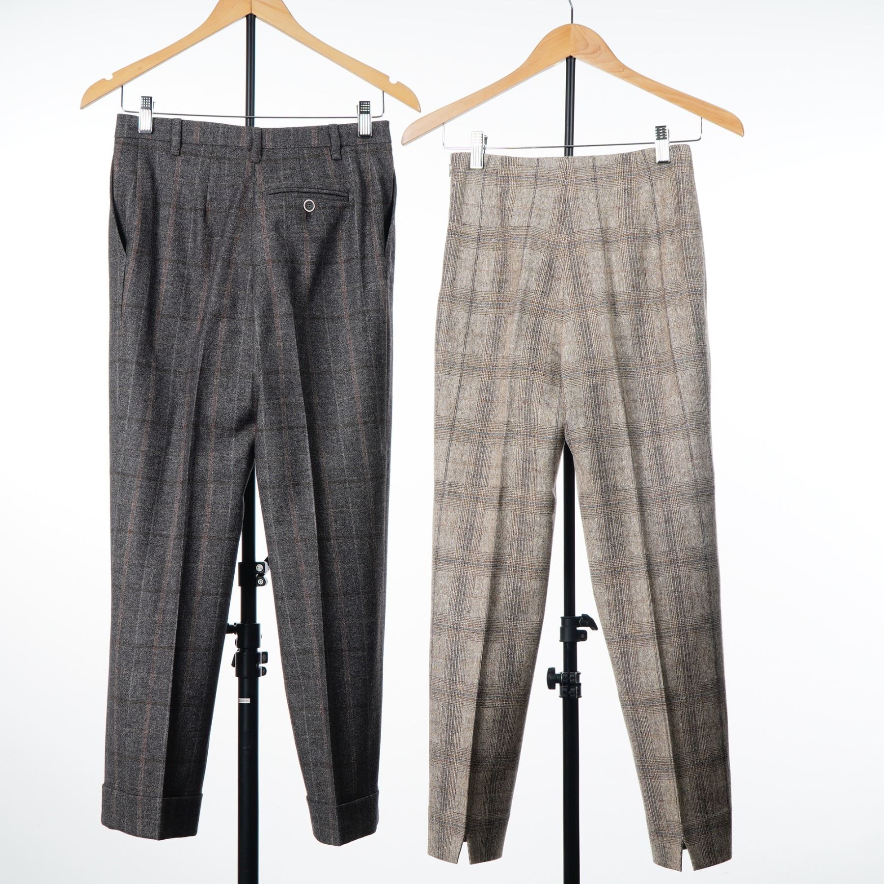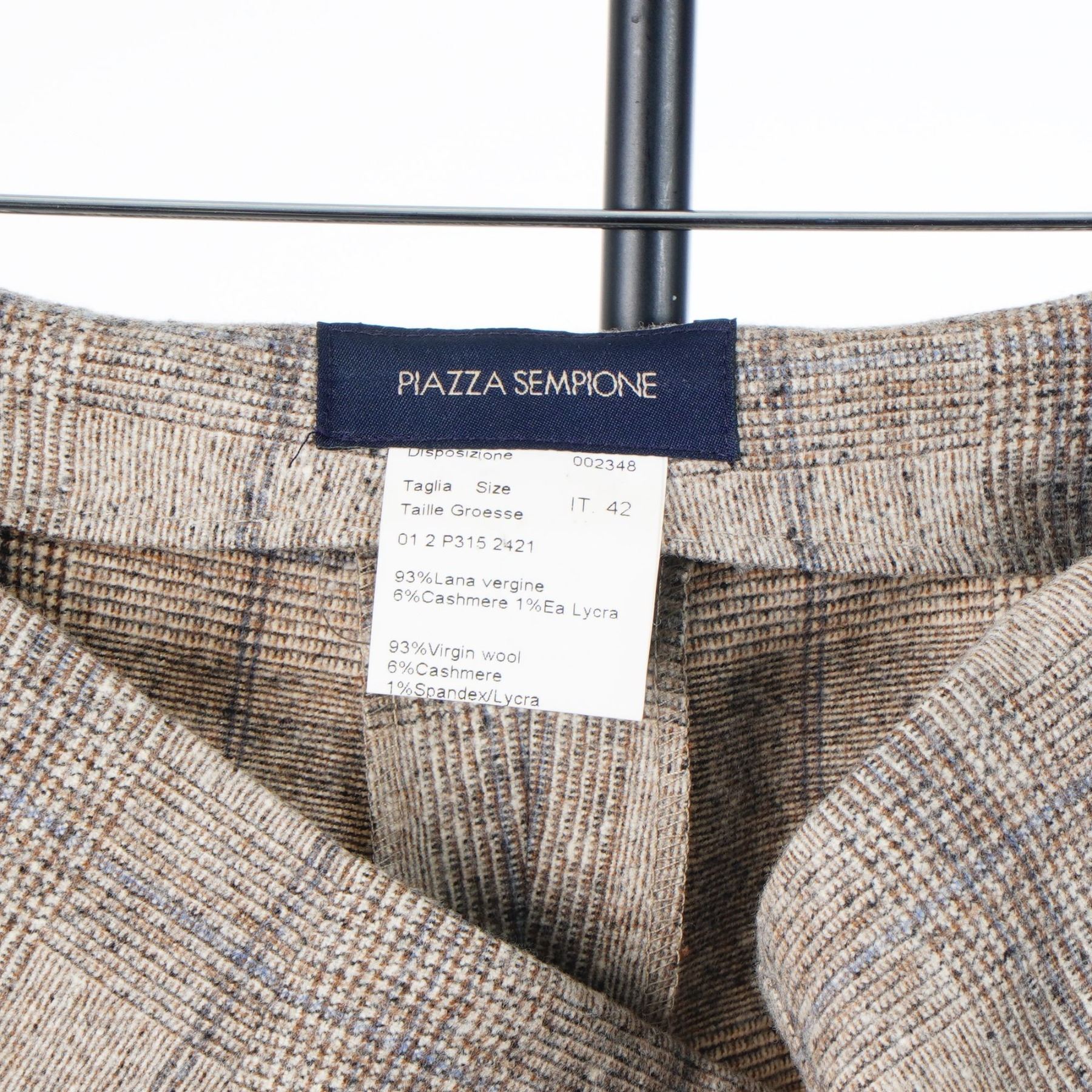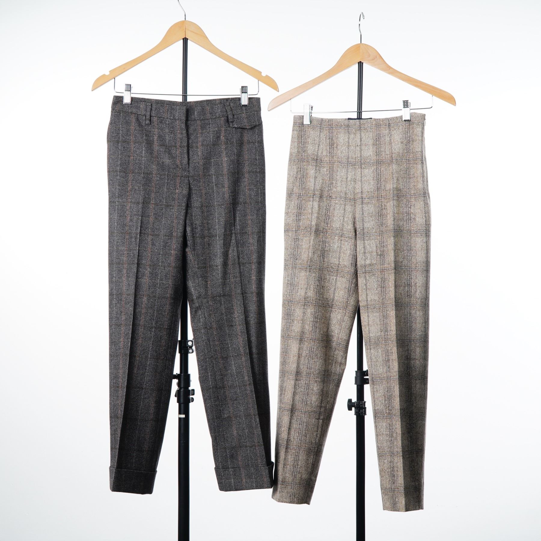 This lot features two pairs of women's designer trousers manufactured in Italy. The first pair is by Piazza Sempione, featuring a beige and tan glen plaid pattern with brown and blue accents. The fabric composition is 93 percent virgin wool, 6 percent cashmere, and 1 percent spandex/lycra. These trousers are designed with a high-rise waist, tapered leg, and a split-hem detail at the ankle. They are labeled as an Italian size 42. The second pair is a gray wool-blend flannel with a charcoal and pink plaid overcheck. This pair features a high-rise, straight-leg silhouette with cuffed hems, belt loops, side seam pockets, and a single button-through welt pocket on the reverse. This pair is a size 6.