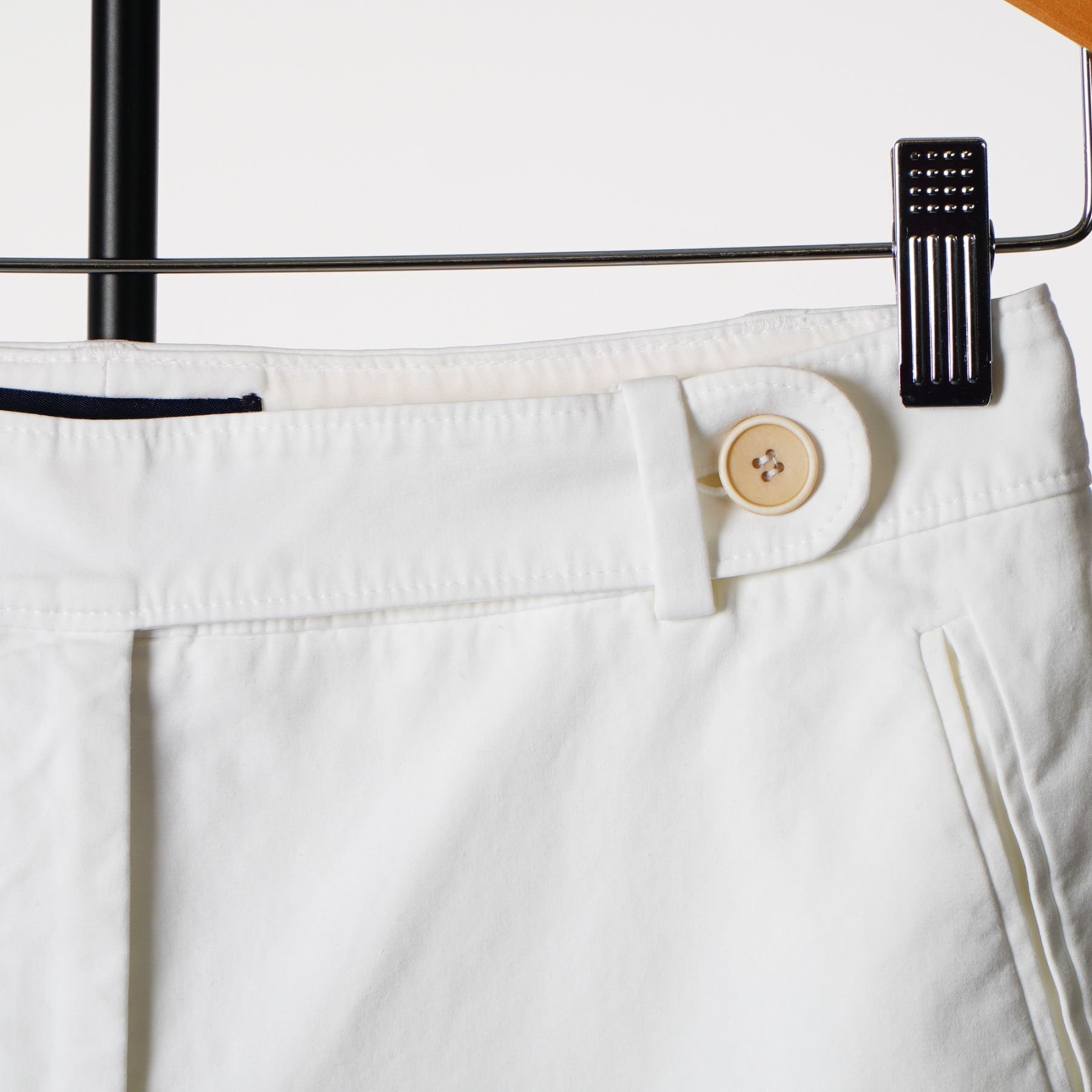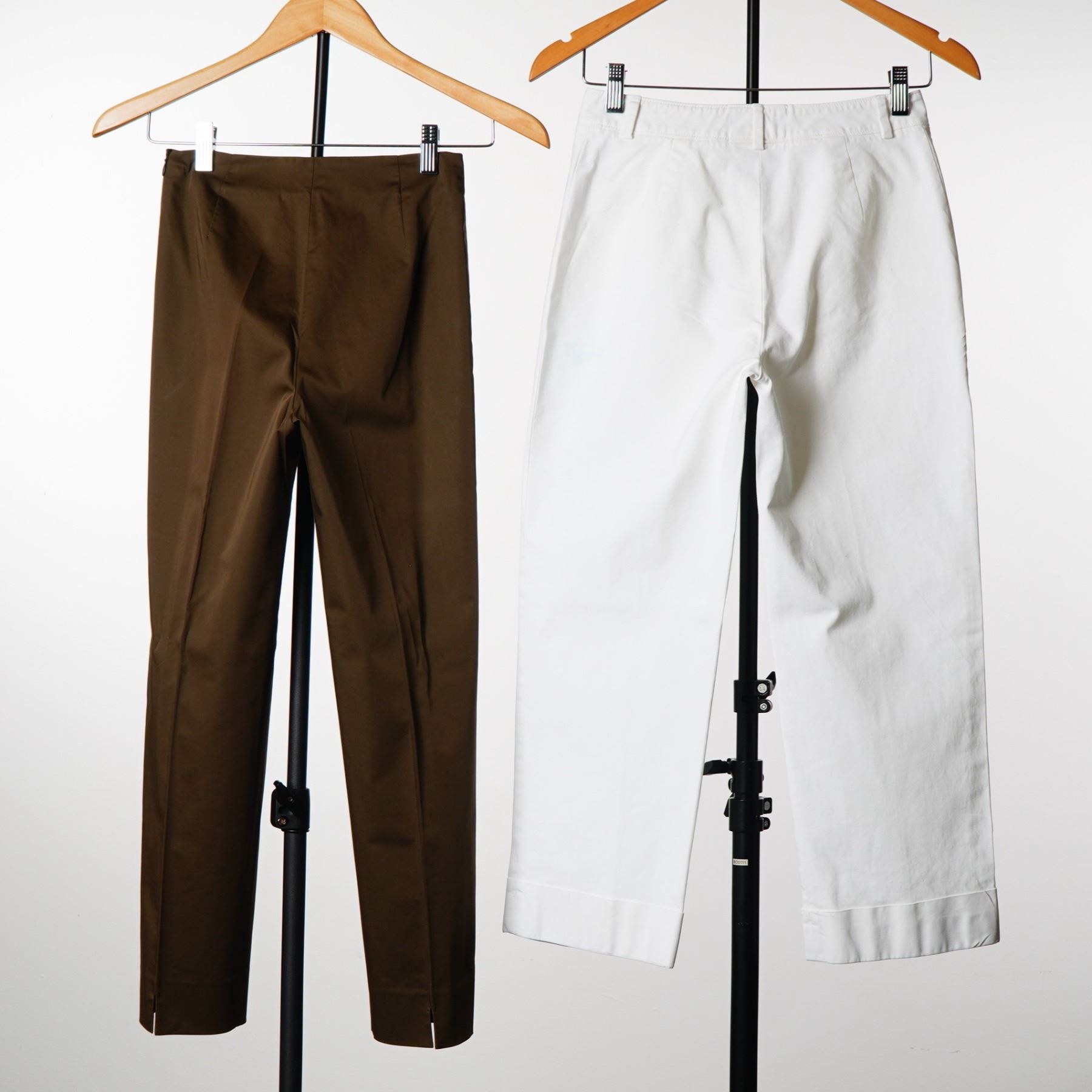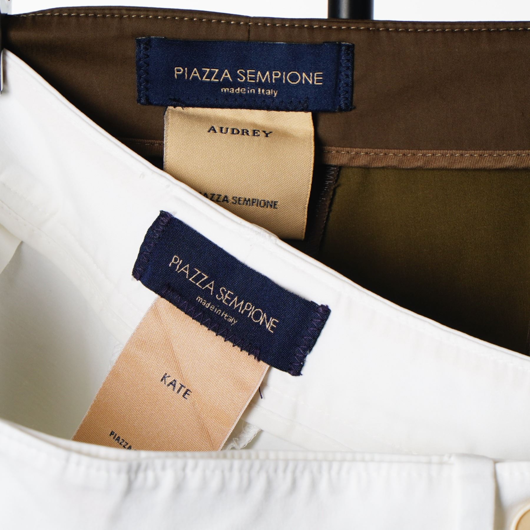 This lot includes two pairs of women's trousers by Piazza Sempione, both made in Italy. The first pair, the Audrey model, is a slim-fit capri trouser rendered in a copper-toned dark olive brown. Design details include a flat front, side-zip closure, and subtle vent slits at the outer ankle hems. Approximate measurements: 11.25 inches across the waist when laid flat; 34 inches in length. The second pair, the Kate model, is a wide-leg trouser in white. Features include a waistband with belt loops, a single-button closure with a light brown horn-style button, and cuffed hems. Approximate measurements: 13 inches across the waist when laid flat; 33 inches in length.