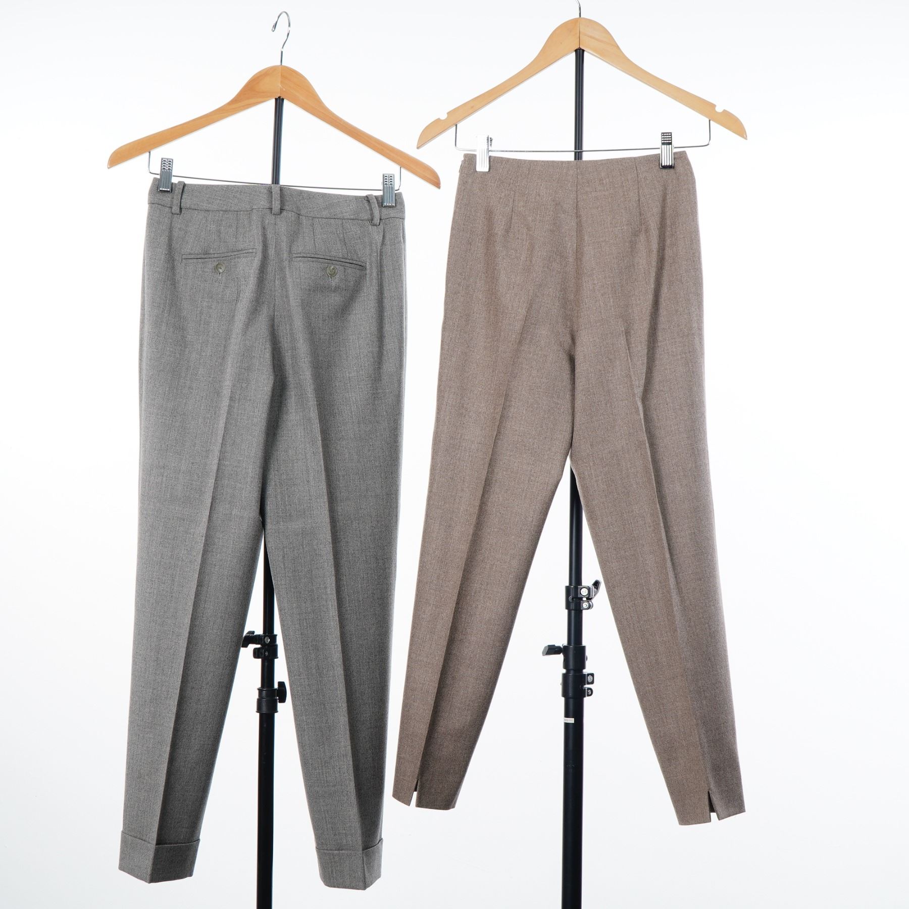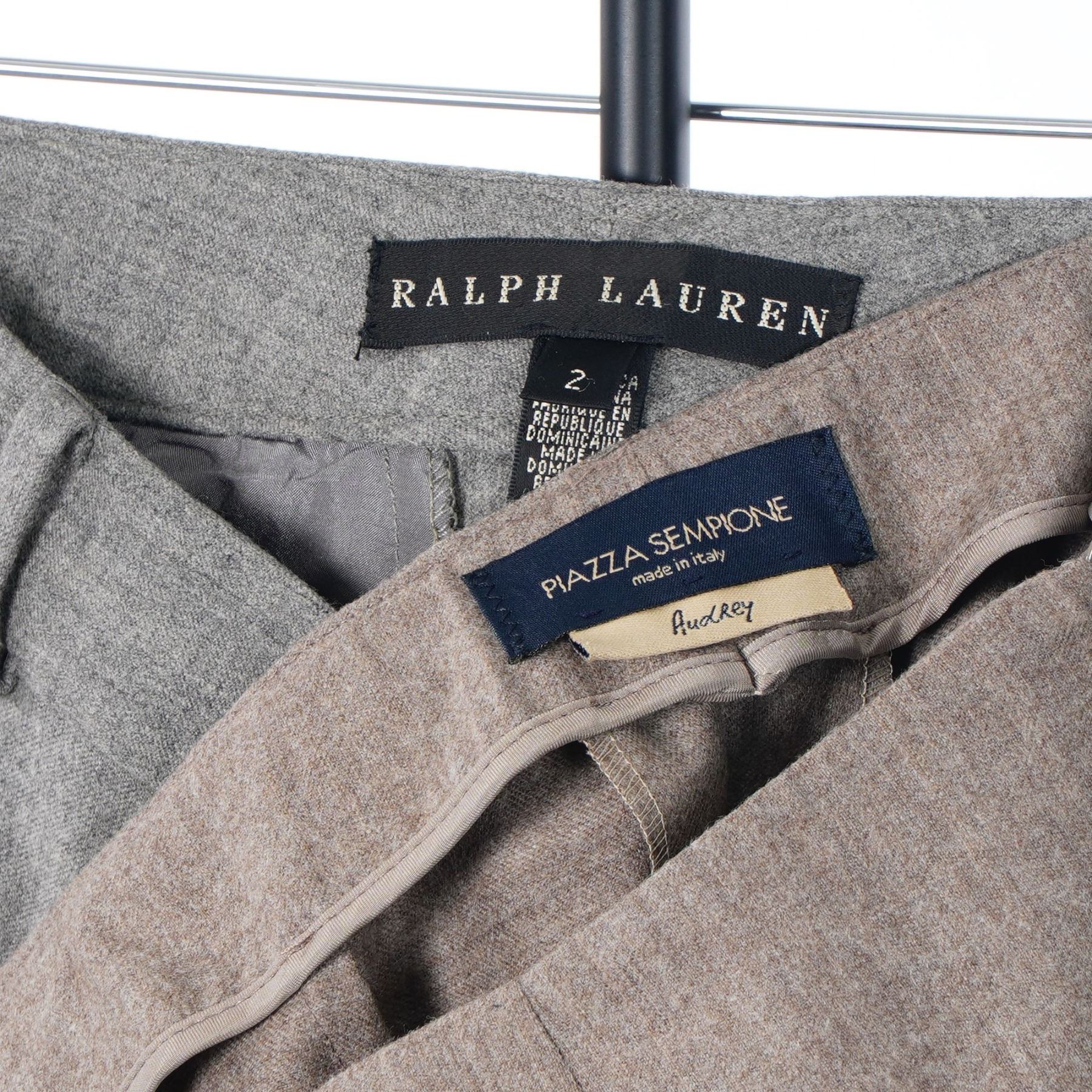 This lot features two pairs of designer women's tailored trousers. The first pair is by Ralph Lauren, crafted from a grey heather wool or wool-blend suiting fabric. The construction includes a front zip fly with button closure, belt loops, and two rear welt pockets with button-through closures. The legs are finished with permanent cuffs. The interior label is marked Ralph Lauren, size 2, and made in the Dominican Republic. The second pair is the Audrey model by Piazza Sempione, made from a taupe heather fine weave fabric. These trousers are designed with a high-waisted, slim-fit silhouette and a tapered leg. They feature a clean waistline without belt loops and small vents at the back of each ankle hem. The interior labels include the Piazza Sempione brand name, a made in Italy designation, and the Audrey model tag, size S.