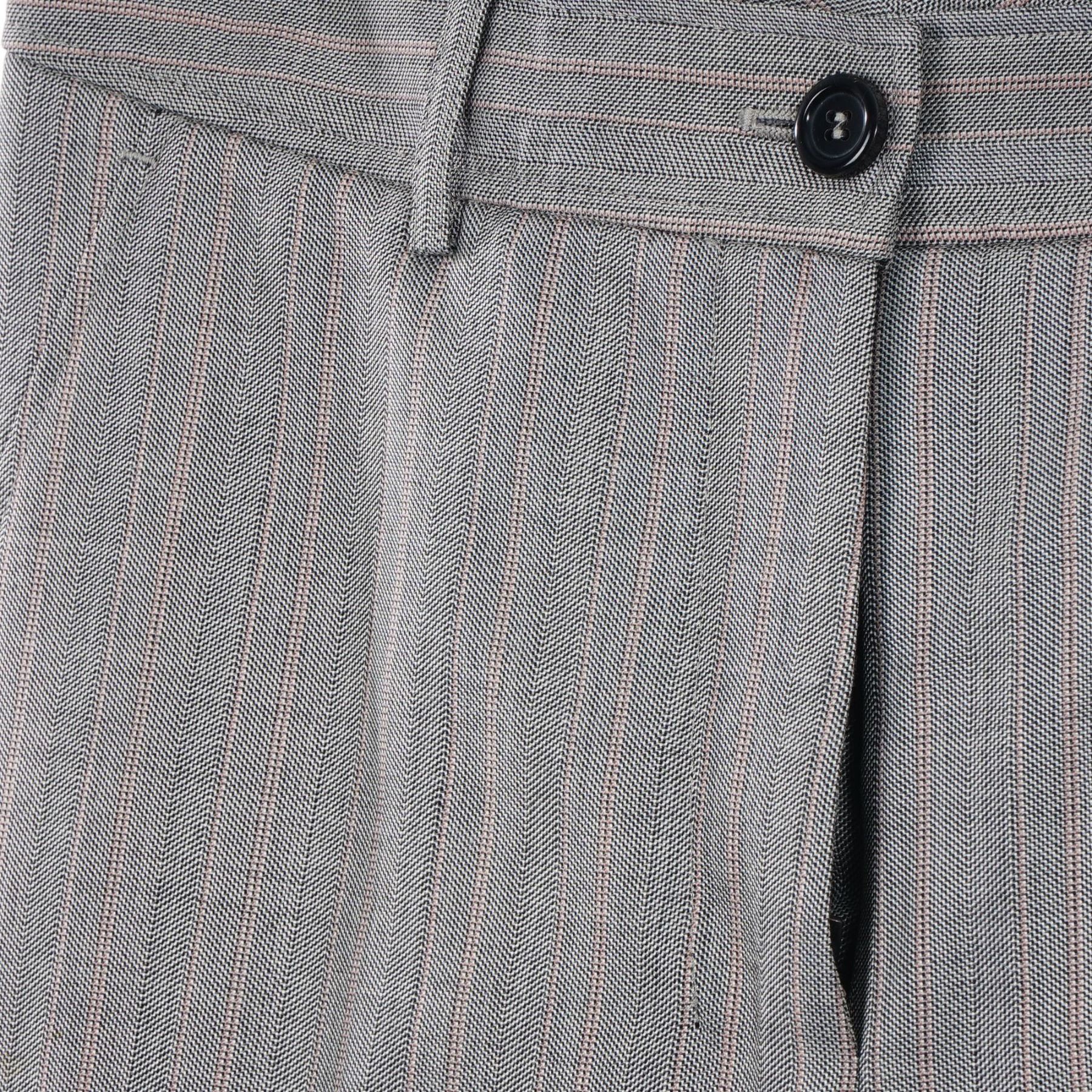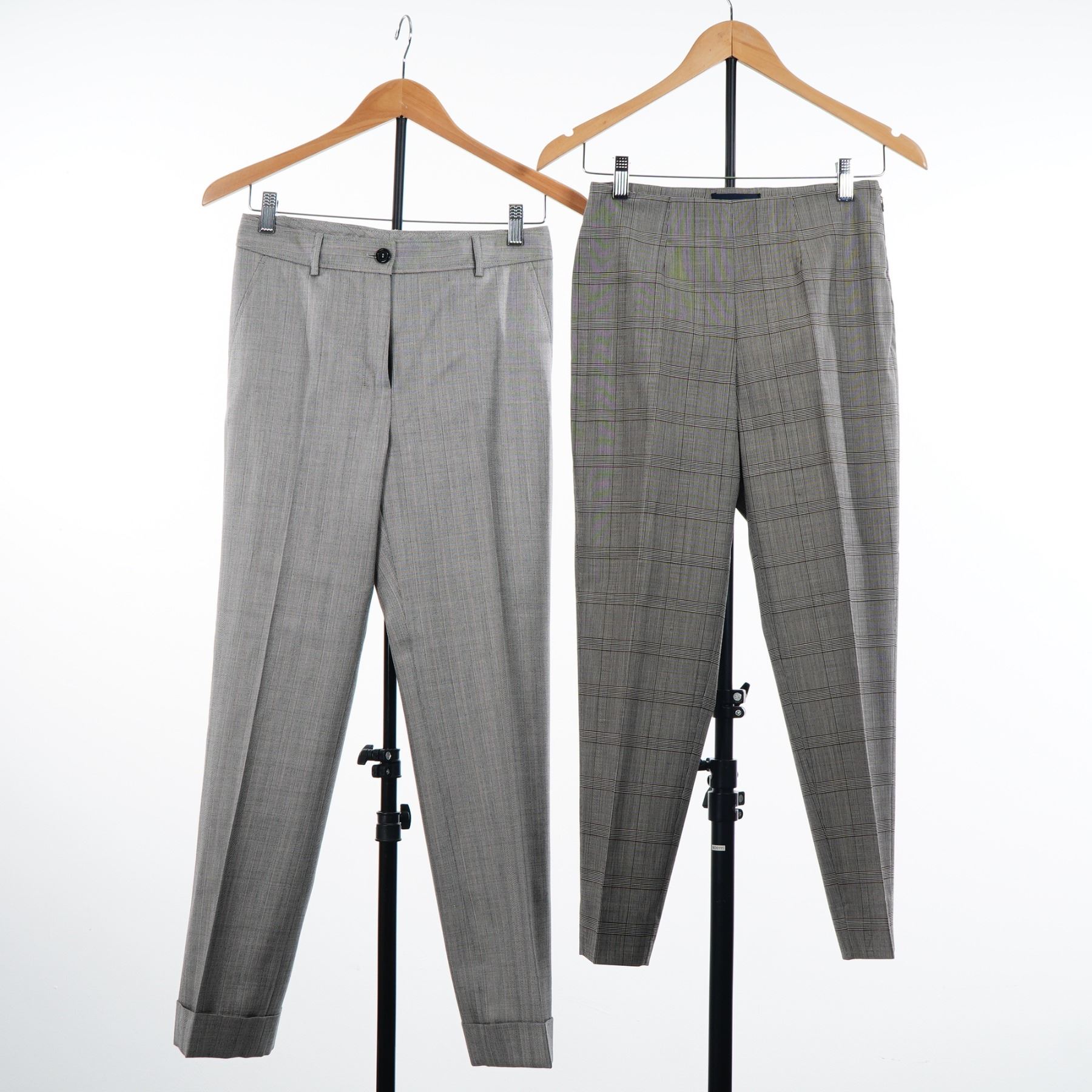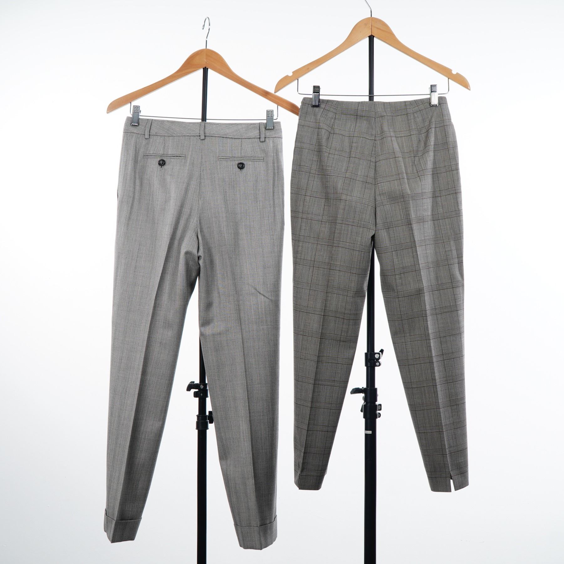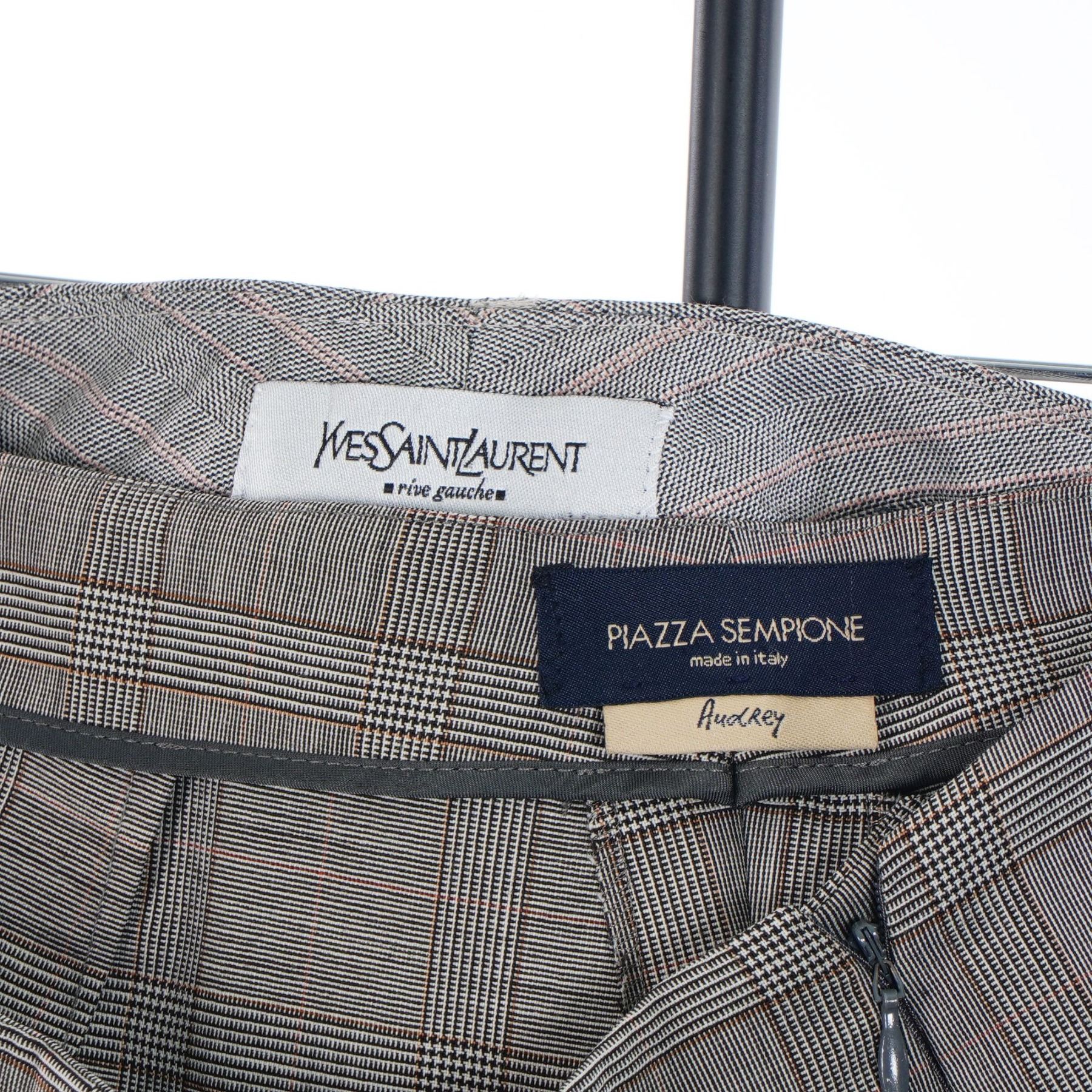 This lot consists of two pairs of women's designer trousers. The first pair is by Yves Saint Laurent Rive Gauche, size S, featuring a tailored straight-leg silhouette. The garment is constructed from a grey herringbone weave fabric accented with fine vertical pink pinstripes. Design elements include a fly front with a single black button at the waistband, belt loops, and two buttoned welt pockets at the rear. The legs are finished with a wide-cuffed hem. The interior waistband bears a white fabric label marked Yves Saint Laurent rive gauche. The second pair is by Piazza Sempione in the Audrey fit, size 40. These are slim-fitting, flat-front tapered trousers featuring a grey glen plaid pattern with a subtle rust-red overcheck. The design includes a side-zip closure and small vents at the outer ankles. The interior waistband contains a navy blue label marked Piazza Sempione made in Italy and a secondary tan tag marked Audrey.