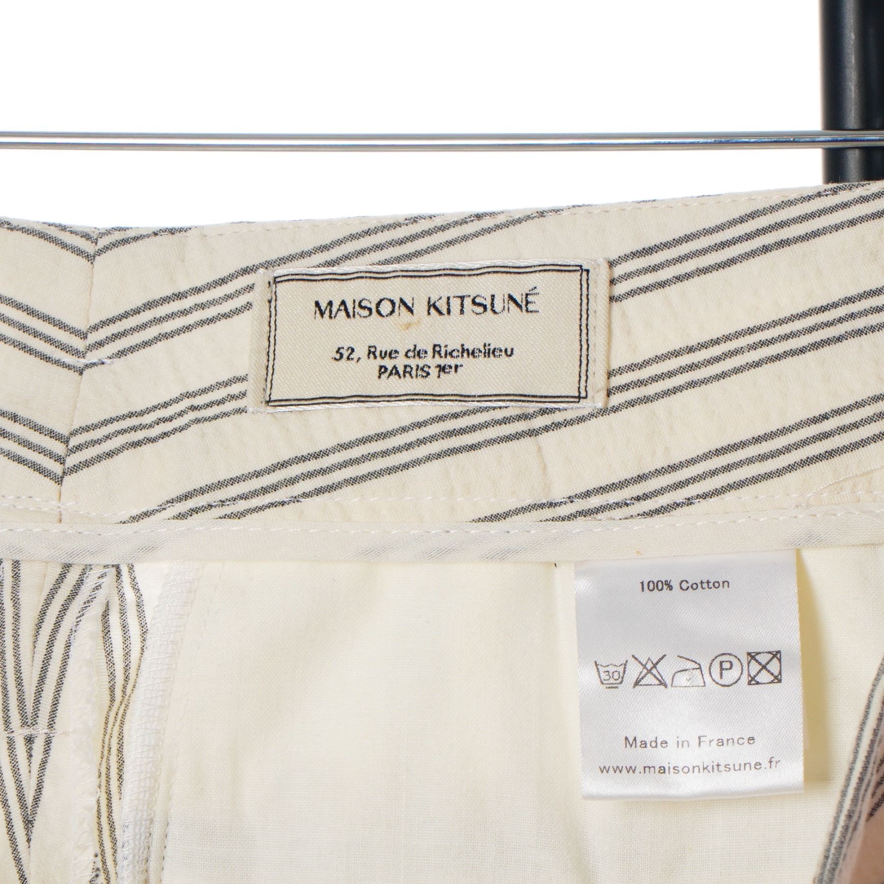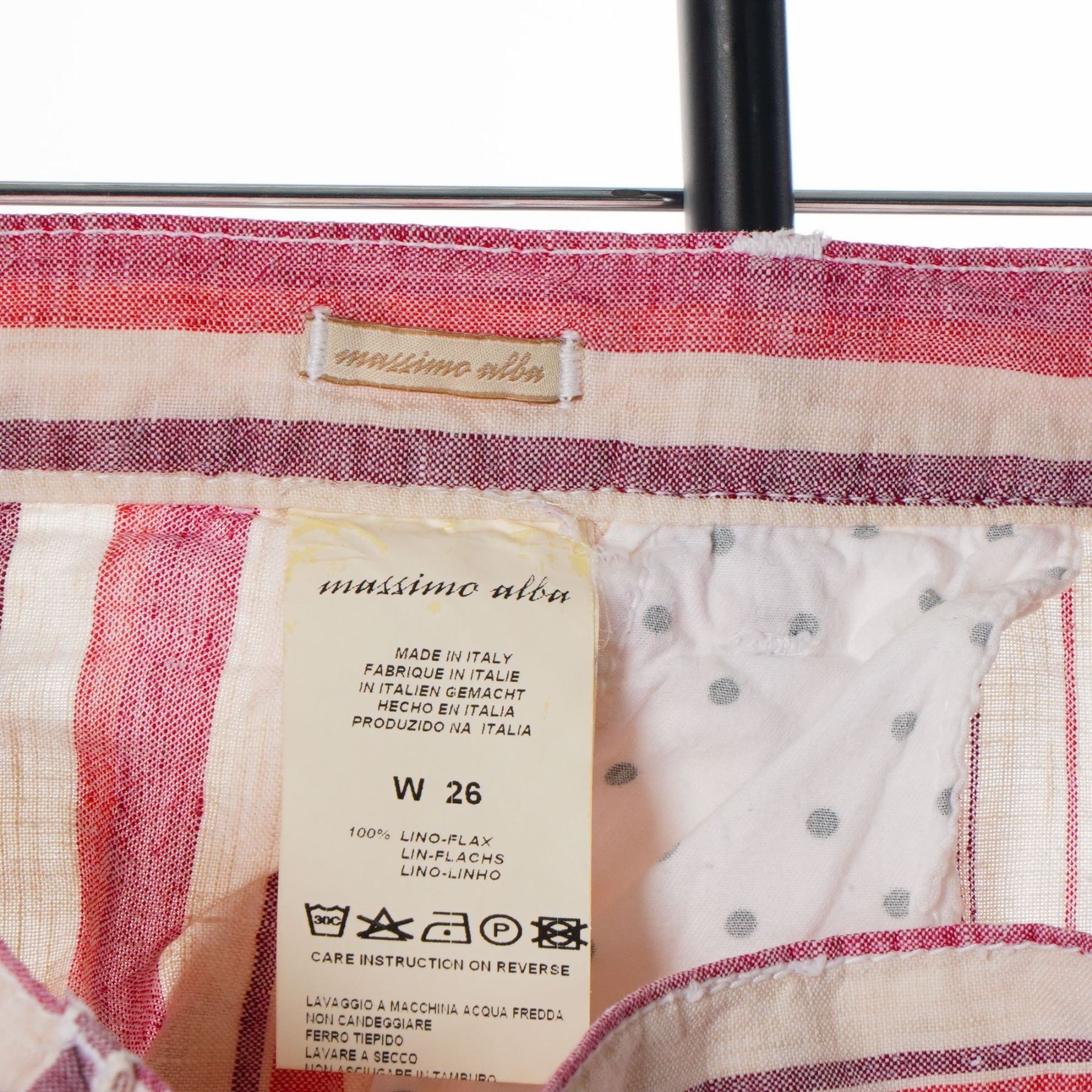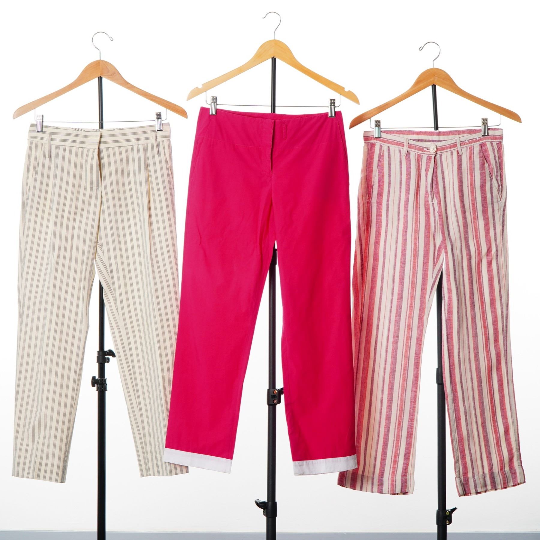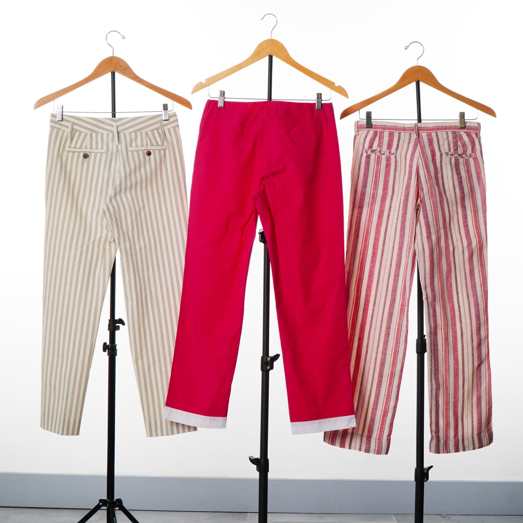 This lot consists of three pairs of designer trousers from Maison Kitsune, Jil Sander, and Massimo Alba. The Maison Kitsune trousers are crafted from 100 percent cotton in a cream ground with thin dark navy vertical stripes and have a 28" waist. The garment features front pleats, slanted side pockets, and two rear welt pockets with button closures in a tapered leg silhouette. Interior labels identify the maker and the 52 Rue de Richelieu Paris address, with a care tag stating the piece was made in France. The Jil Sander trousers, size 34, are a straight-leg design in solid magenta with wide, sewn-in white contrast cuffs at the hem. The interior waistband is labeled Jil Sander Made in Italy. The Massimo Alba trousers, size 26, are made of 100 percent linen with multi-width red and pink vertical stripes. These straight-leg trousers include a polka-dot pattern pocket lining and are labeled Massimo Alba Made in Italy.