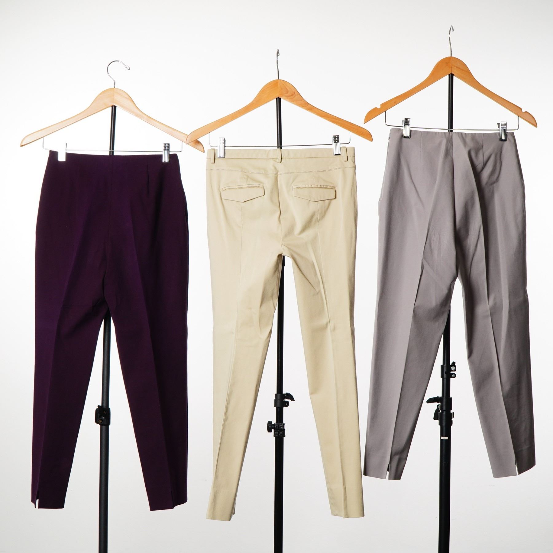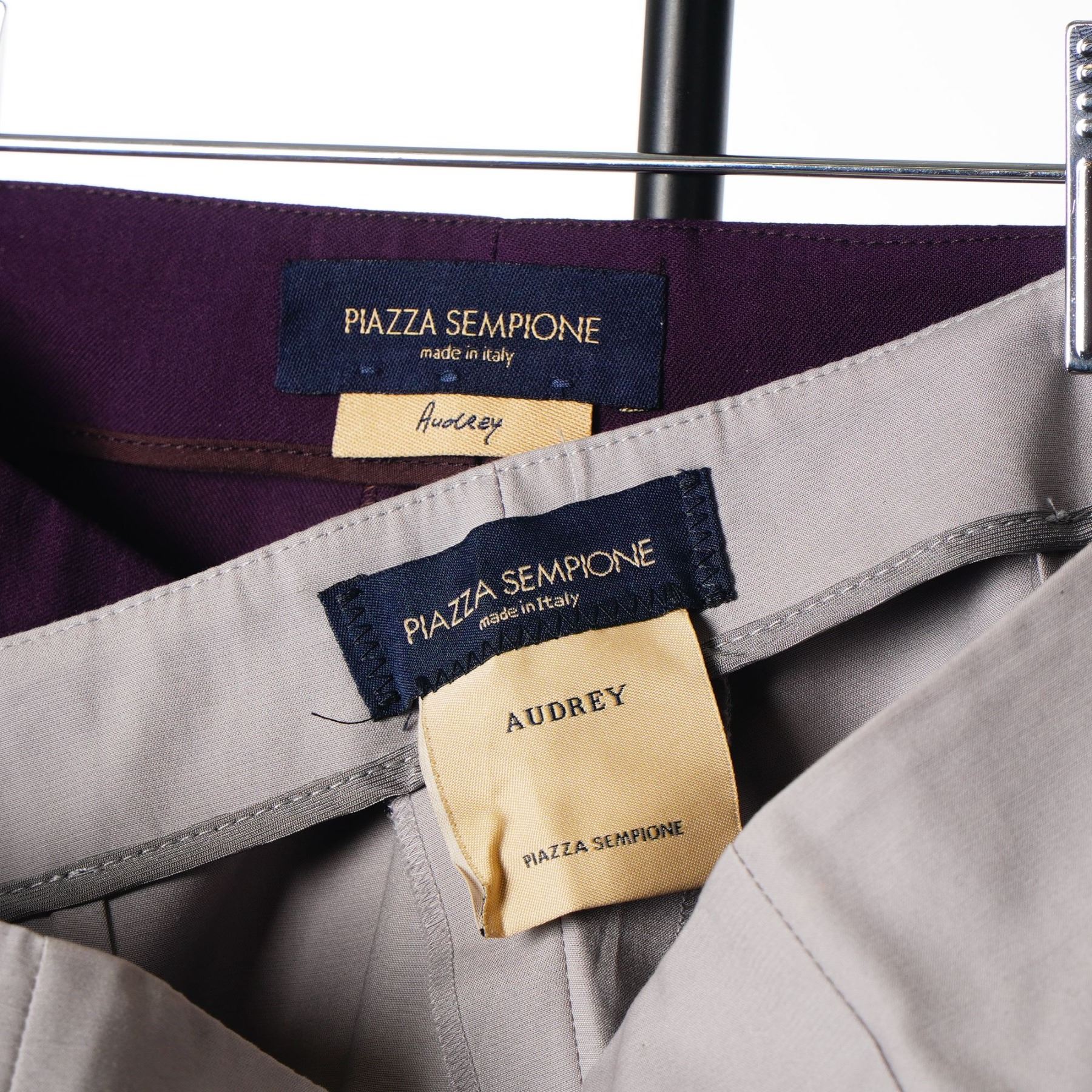 This collection consists of three pairs of designer women's trousers manufactured in Italy. The group includes two pairs of Piazza Sempione trousers in the Audrey silhouette and one pair of Loro Piana tailored trousers. The Piazza Sempione Audrey trousers are featured in deep plum and light grey. They are designed with a slim-fit, tapered leg, a clean flat-front waistband with a side-zip closure, and small vents at the outer hem. The Loro Piana trousers are a classic straight-leg design in a beige sand color. They feature a front zip fly with a button tab closure, belt loops, front slant pockets, and two rear welt pockets with button-down flaps. The legs have a defined central crease. Labels indicate all garments were made in Italy. Fabric content includes wool and cotton blends. Size: 38.