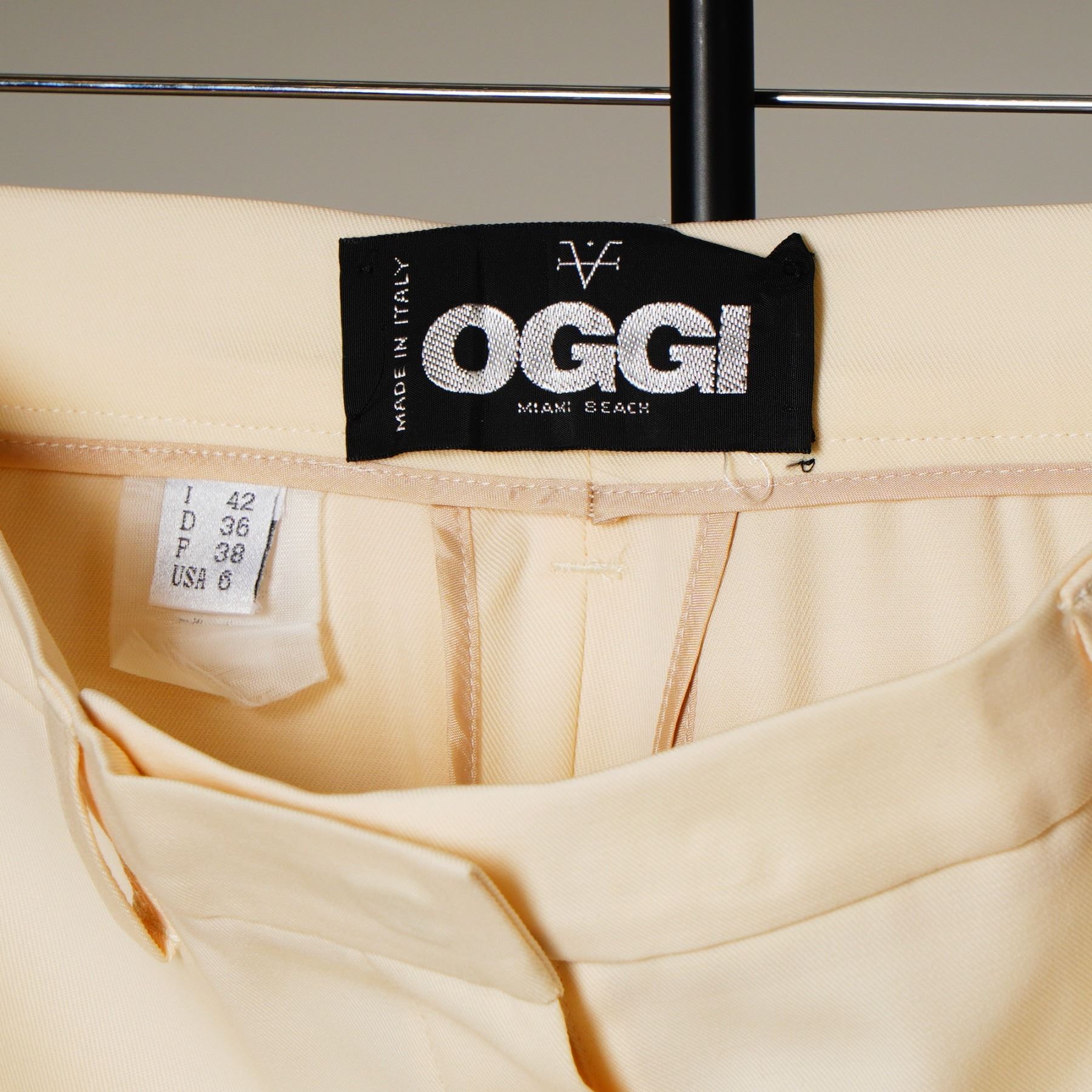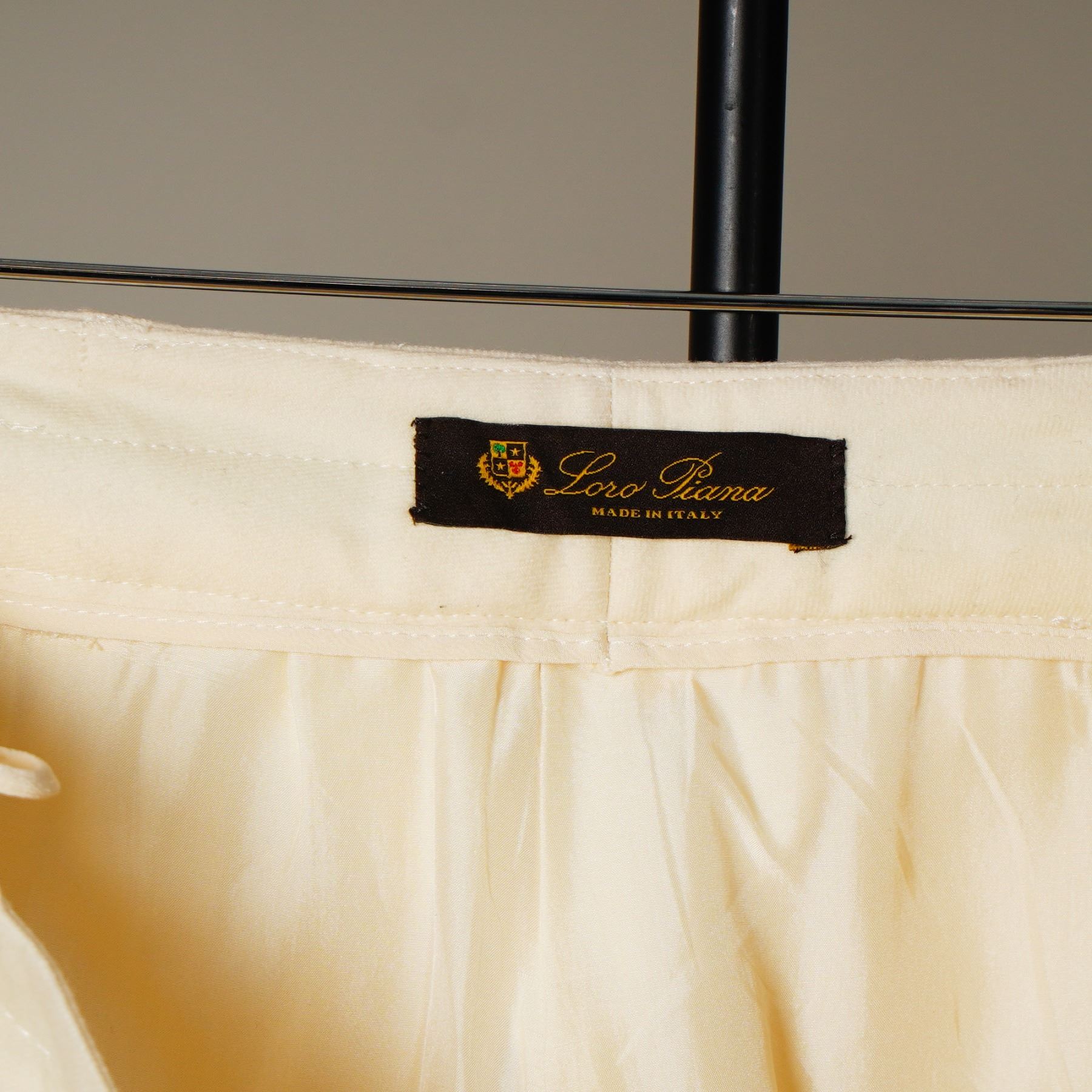 This lot comprises three pairs of luxury Italian-made trousers from Luciano Barbera, Loro Piana, and OGGI Miami Beach. The Luciano Barbera trousers are crafted from a brown taupe silk and wool blend with a textured slubbed weave, featuring a high-waisted silhouette, single-pleat front, dual-button waistband, and a single rear button-through welt pocket. Size 8. The Loro Piana trousers are off-white cream wool pants with a straight-leg cut, rear welt pockets, and belt loops. Size 8. The OGGI Miami Beach trousers are off-white cream wool-blend suiting pants featuring a straight-leg with cuffed hems, rear welt pockets with button closures, and belt loops. Size 6. All three garments feature interior designer labels and are marked as made in Italy.