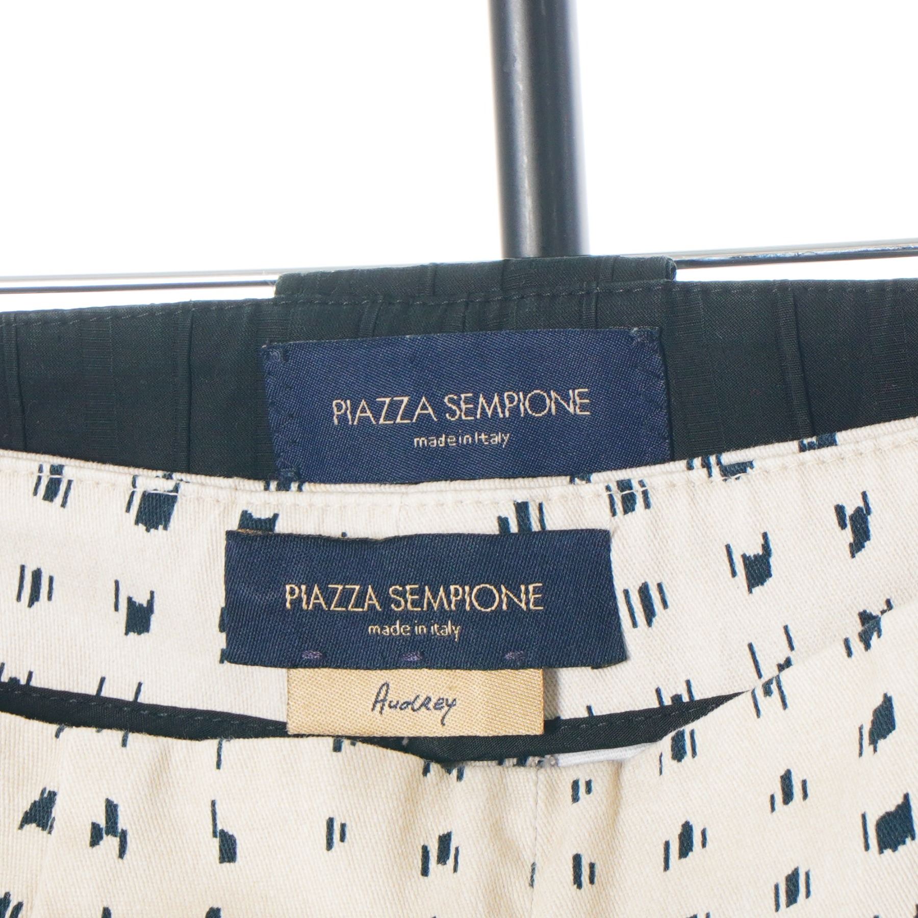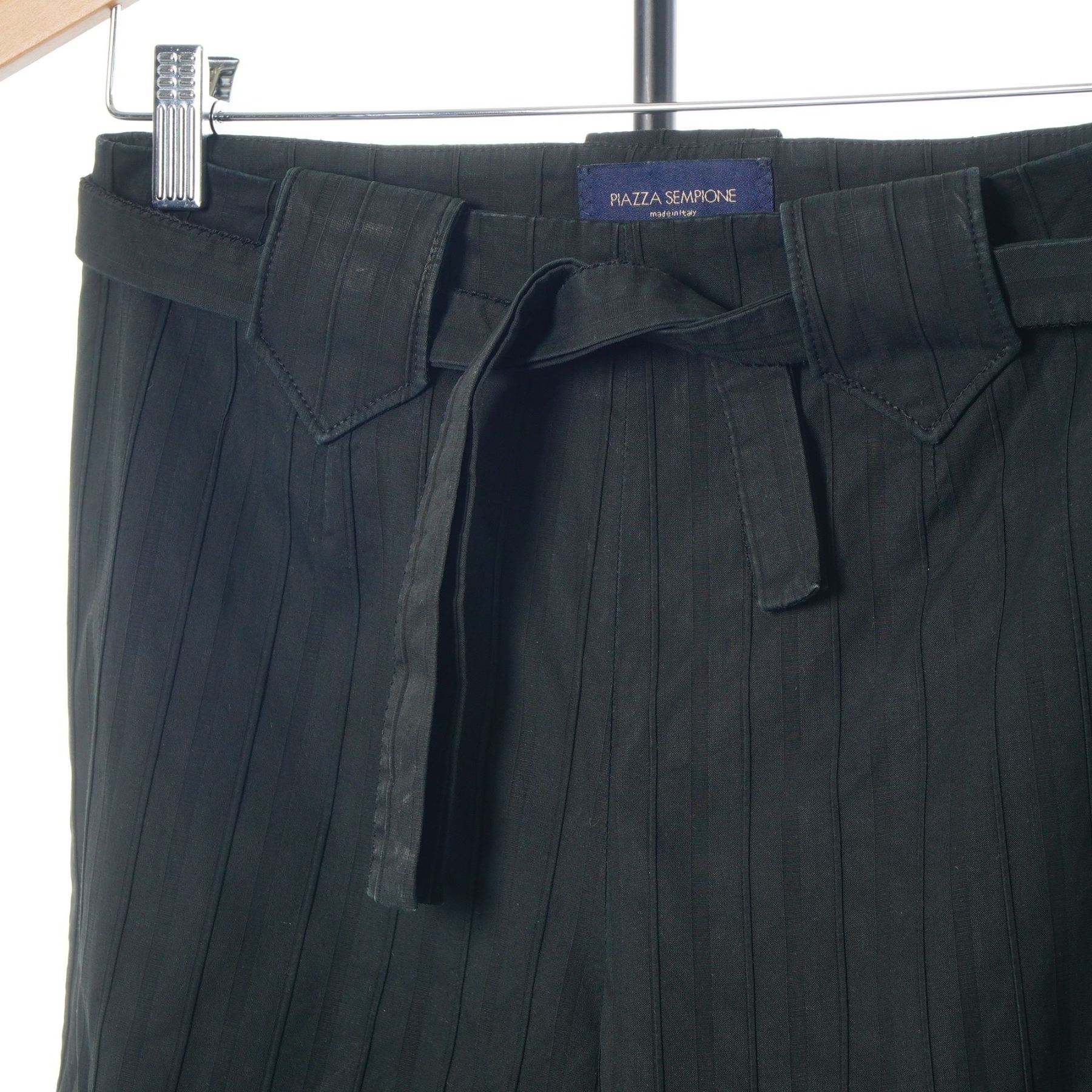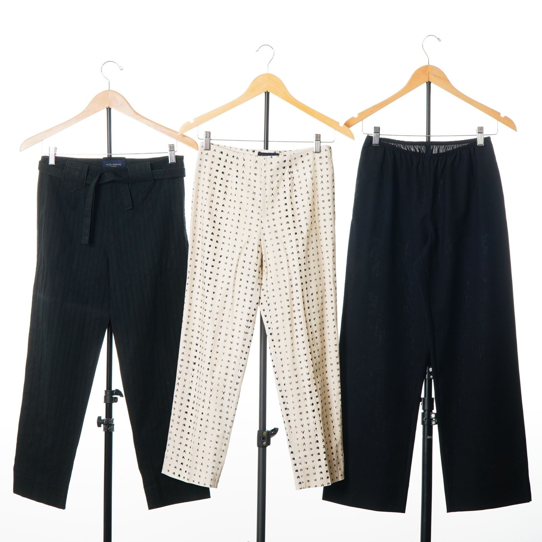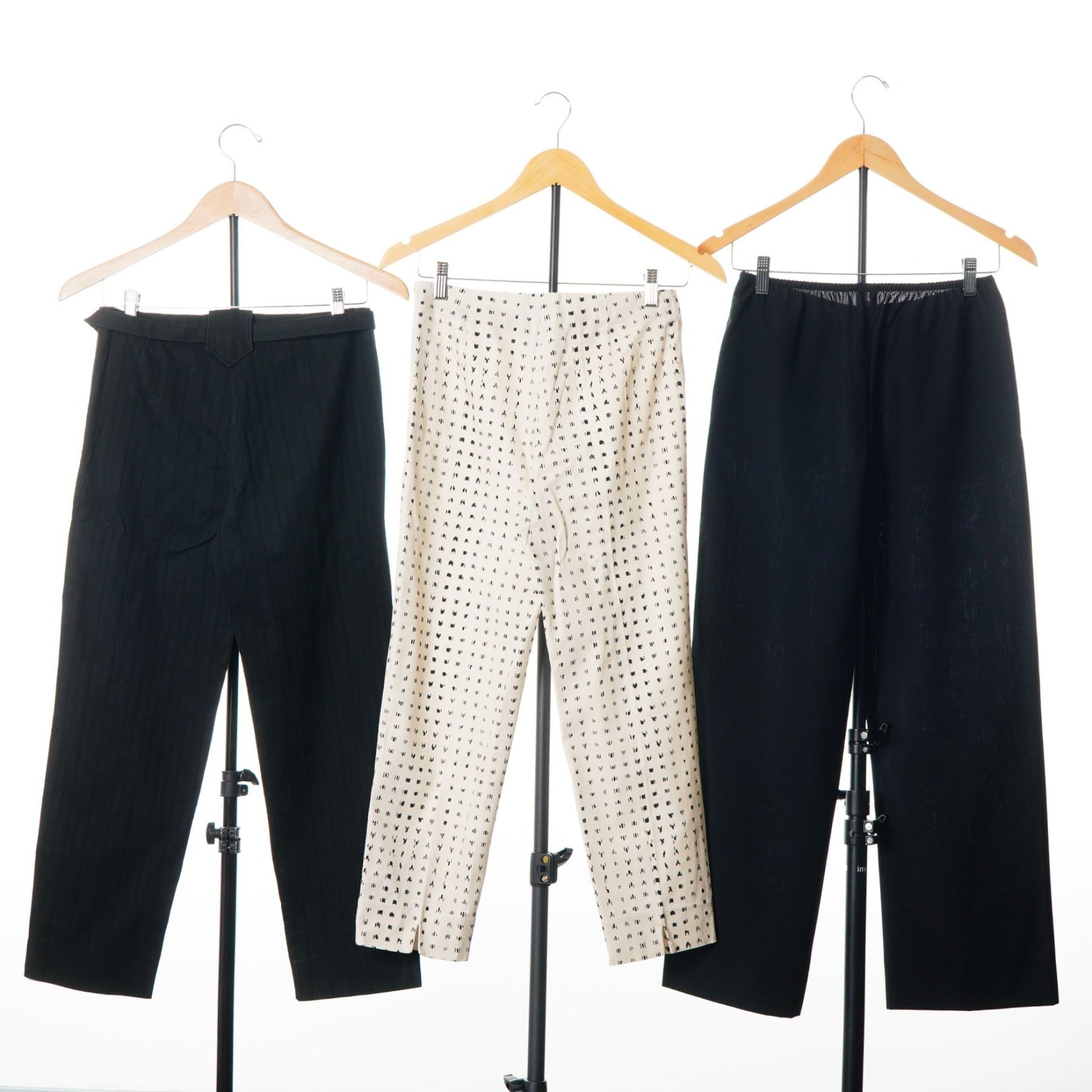 This 3pc pants collection features two pairs of Piazza Sempione trousers and one unmarked Italian pair. The first pair is a black high-waisted trouser by Piazza Sempione featuring a subtle tone-on-tone vertical stripe pattern, distinctive large pointed belt loops, and a matching self-tie fabric belt. 28 inch waist. The second pair is the Audrey model by Piazza Sempione, characterized by a cream and black geometric dash pattern, a slim-leg silhouette, side zip closure, and small zippers at the leg openings. 26 inch waist. The third pair is a black wide-leg trouser with an elasticized waistband; while categorized as an unmarked Italian pair, the interior features a white production label stating Produced by Gucci. 26 inch waist.