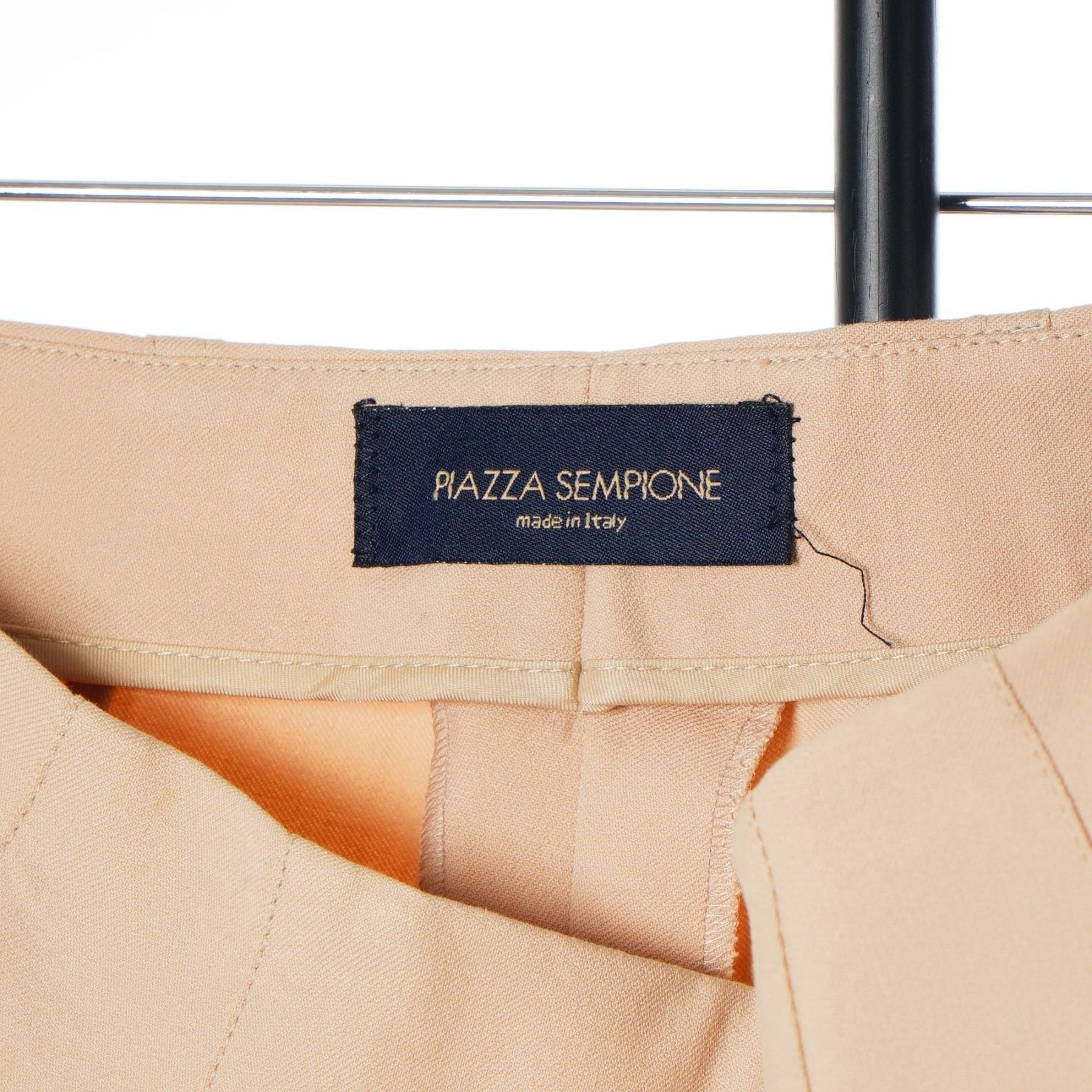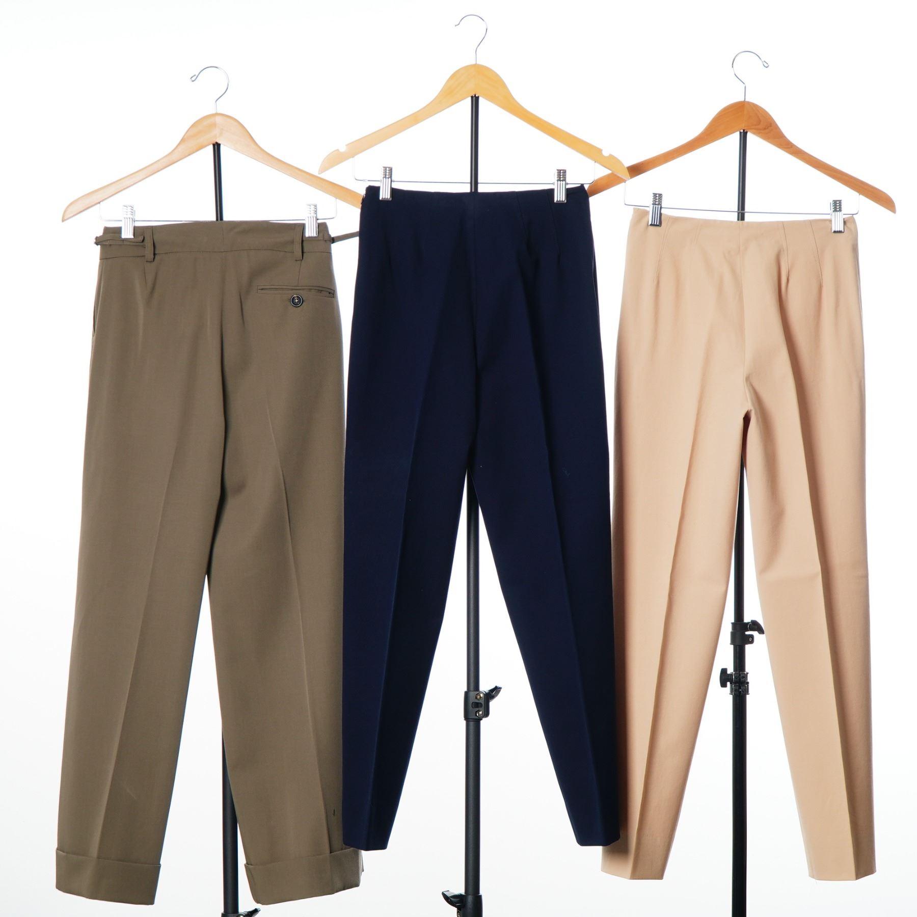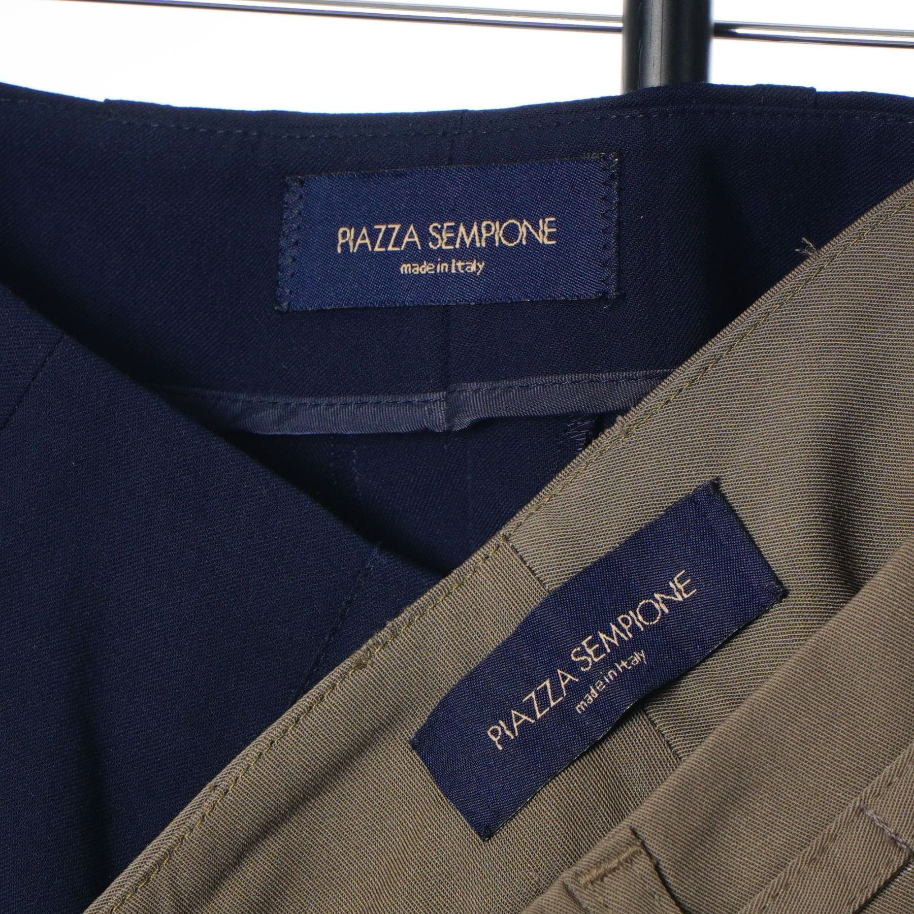 Three pairs of women's trousers by Piazza Sempione. This lot includes three Italian-made garments. The first pair is olive green and features a pleated front, cuffed hem, and a side-adjuster buckle at the waistband, with a single button-through welt pocket on the reverse. The second pair is navy blue with a flat front and tapered leg. The third pair is beige with a flat front and tapered leg. Each pair retains its original designer label at the interior waistband.
