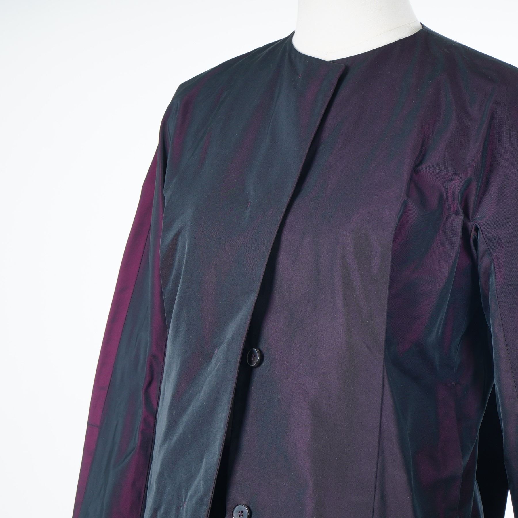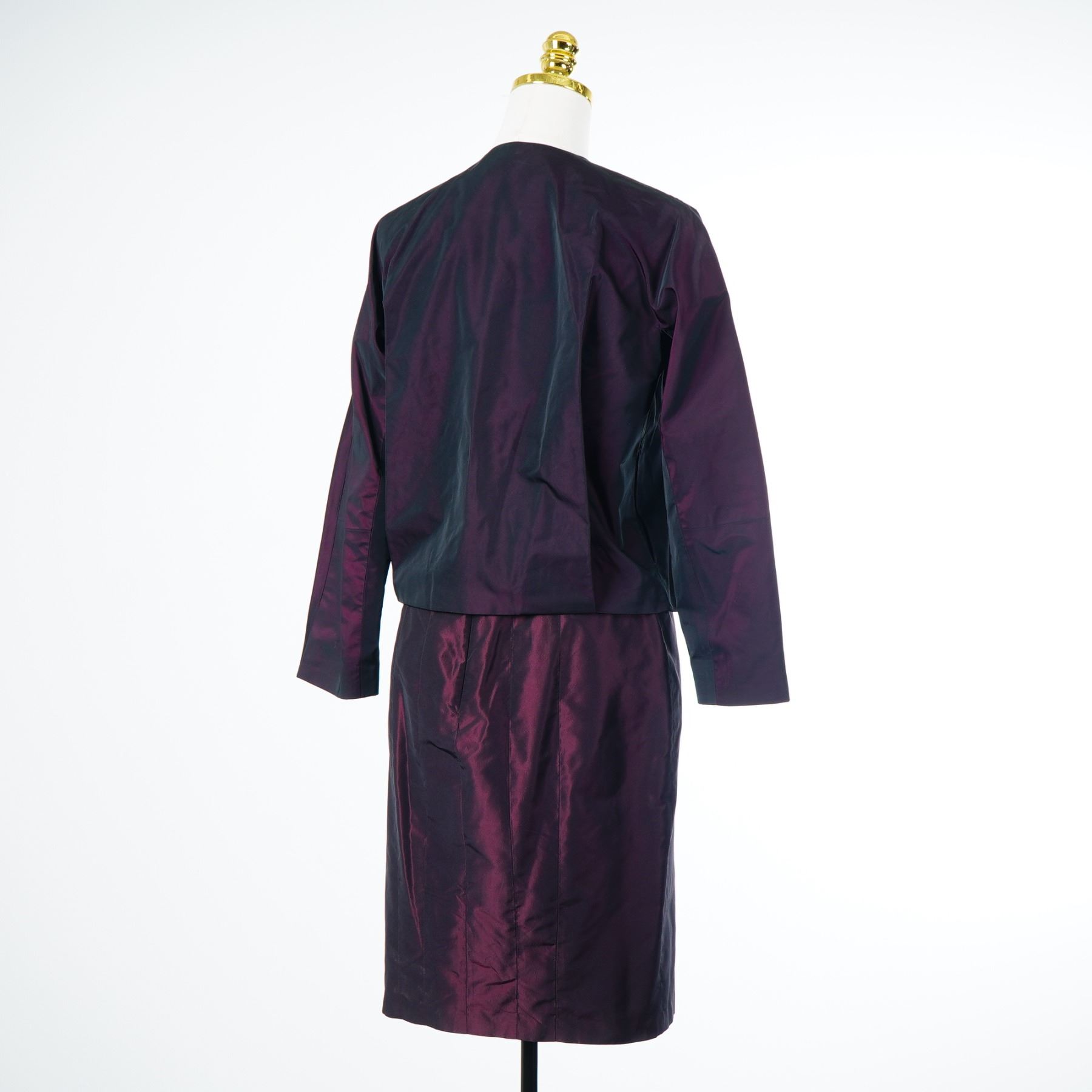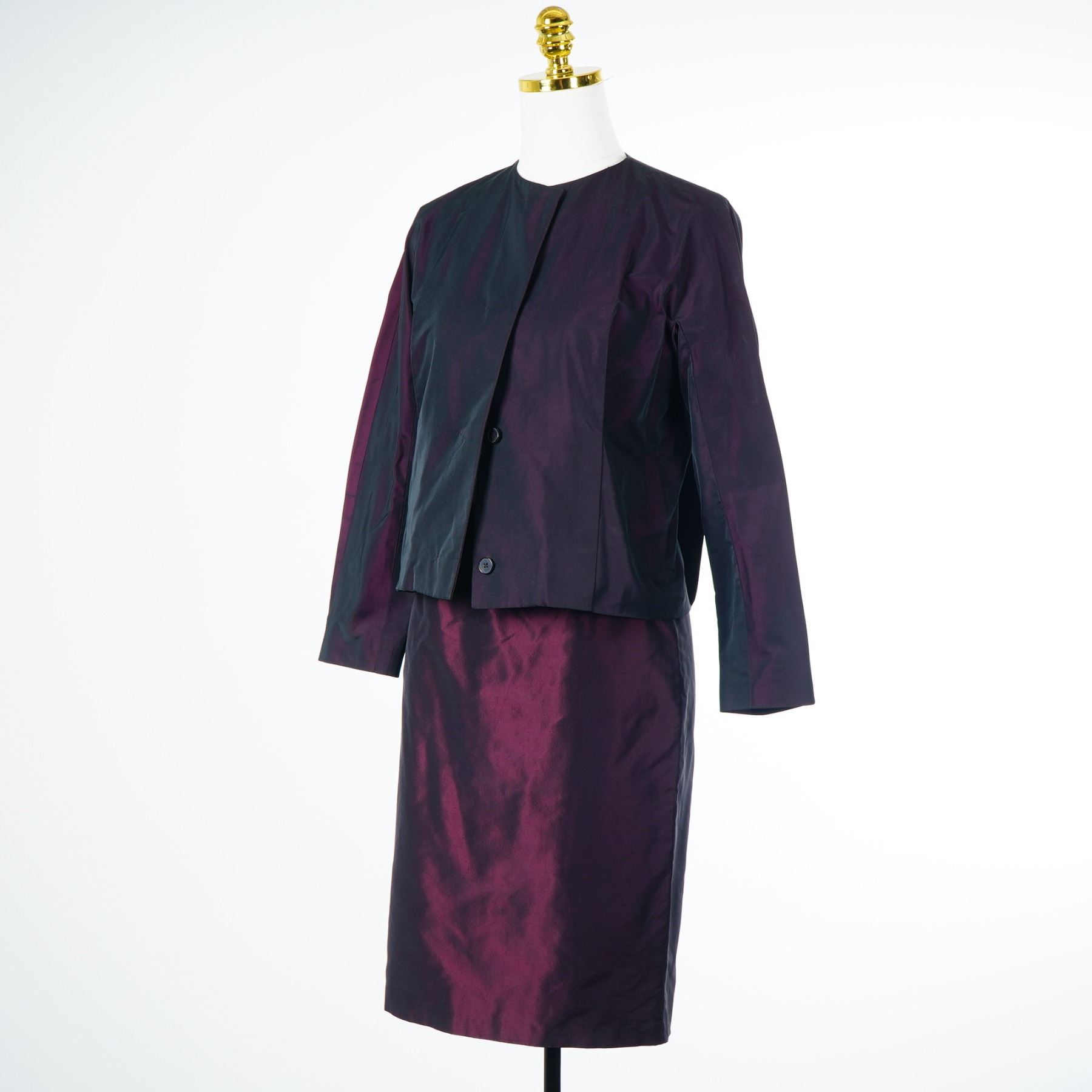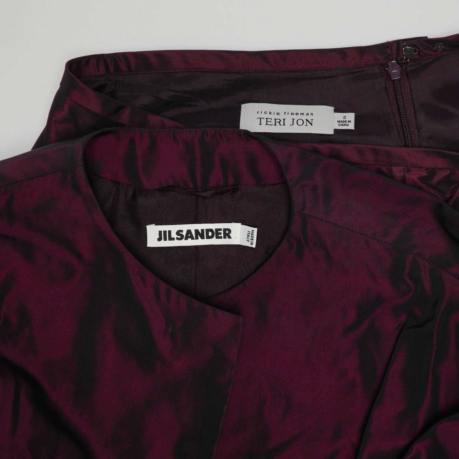 This matched two-piece ensemble consists of a Jil Sander shirt and a Rickie Freeman for Teri Jon skirt, both rendered in a coordinated iridescent plum taffeta-style fabric. The Jil Sander top is a collarless, short-length shirt featuring long sleeves and a concealed fly-front button closure. The interior neck bears a Jil Sander woven label and a secondary tag indicating the garment was made in Italy. The Rickie Freeman for Teri Jon skirt is a straight pencil-style garment with a rear zipper closure. It contains a woven label at the interior waistband and a secondary tag noting it was made in China. The fabric for both pieces is a lustrous material that shifts in color between deep purple, plum, and dark blue or charcoal depending on the light. Jil Sander shirt size: 36; Rickie Freeman for Teri Jon skirt size: 2.
