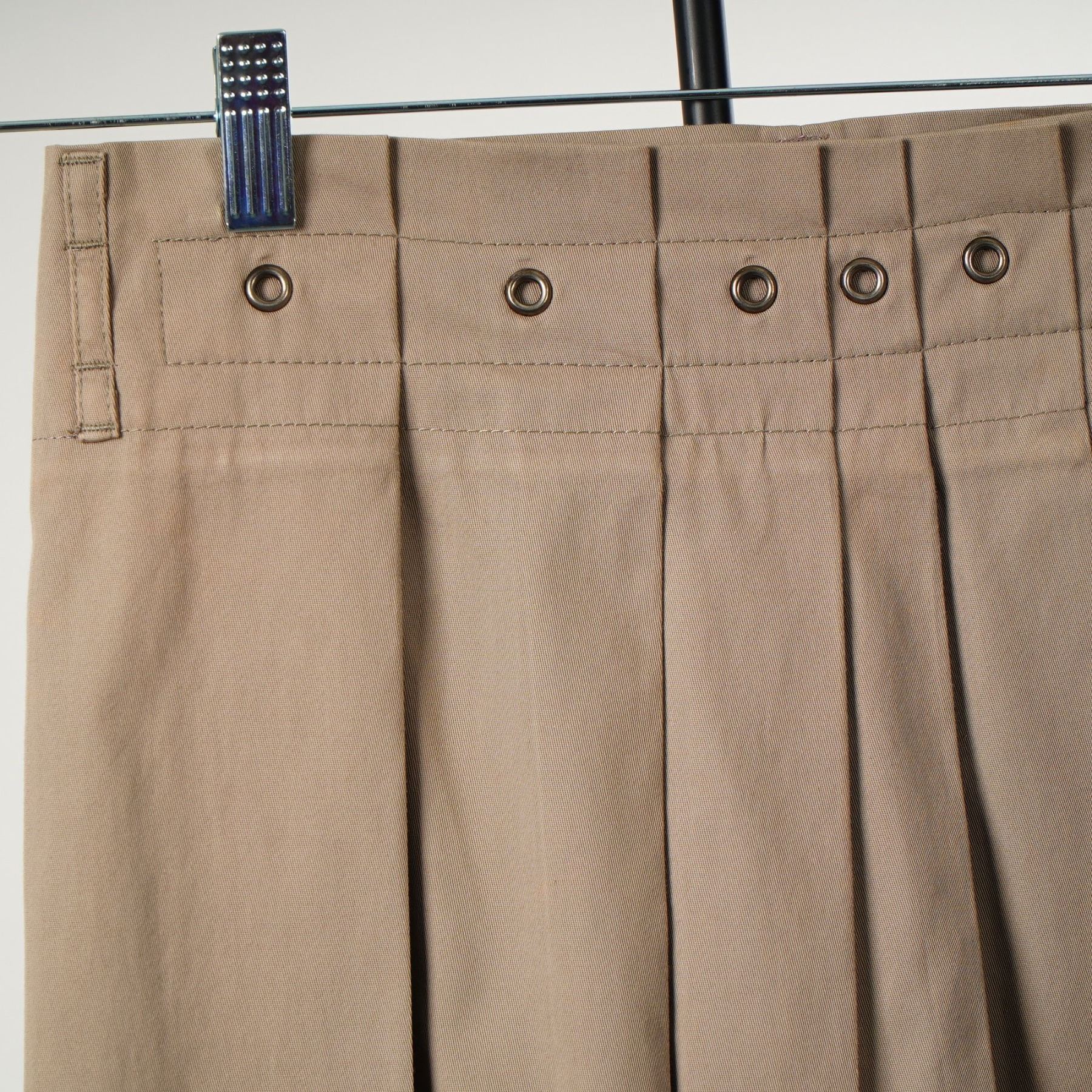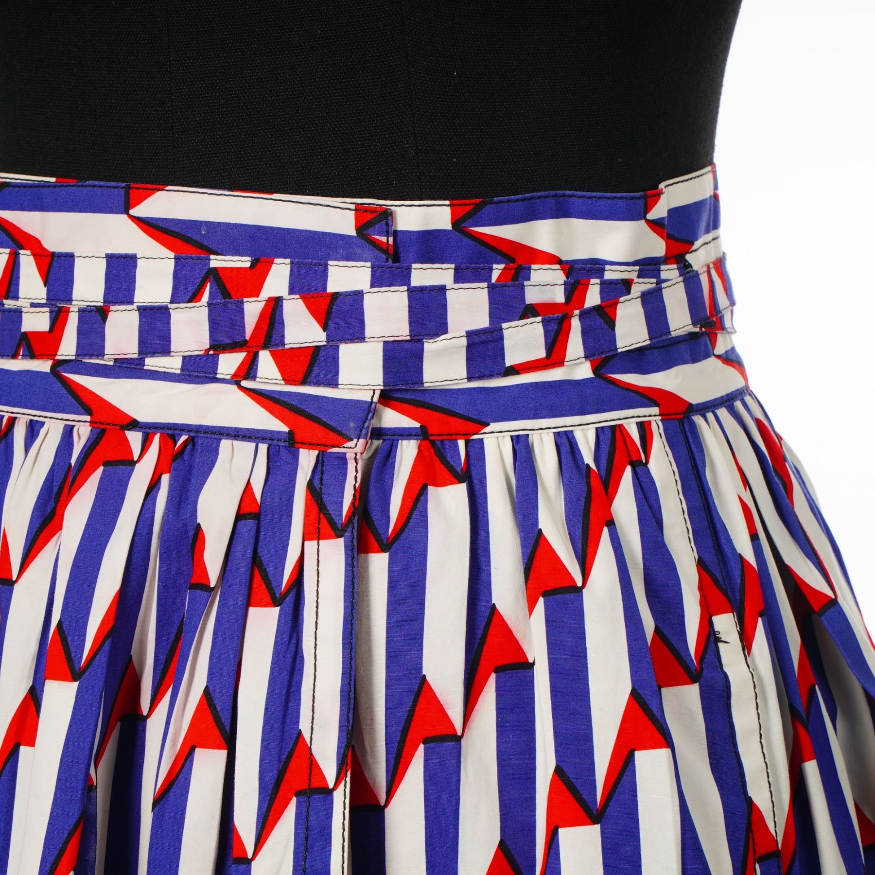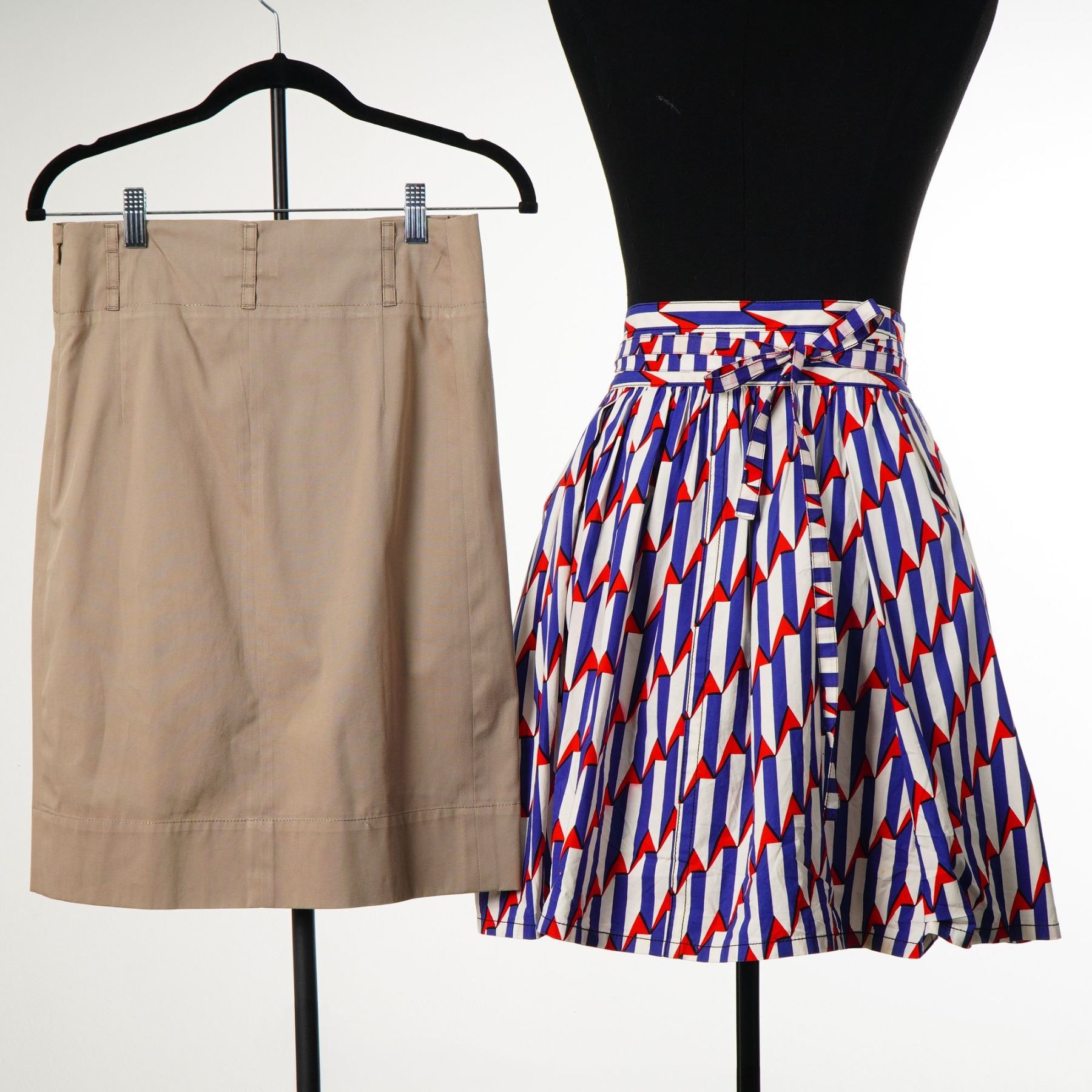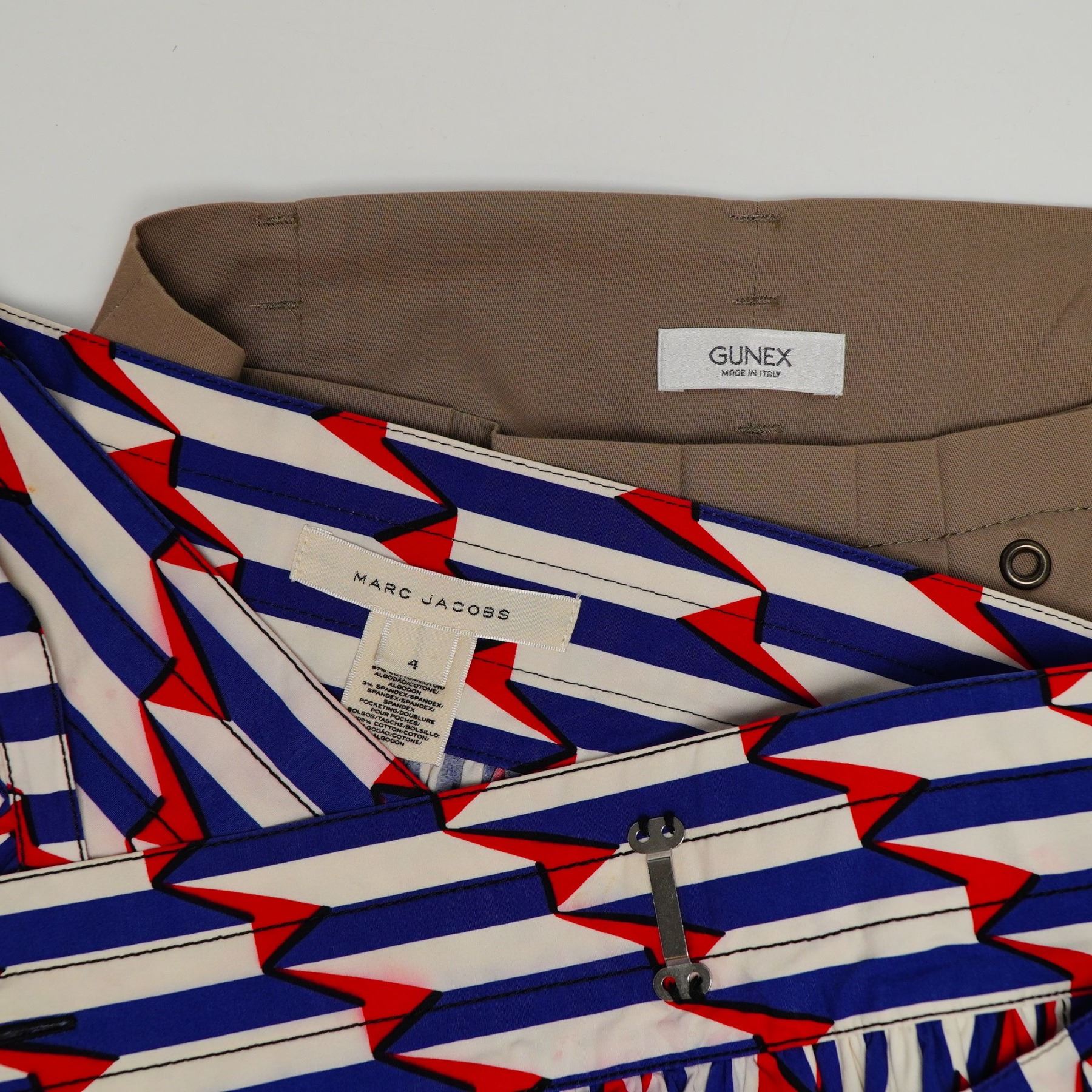 This lot features two designer skirts. The first is a Marc Jacobs arrow print wrap-style midi skirt in a graphic red, blue, and white geometric pattern. Constructed from a cotton blend consisting of 97 percent cotton and 3 percent spandex, the garment features a full gathered silhouette, a high-waisted fit, and a coordinating wide fabric belt that ties at the back. It includes a side seam pocket and a metal hook-and-eye closure. The interior woven label is marked Marc Jacobs with an attached size 4 tag. The second item is a Gunex pleated knee-length skirt in a tan khaki hue. Made in Italy, this garment is crafted from a cotton-blend twill and features a wide topstitched waistband with belt loops and decorative metal grommets at the head of each knife pleat. It is finished with a concealed side zipper. The interior fabric label is marked Gunex Made in Italy. Per user-provided facts, the Gunex skirt is a size 6.