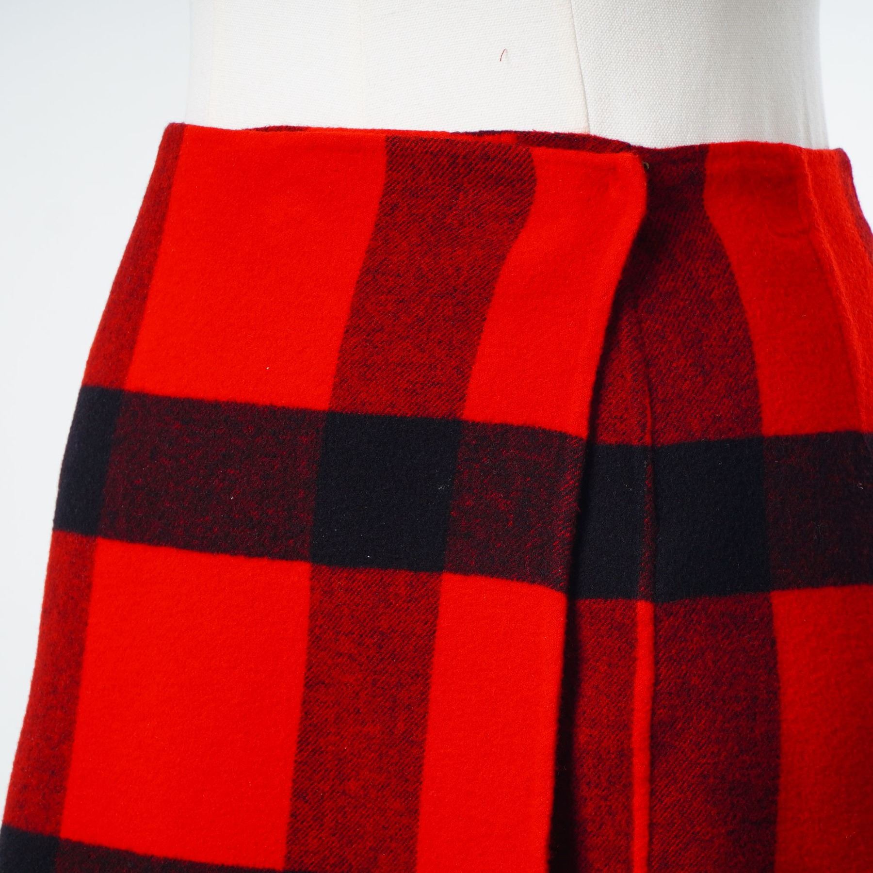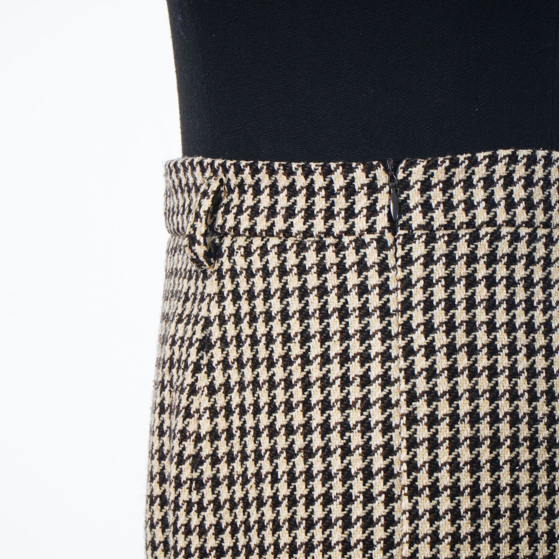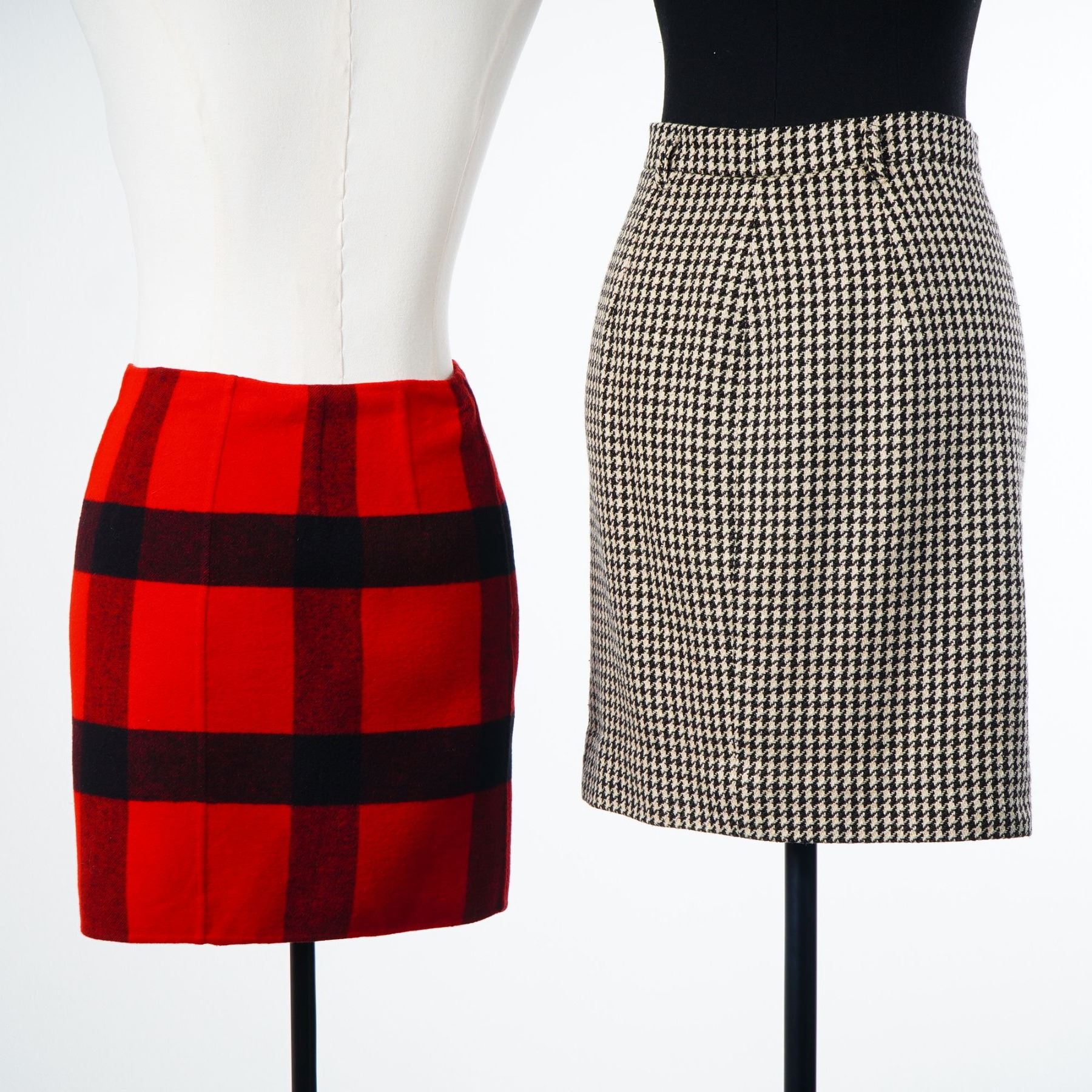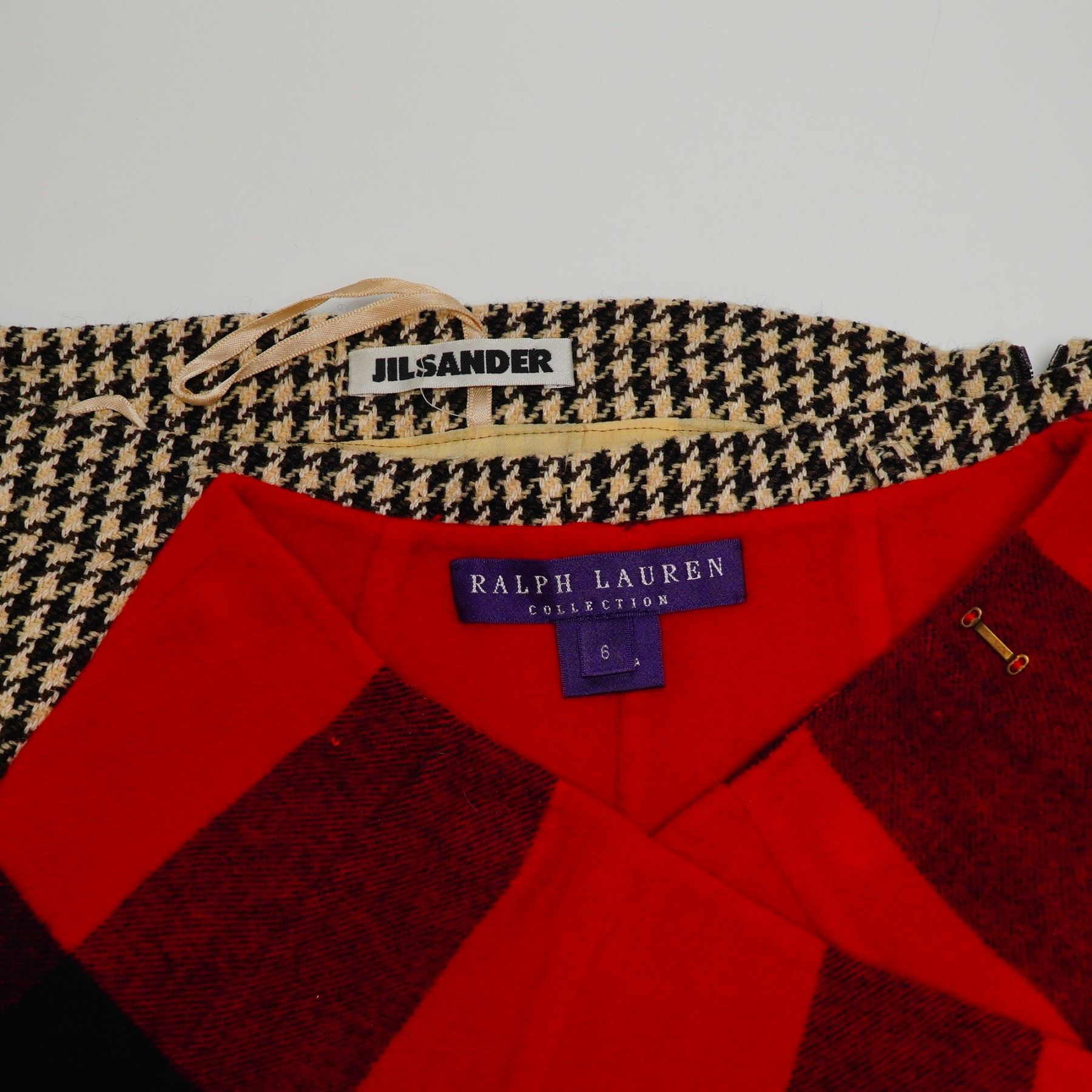 Two designer skirts including a Ralph Lauren Collection buffalo check wrap skirt and a Jil Sander houndstooth pencil skirt. The Ralph Lauren Collection skirt is a wrap-style mini skirt featuring a red and black buffalo check pattern, constructed from a heavy wool or wool-blend flannel. It is finished with a purple woven label, size 6. The Jil Sander skirt is a knee-length pencil skirt in a black and cream houndstooth wool tweed. This garment features belt loops and a side-seam zipper closure. Size 38.