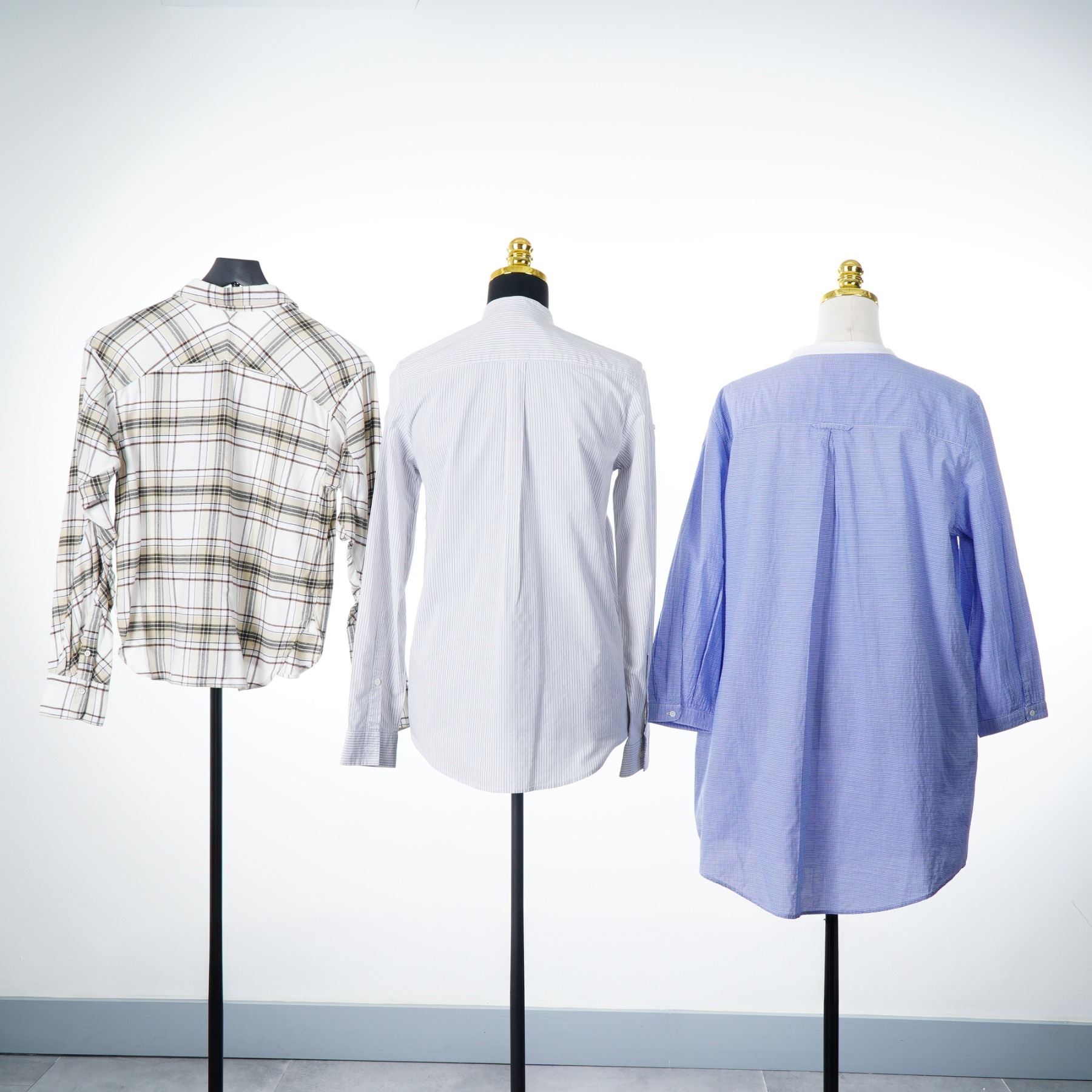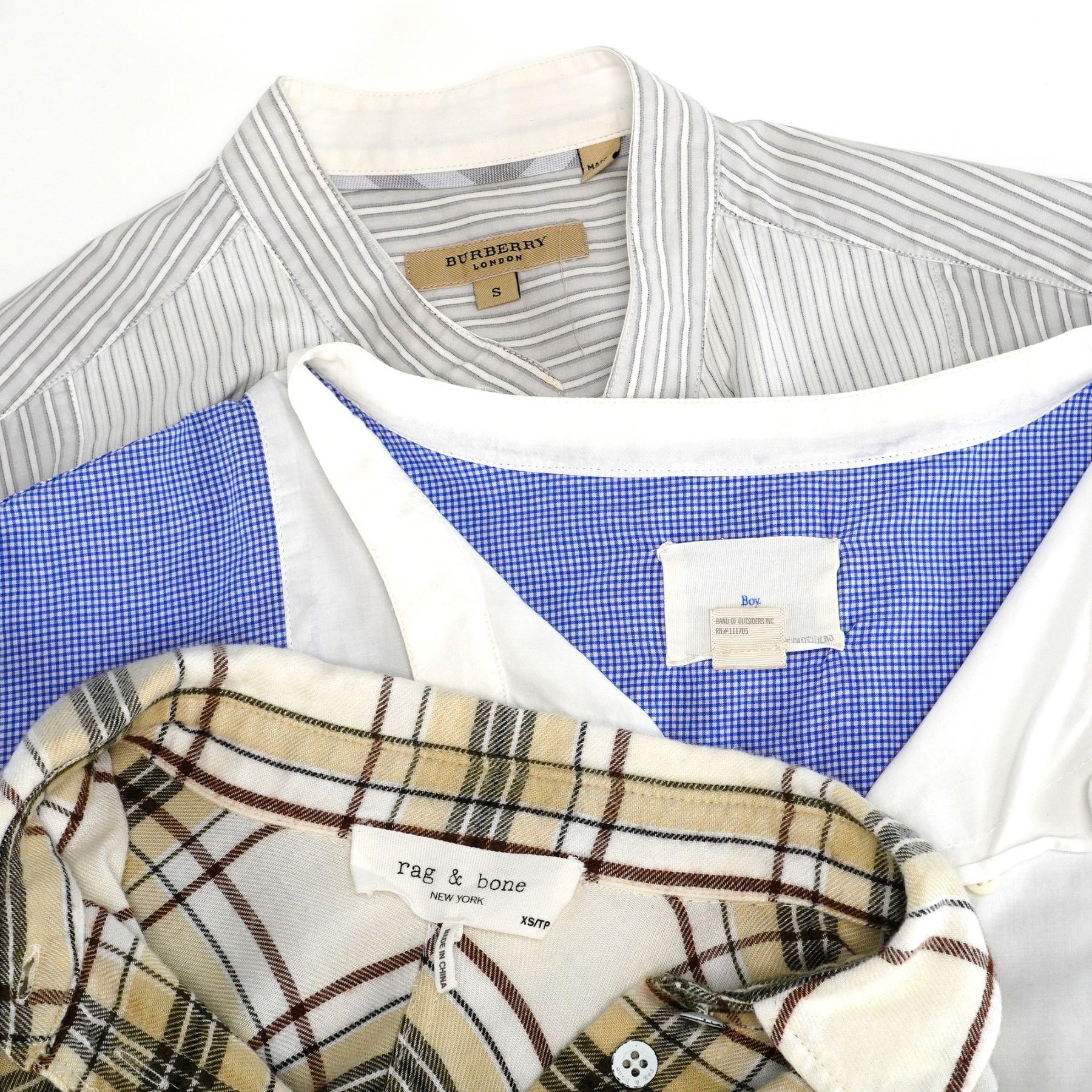 This collection includes three designer long-sleeved blouses from Burberry London, Band of Outsiders, and rag & bone. The Burberry London shirt, size S, is a button-down featuring grey and white vertical stripes, a white interior collar band, and signature Burberry check trim at the neck. The second garment is a Boy. by Band of Outsiders pajama shirt model in a blue and white gingham check, designed with contrast white panels at the shoulders and collar. Size 4. The interior label is marked Boy. BAND OF OUTSIDERS INC. and RN# 111705. The third garment is a rag & bone New York flannel button-down shirt featuring a multi-tonal plaid pattern in cream, tan, and dark brown with white buttons. Size XS.