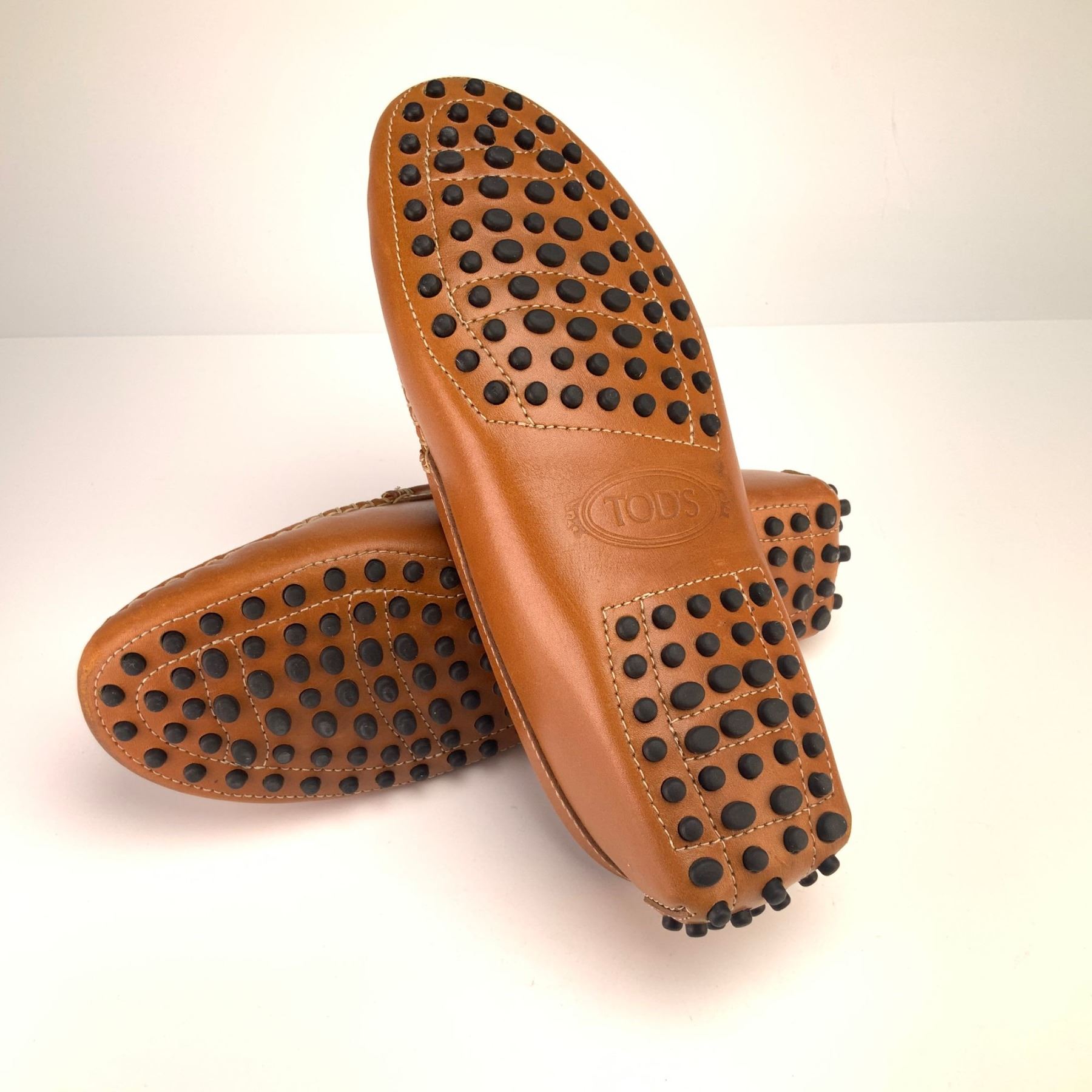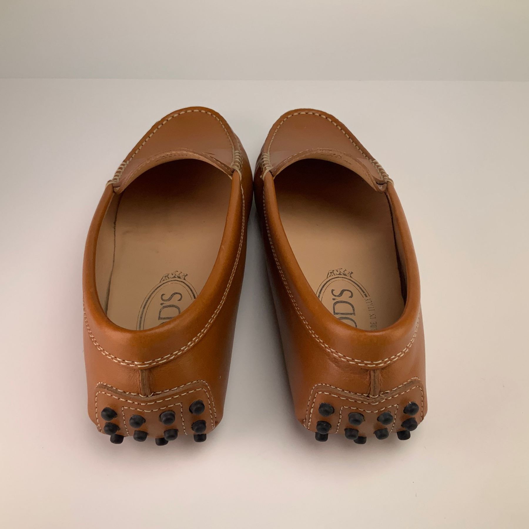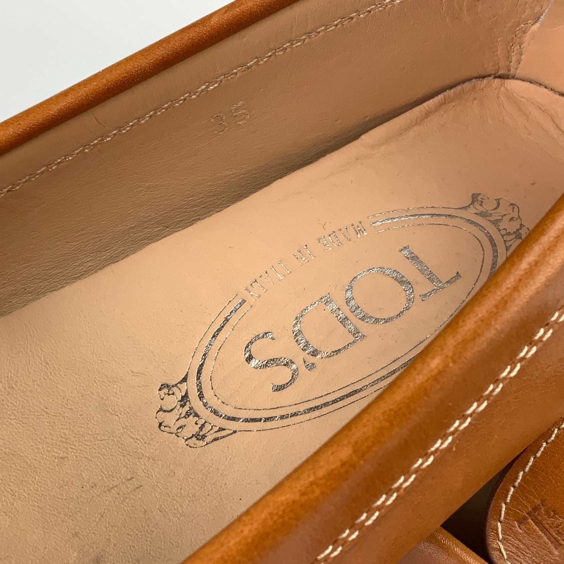 A pair of Tod's Gommino driving shoes in tan leather. This pair of Italian shoes features a penny loafer silhouette with cream-colored contrast stitching. The construction includes a smooth leather upper and a full leather lining. The signature Gommino outsole is composed of integrated rubber pebbles that extend onto the heel. The insole is stamped with a silver-tone foil mark featuring the Tod's logo within an oval and the words MADE IN ITALY. The outsole also bears an embossed Tod's oval logo. The interior sidewall is embossed with the size 35.