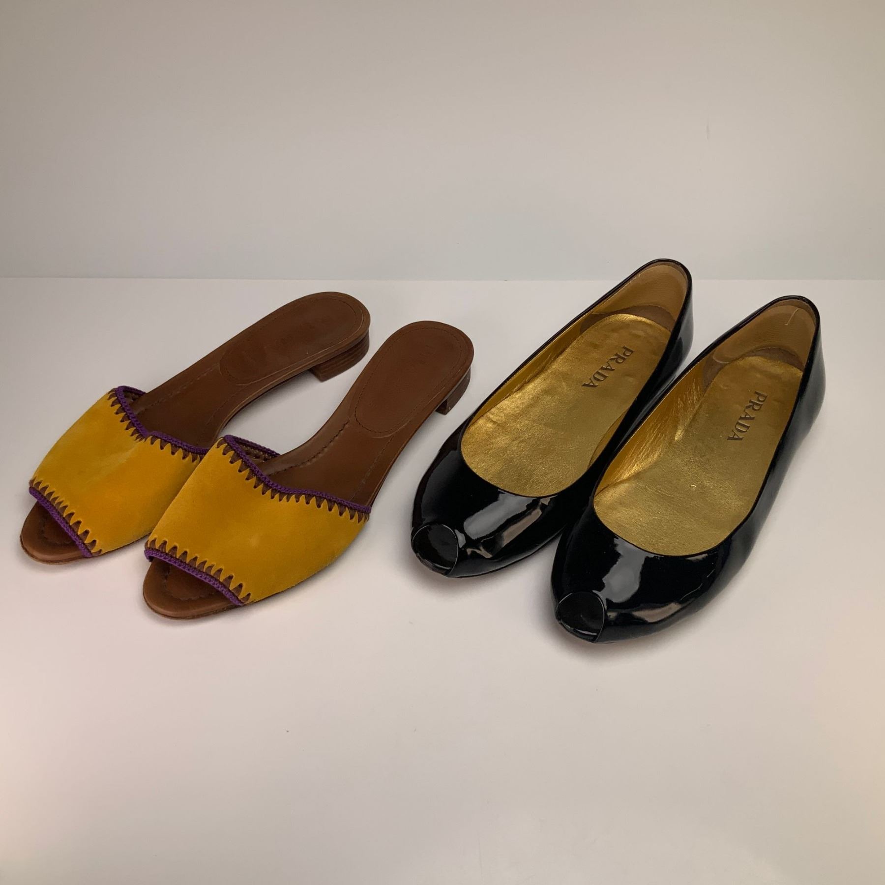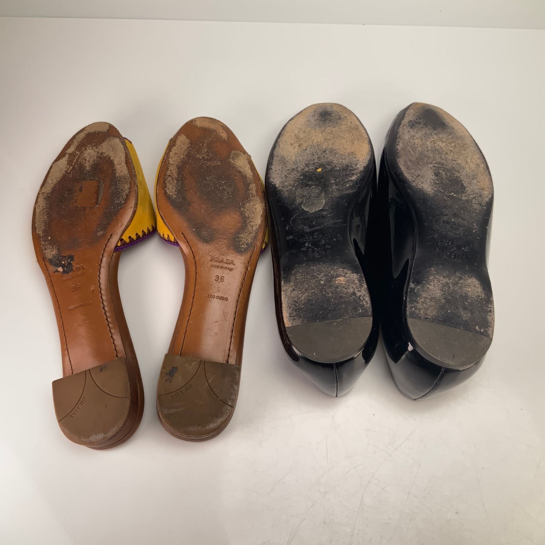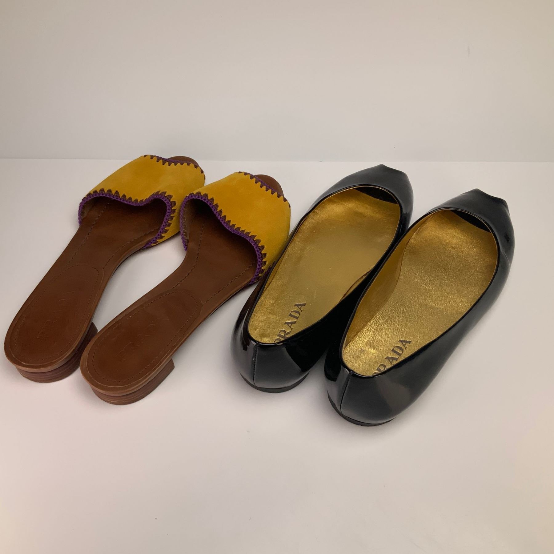 This lot features two pairs of Prada footwear and two coordinating dust bags. The first pair is a set of yellow suede flat slide sandals. These shoes feature a single wide strap with decorative scalloped edges finished in purple embroidery. The insoles are crafted from brown leather, and the leather outsoles are stamped with Prada, Made in Italy, 36, and Vero Cuoio. The second pair is a set of black patent leather peep-toe ballet flats. These flats are designed with metallic gold-tone leather insoles bearing the Prada name. The outsoles are constructed of leather with integrated heel taps. Included are two white fabric drawstring dust bags featuring the blue Prada Milano logo. Size 35 1/2.