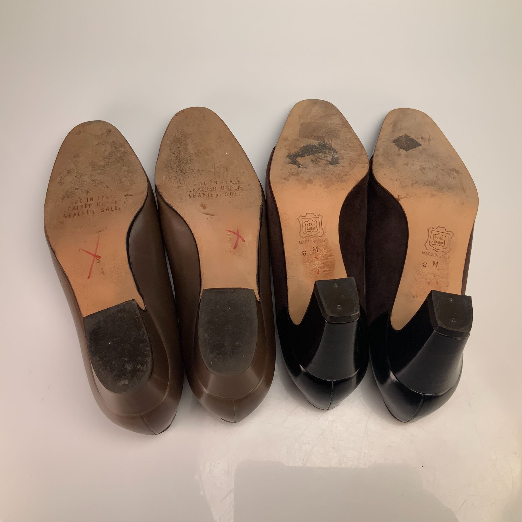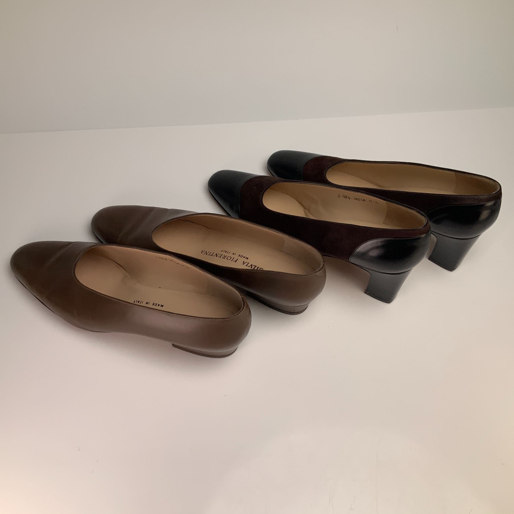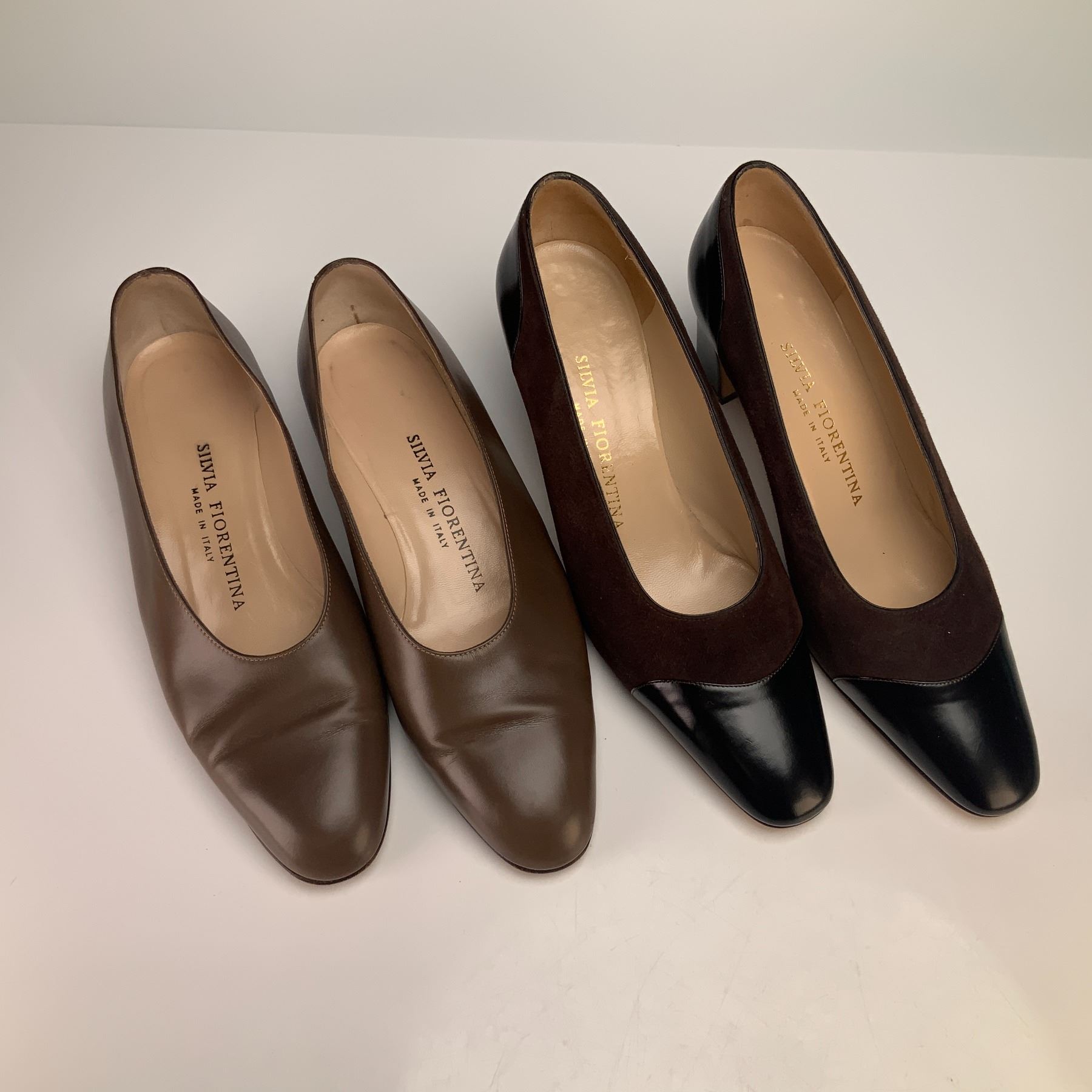 These two pairs of Silvia Fiorentina shoes include the Chiara model in brown leather and a tricolor suede and leather pump. Both pairs were made in Italy and are a women's size 6 M. The Chiara pumps feature medium brown leather uppers with a rounded toe and a low block heel. The tricolor pumps are designed with dark brown suede uppers, black leather cap-toes, and black leather heel counters on a mid-height tapered block heel. This pair features the Vero Cuoio crest on the leather outsoles.
