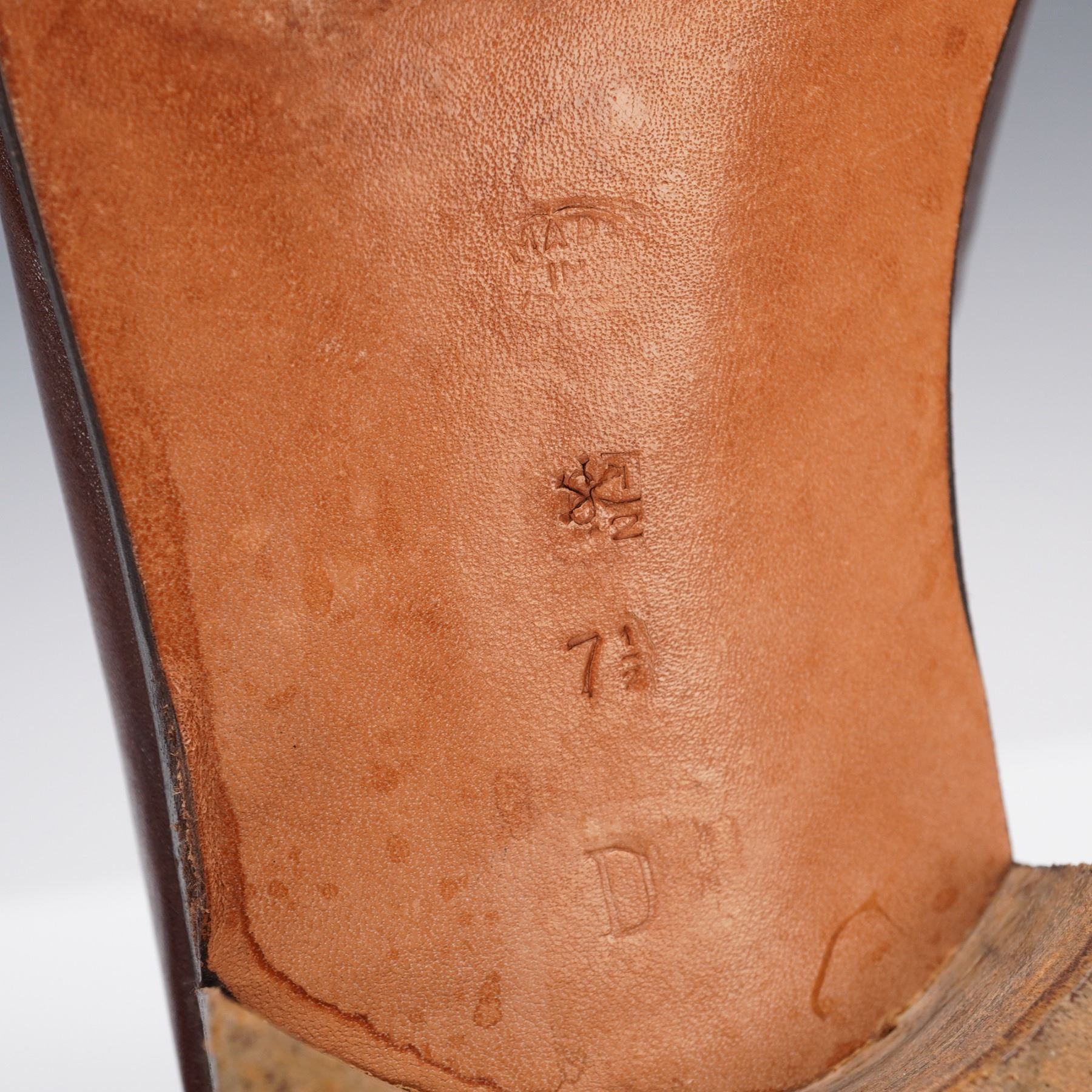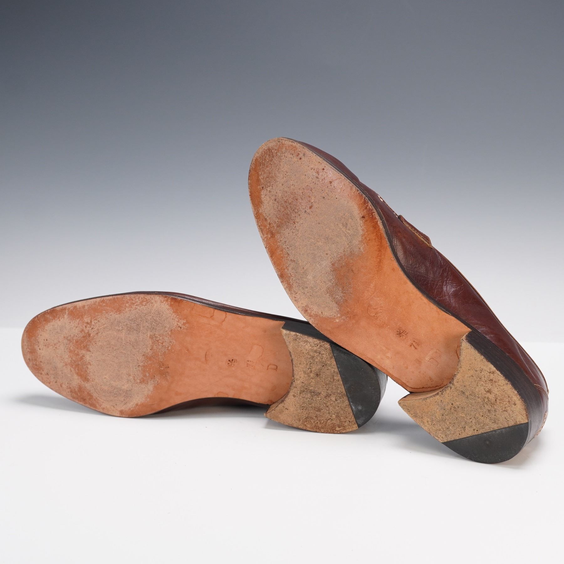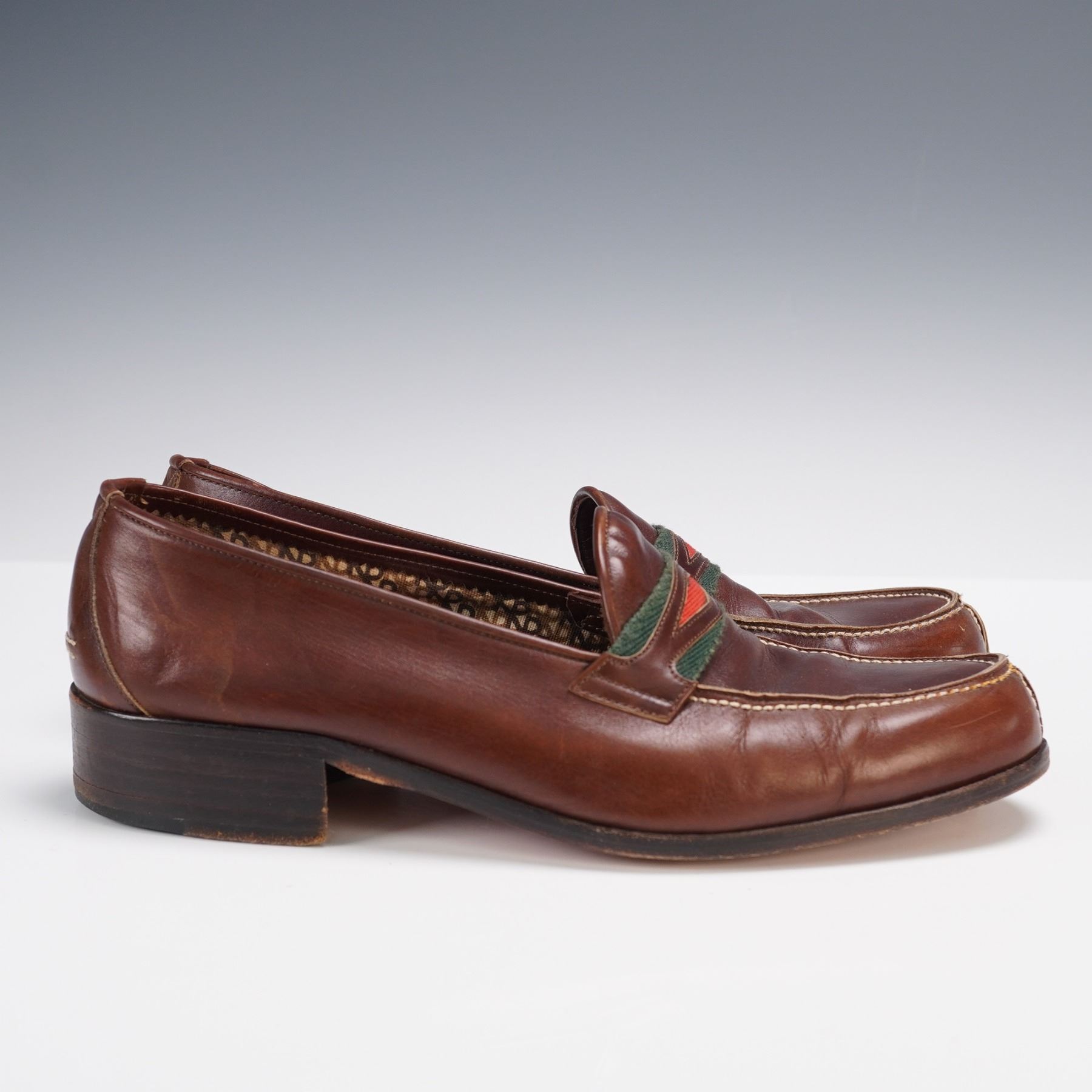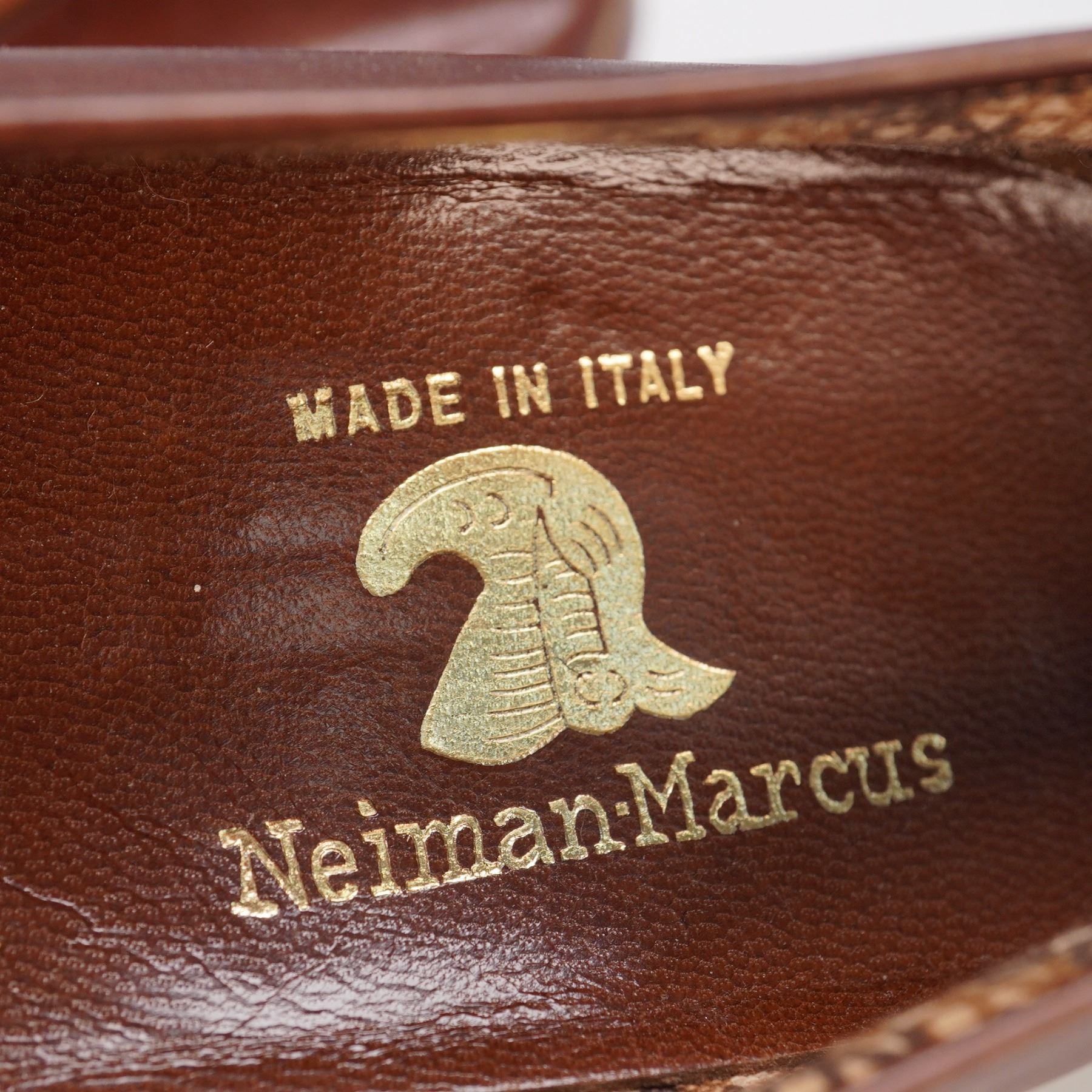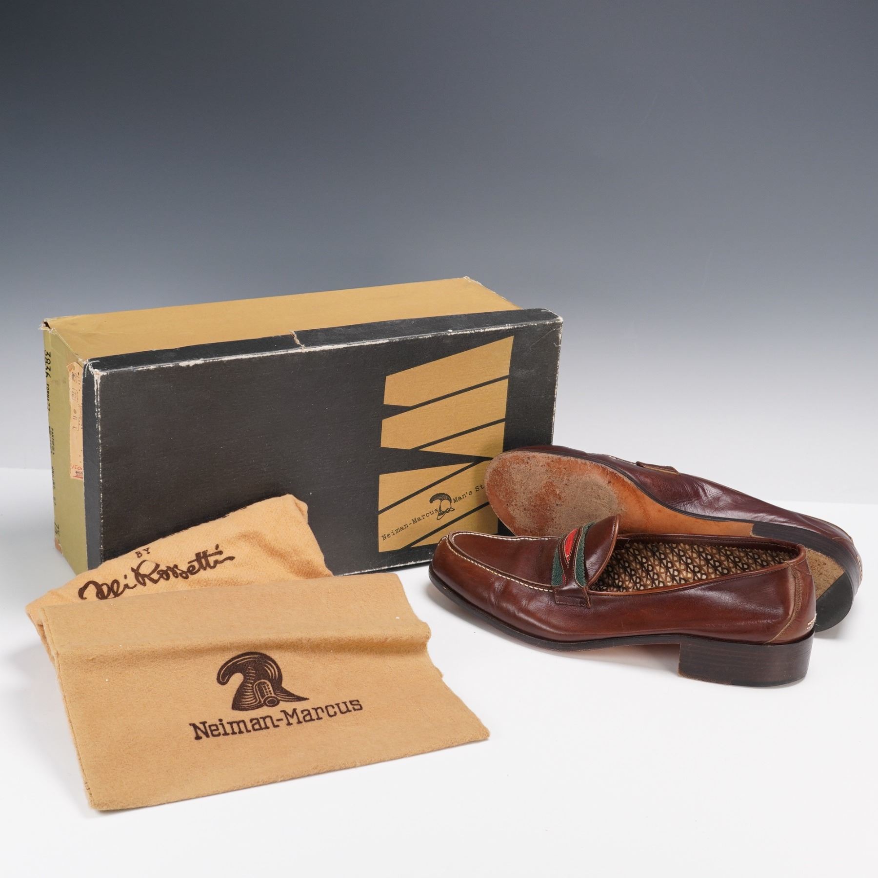 A pair of vintage Neiman Marcus by Rosetti brown leather loafers, made in Italy. These classic slip-on shoes feature a penny loafer design with a green and red web strap detail across the vamp and contrast stitching around the uppers. The interior is lined with a patterned fabric and stamped with the Neiman Marcus logo and "Made in Italy" in gold lettering. Includes the original Neiman Marcus box and two branded dust covers. Size: 7.5. Box measures 13.5"L x 7.5"W x 4.5"H.