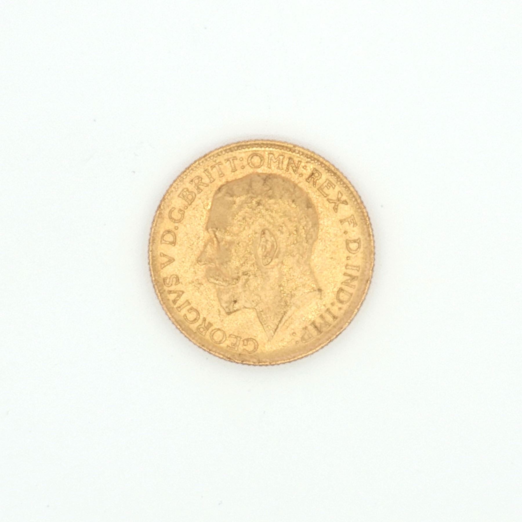 Minted by the Royal Mint. The obverse side depicts the uncrowned portrait of King George V facing left, legend around. The reverse side depicts St. George on horseback slaying the dragon right. Gold content is 22.02K (91.75% gold), tested with a Thermo Scientific Niton XL2 XRF Precious Metal Analyzer. AGW 0.1867 oz.